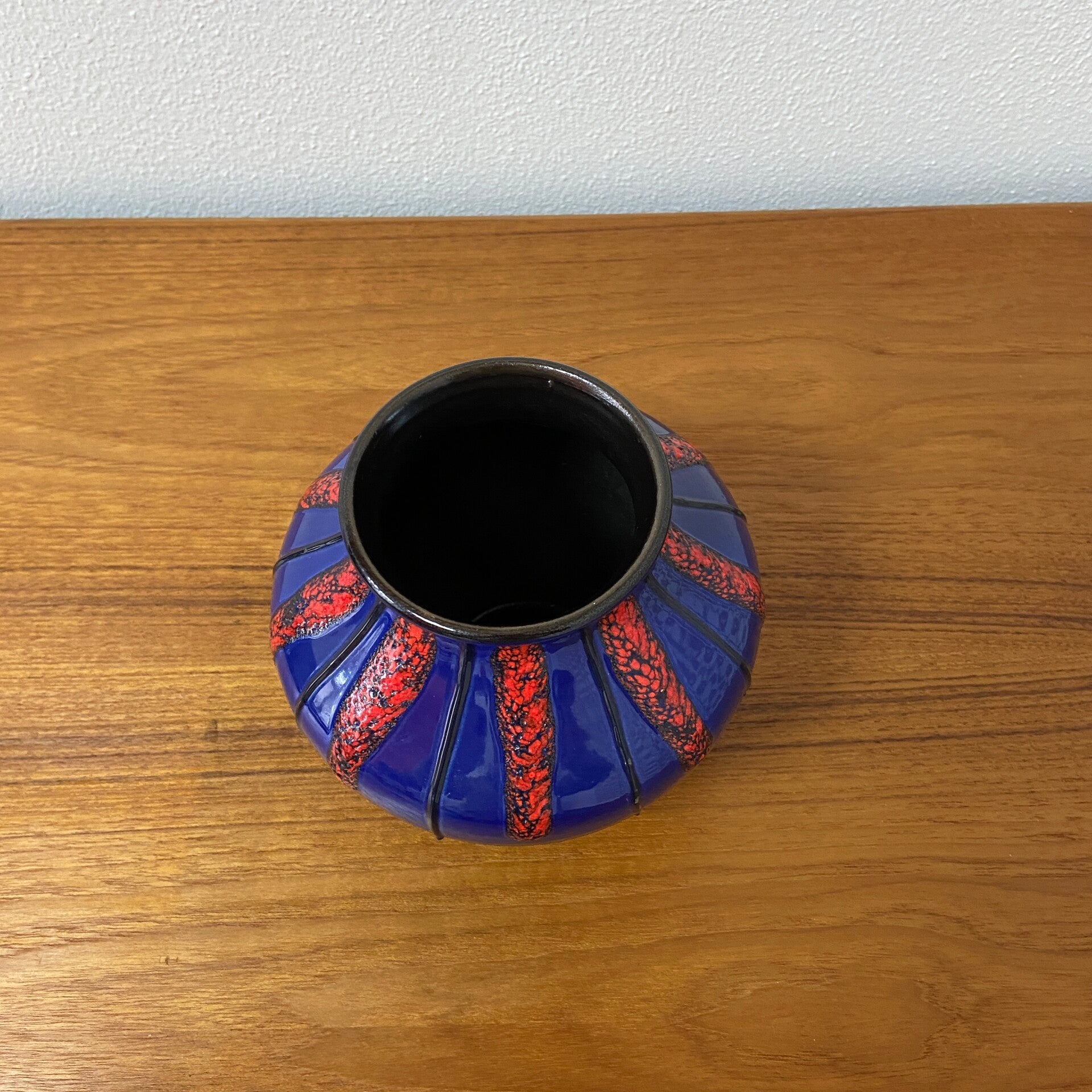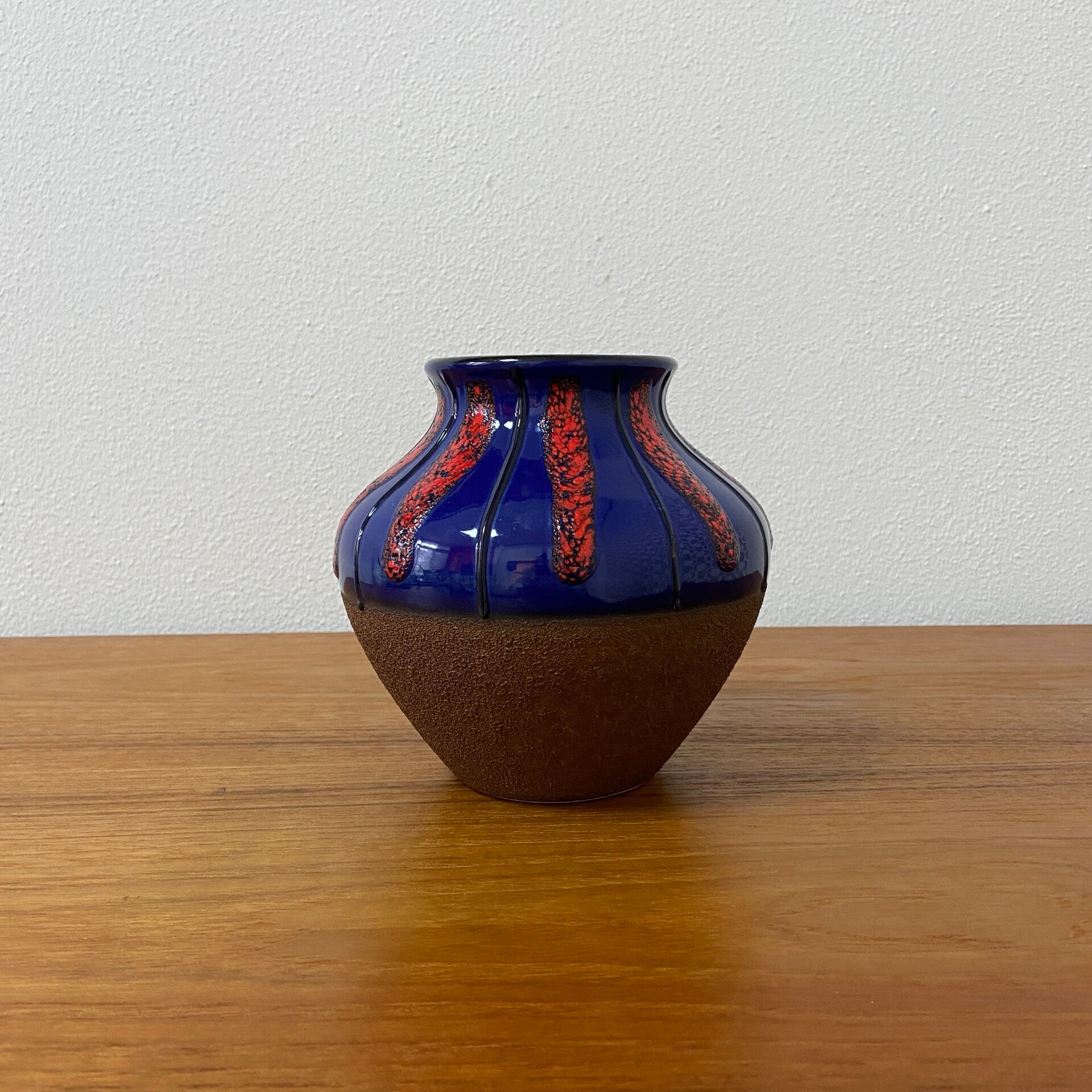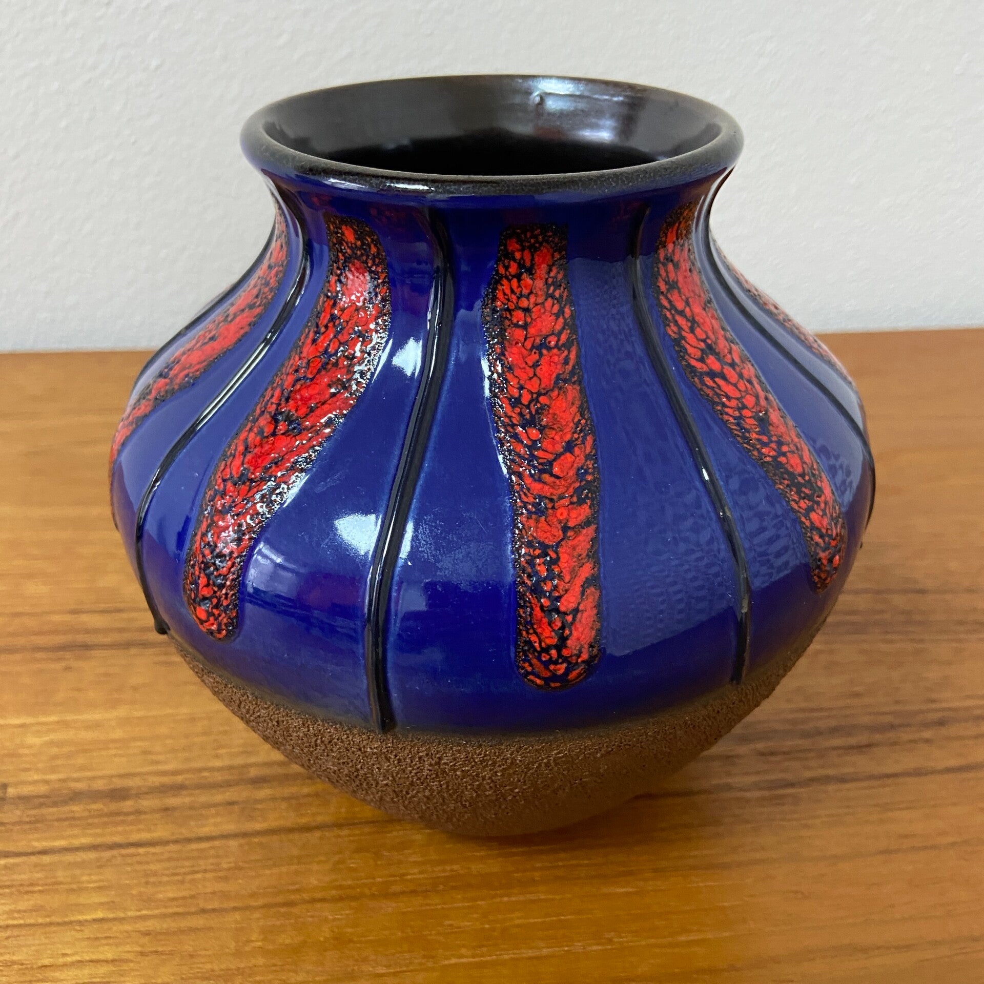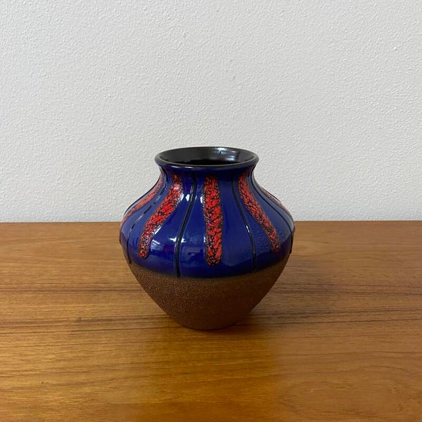 Bijzondere fat lava vaas van Dümler en Breiden, uitgevoerd in een sprekende kleurencombinatie van kobaltblauw en rood keramiek. De combinatie van het glanzende bovendeel en de mat bruine onderkant geven de vaas een interessante uitstraling.