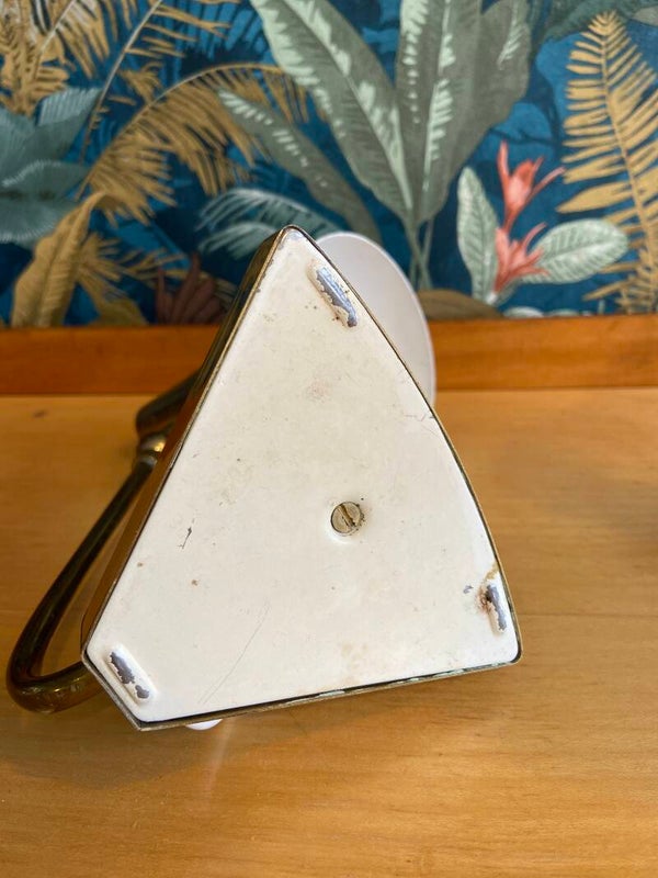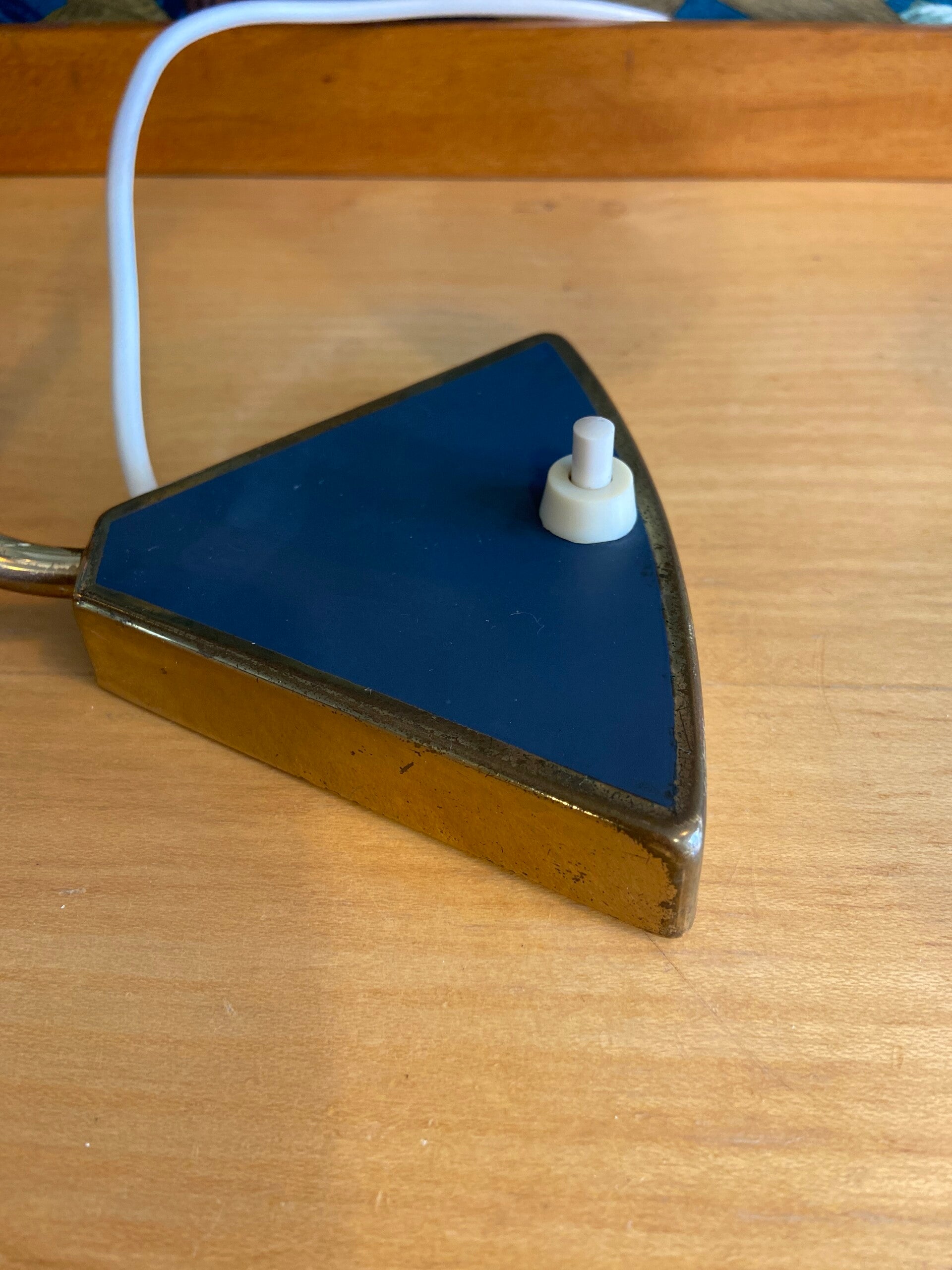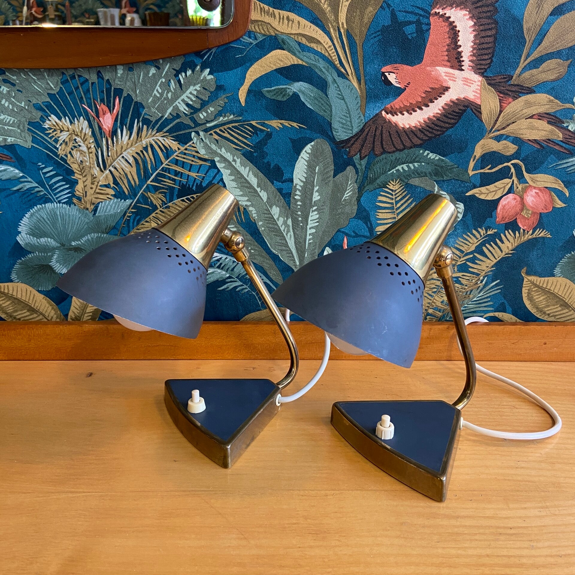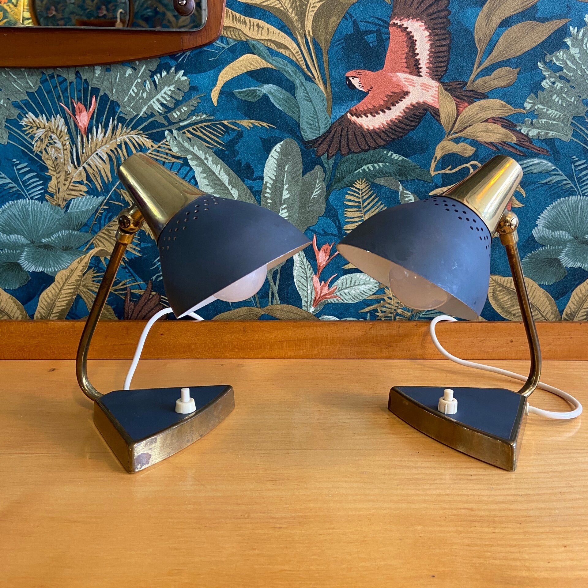 Wat zijn ze leuk deze nachtlampjes van Pfäffle Leuchten, Duitsland! Deze lampjes zijn gemaakt in de jaren ’60 en vallen op door hun bijzondere vormgeving en kleurencombinatie. De lampjes hebben een driehoekige voet met een geïntegreerde schakelaar, een messing frame en een verstelbare geperforeerde kegelvormige kap. Het nachtblauw van de kap en het messing vormen een perfecte combinatie. De staat van de lampjes is goed met hier en daar wat patina op de voet en gebruikssporen die passen bij de leeftijd; zie de foto's die een goed beeld geven.