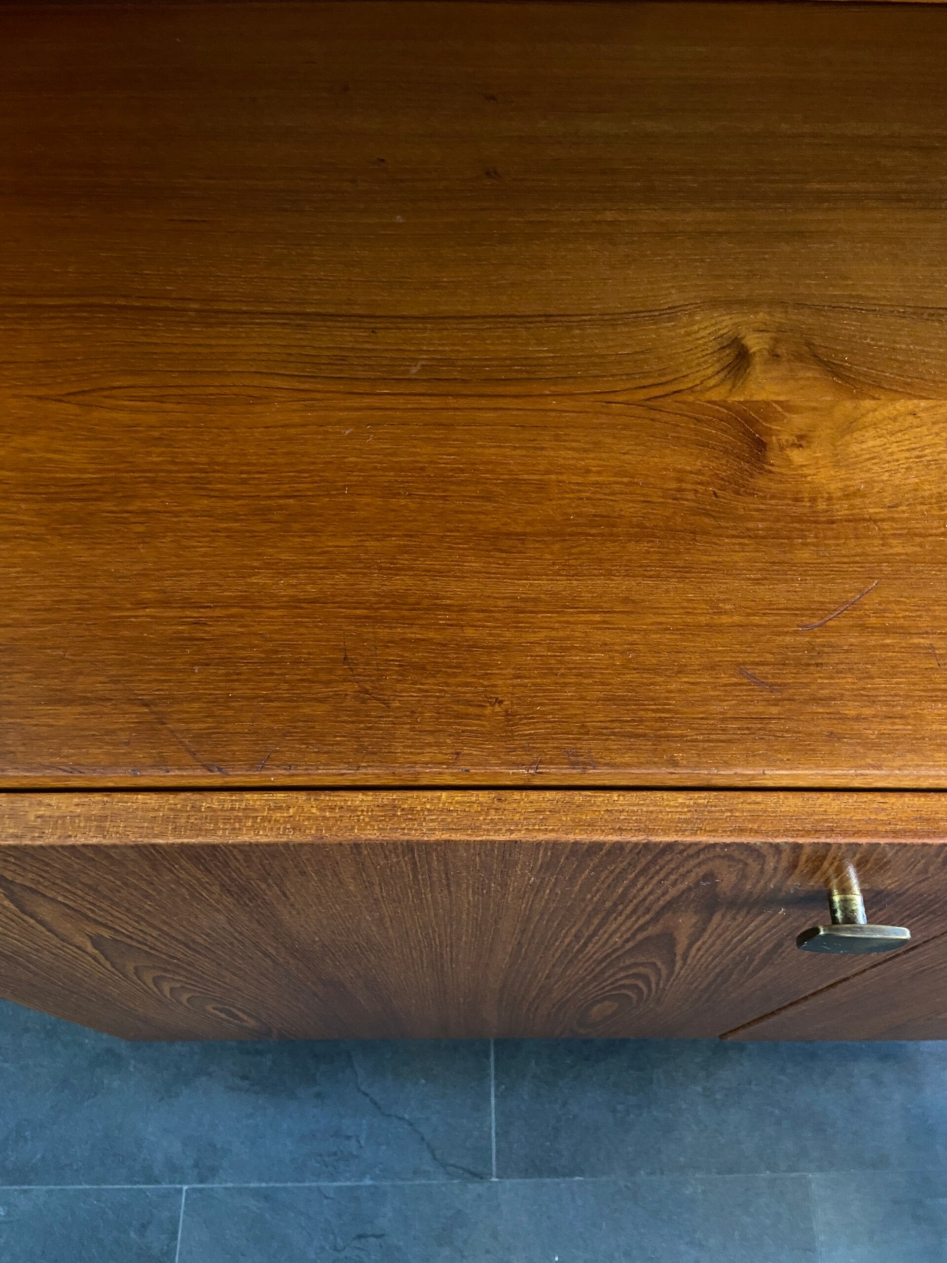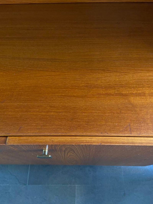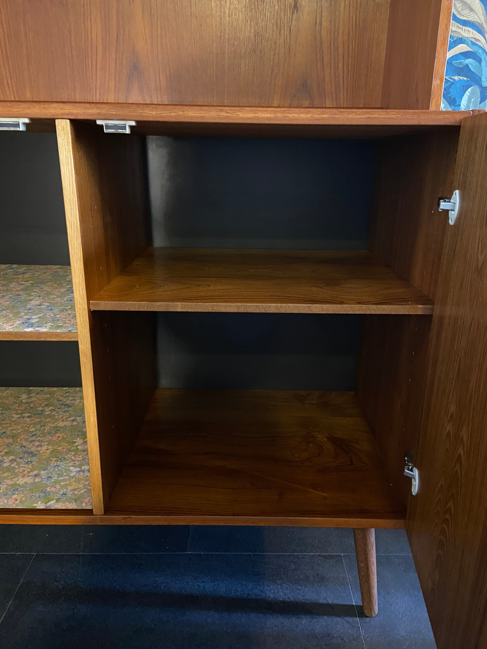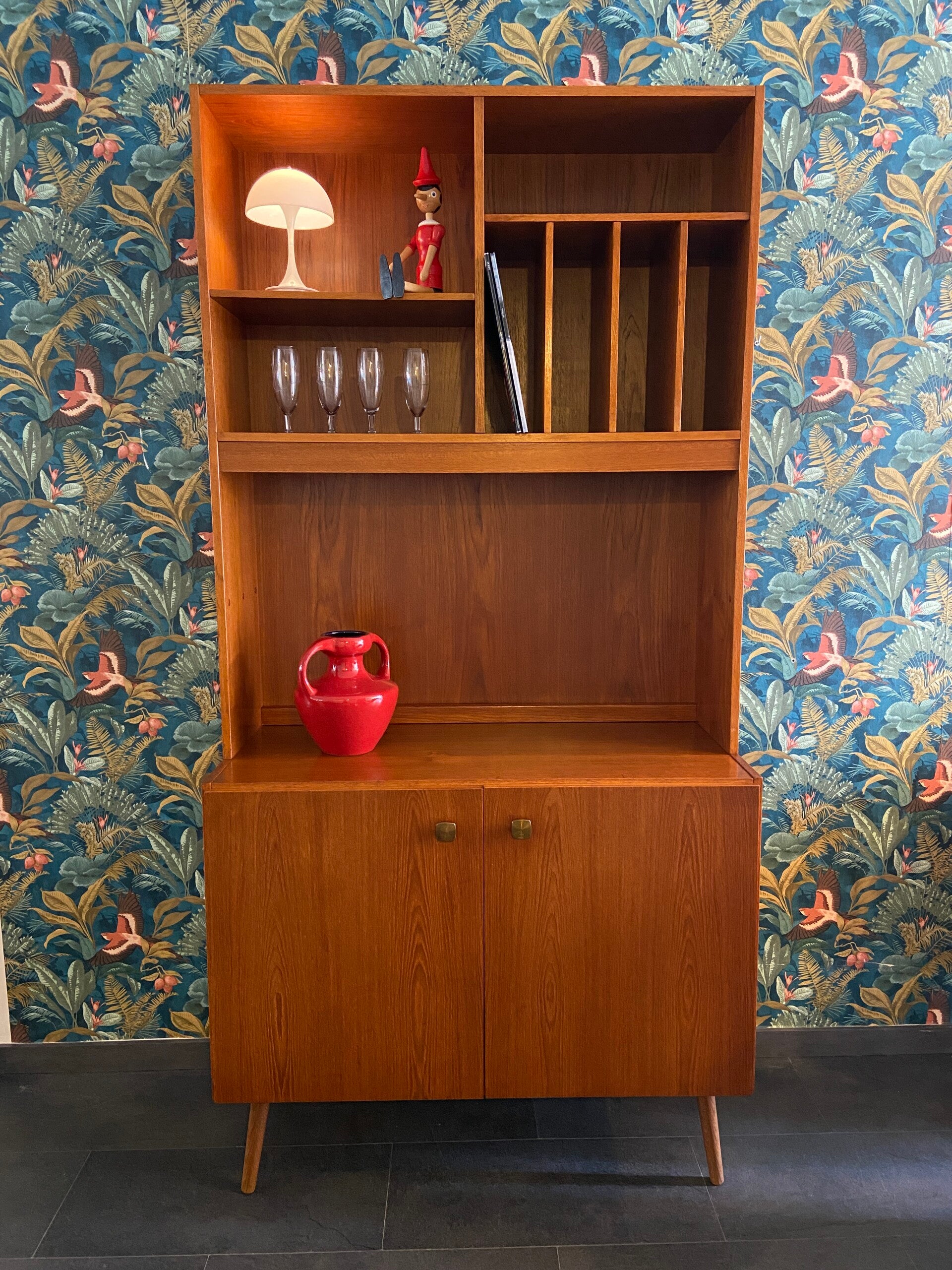Geweldige teak wandkast met platengedeelte in 2 delen! Deze mooie kast bestaat uit 2 delen en daarom gemakkelijk te vervoeren. De kast heeft een bovengedeelte met 1 in hoogte iverstelbare plank en 4 vakken voor je favoriete elpees. De onderkast heeft 2 deuren met daarachter 2 in hoogte verstelbare planken. De planken hebben vintage kastpapier dat natuurlijk ook verwijderd kan worden. Leuk detail zijn de vierkante messing handgrepen op de deuren. De kast verkeert in zeer mooie staat; een paar minimale oppervlakkige krasjes op het blad van de onderkast en zijwand; zie de detailfoto's.De bovenkast staat los op de bovenkast d.m.v. een deuvel. Voor de veiligheid adviseren wij altijd dergelijke kasten aan de muur te verankeren.