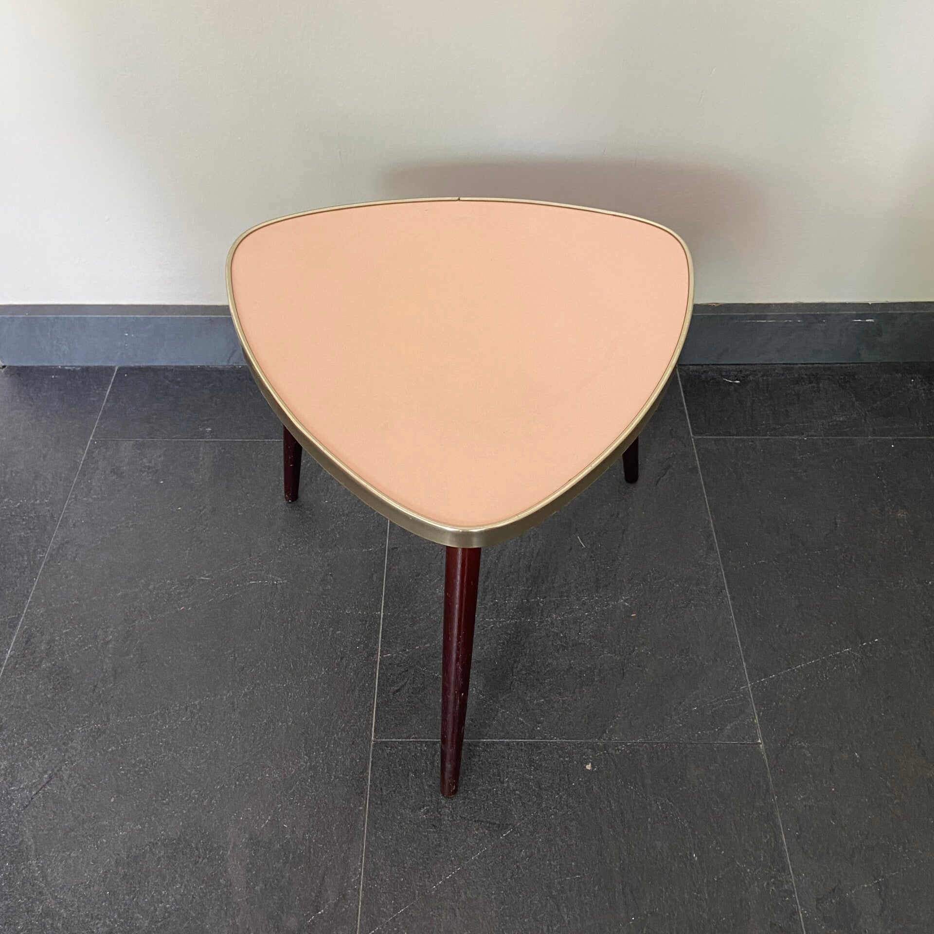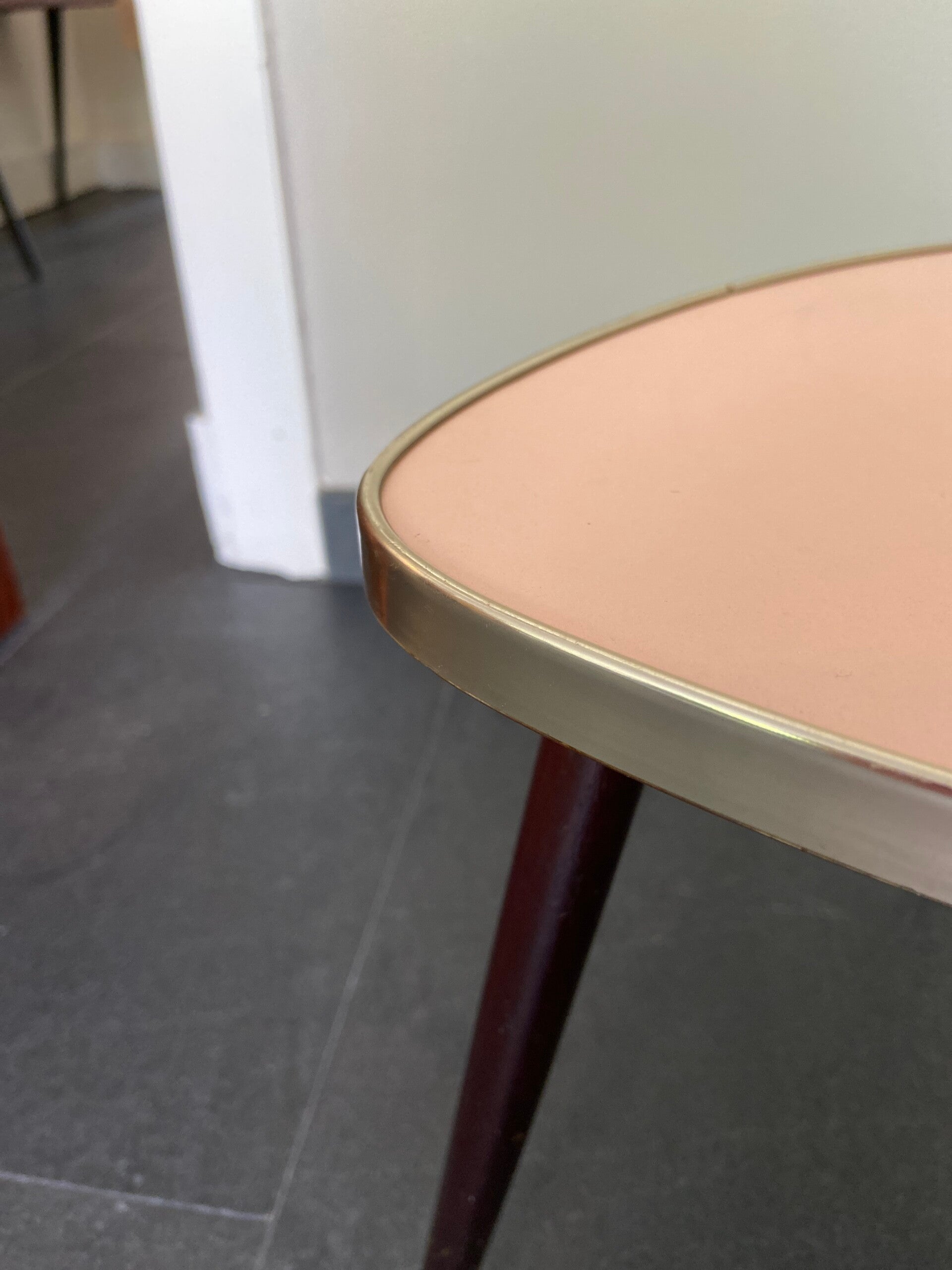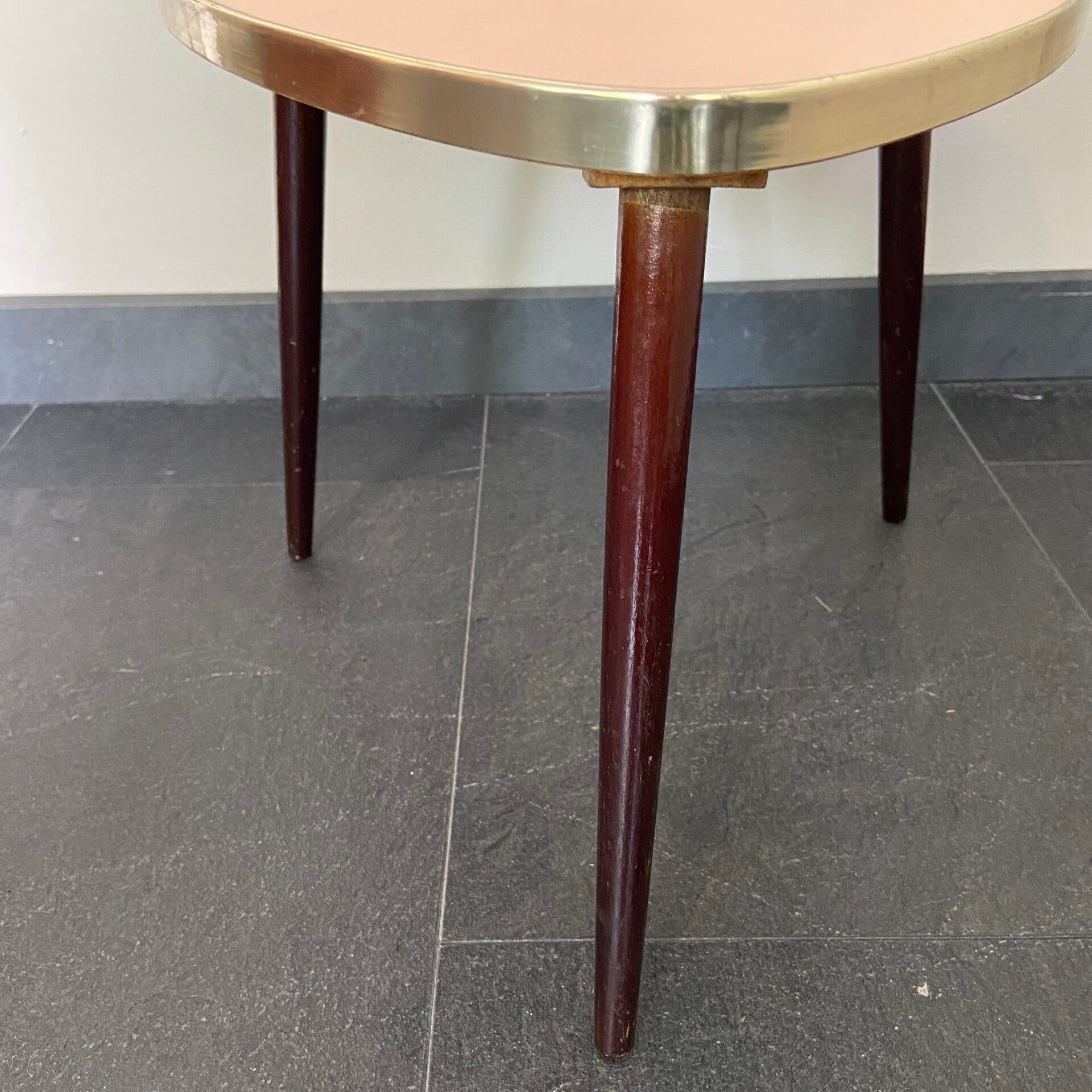 Ze blijven leuk! Dit tafeltje heeft een roze blad dat is afgebiesd met een messingkleurige rand. De tafel staat op hoge taps toelopende houten poten. Deze kunnen er eventueel af voor vervoer. De tafel verkeert in goede staat, op het blad zijn zeer oppervlakkige gebruikssporen aanwezig.