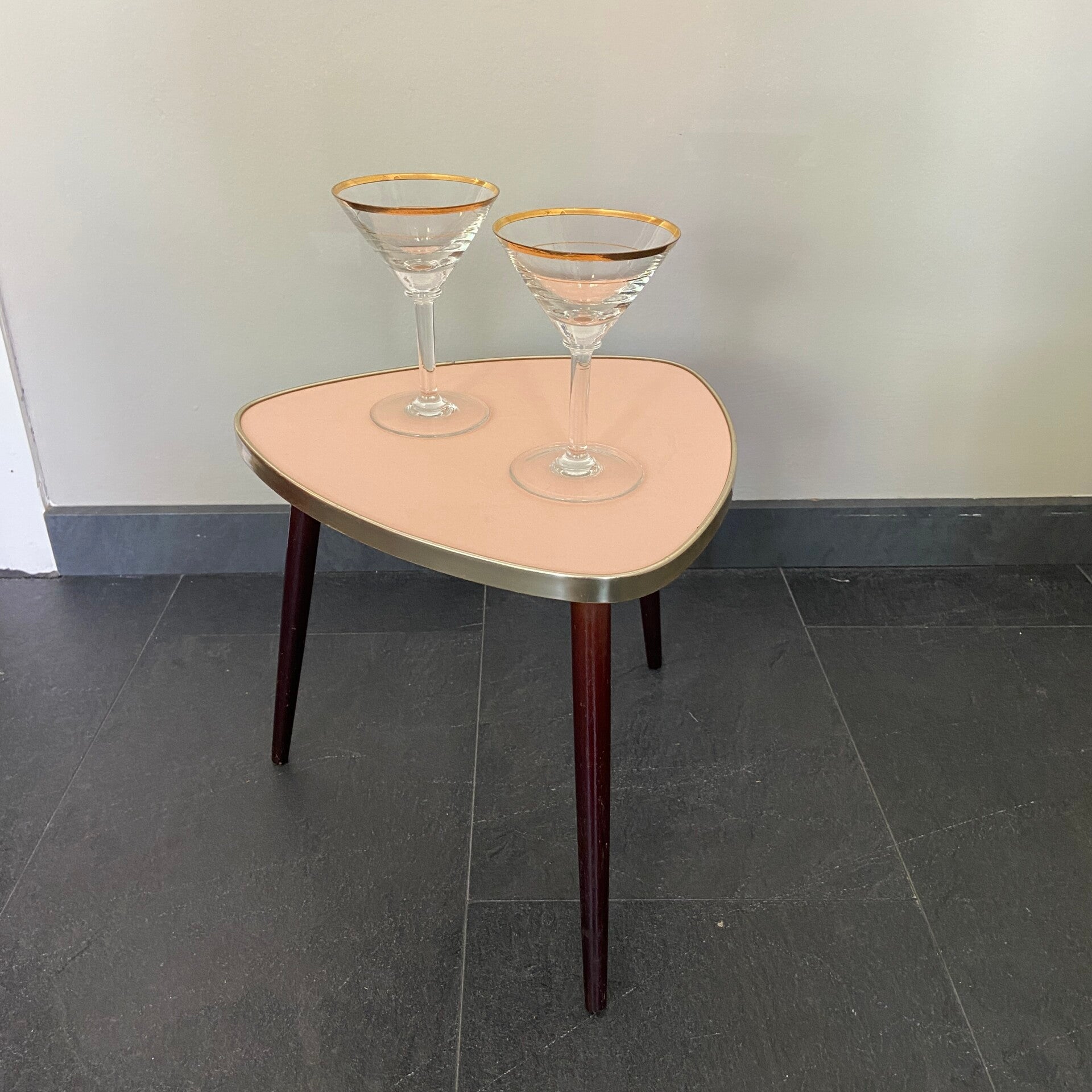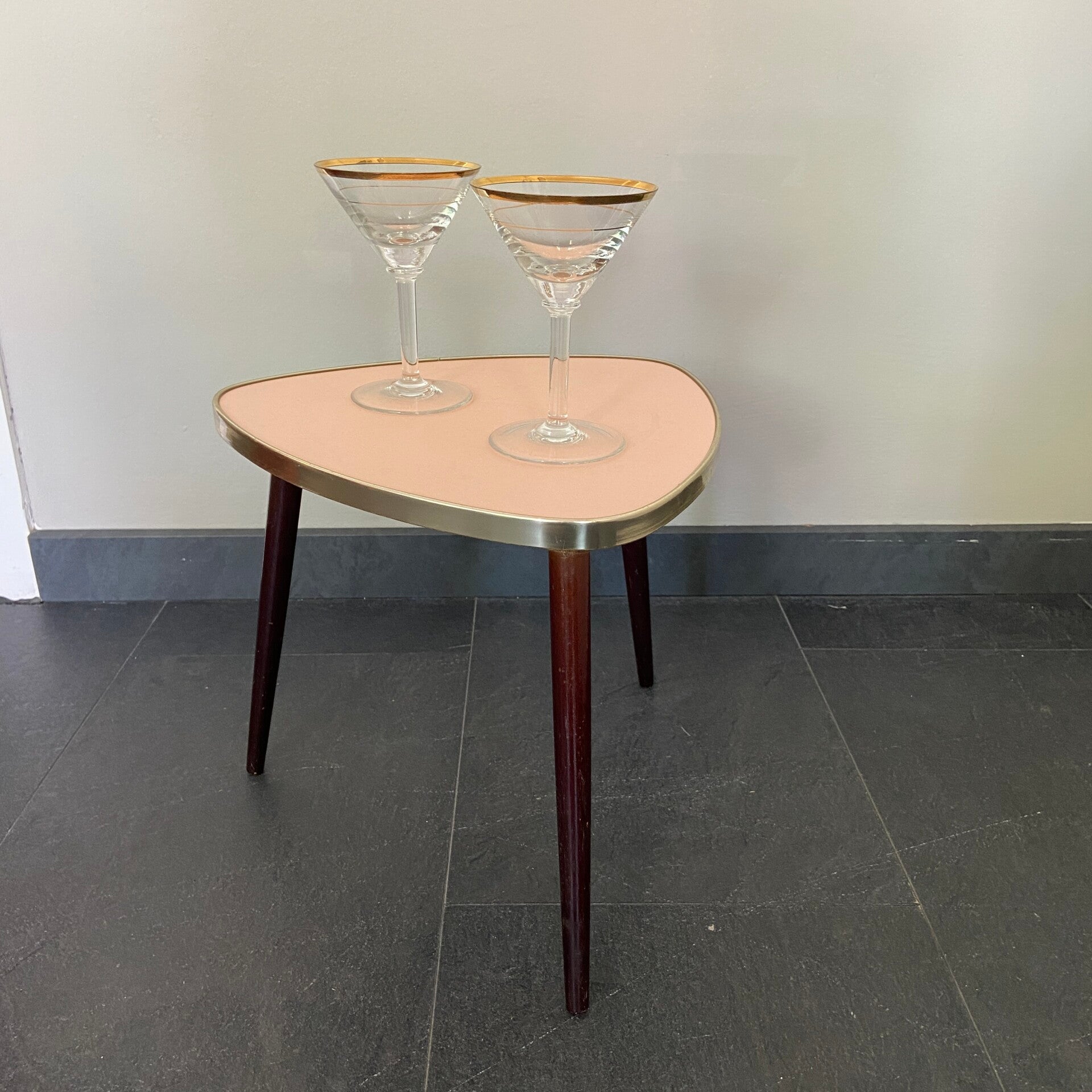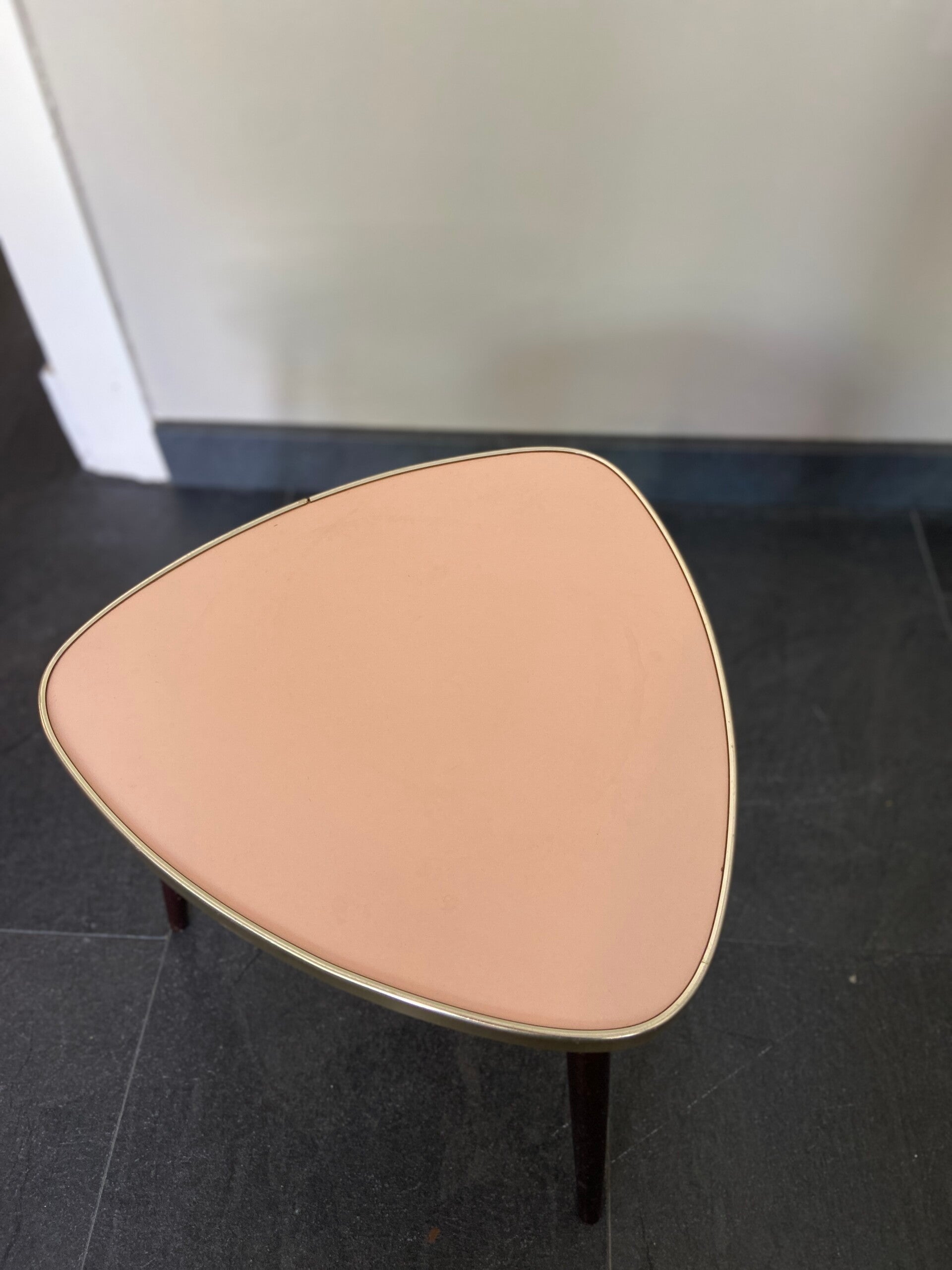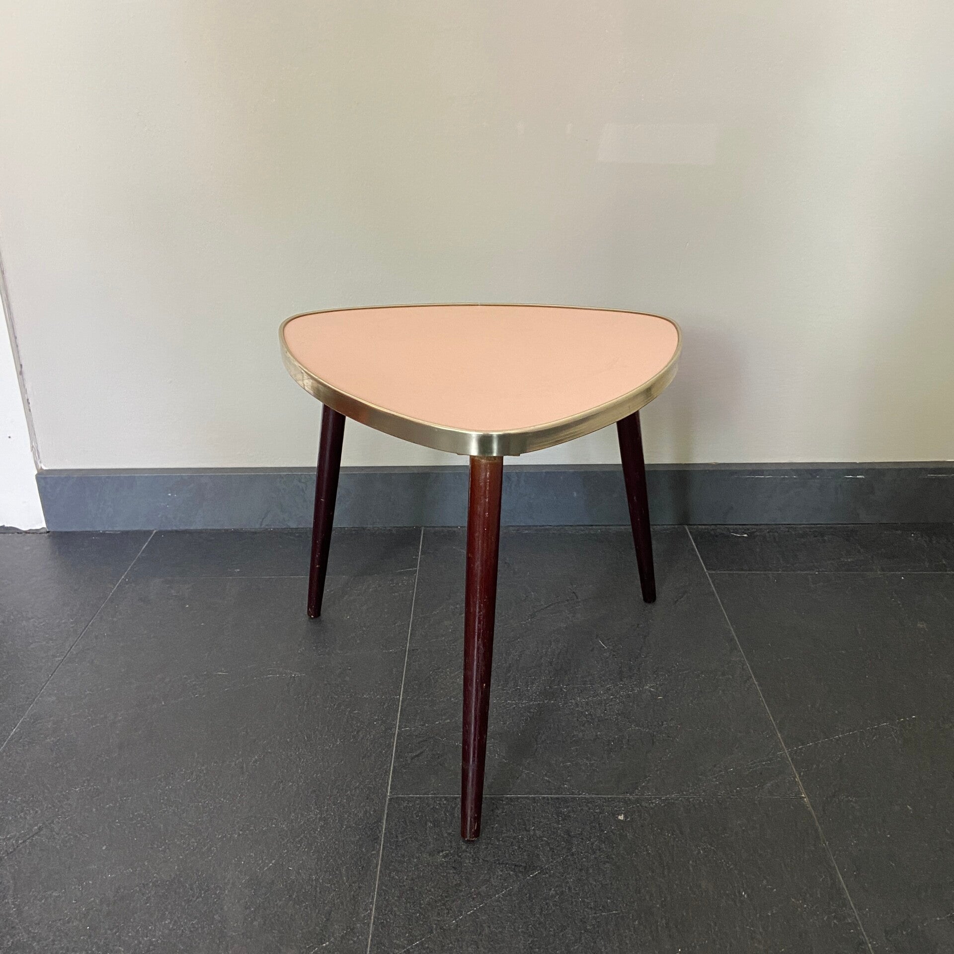 Ze blijven leuk! Dit tafeltje heeft een roze blad dat is afgebiesd met een messingkleurige rand. De tafel staat op hoge taps toelopende houten poten. Deze kunnen er eventueel af voor vervoer. De tafel verkeert in goede staat, op het blad zijn zeer oppervlakkige gebruikssporen aanwezig.