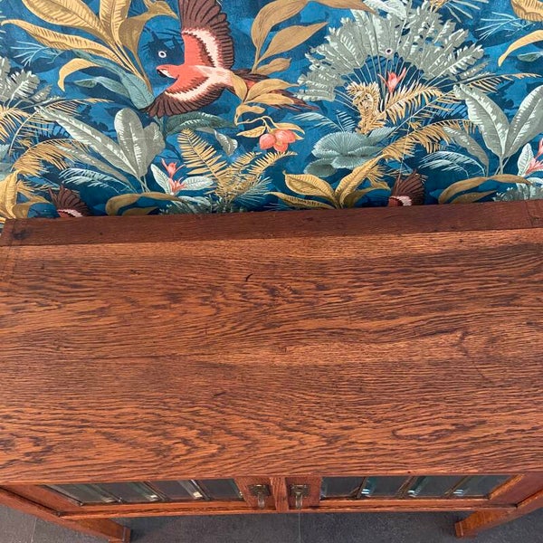 Bijzonder eiken theekast/dressoirtje met 2 deuren met facetgeslepen glas. De kast is uitgevoerd in eikenhout met een warme uitstraling. Het is een oudje dus de kast heeft wat ouderdoms-/gebruikssporen maar verkeert, gezien de leeftijd, in mooie staat. Het glas is intact en dat is bij dit soort kastjes belangrijk omdat je dergelijk oud glas niet of zeer moeilijk kunt kopen.