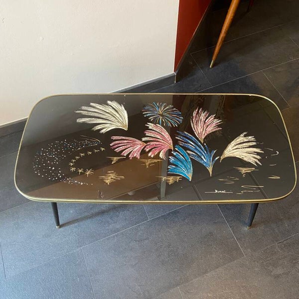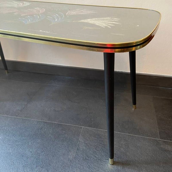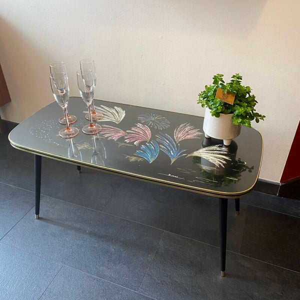 Eye catcher! Franse salontafel met een kleurig decoratief patroon en glazen blad. Het tafelblad is afgebiesd met een messingkleurige band en zwarte rand. De tafel staat op matzwarte, hoge poten en verkeert in goede staat.