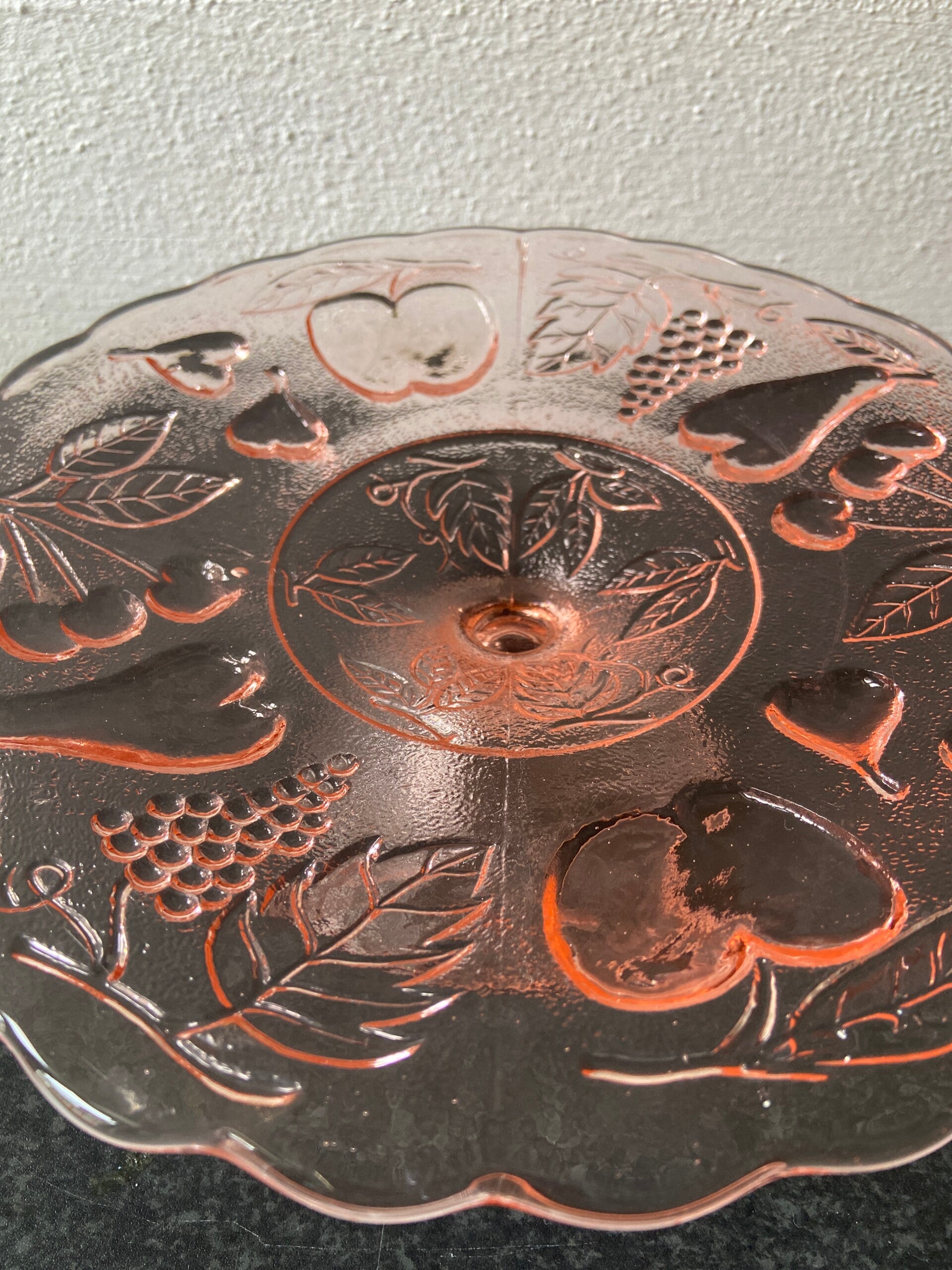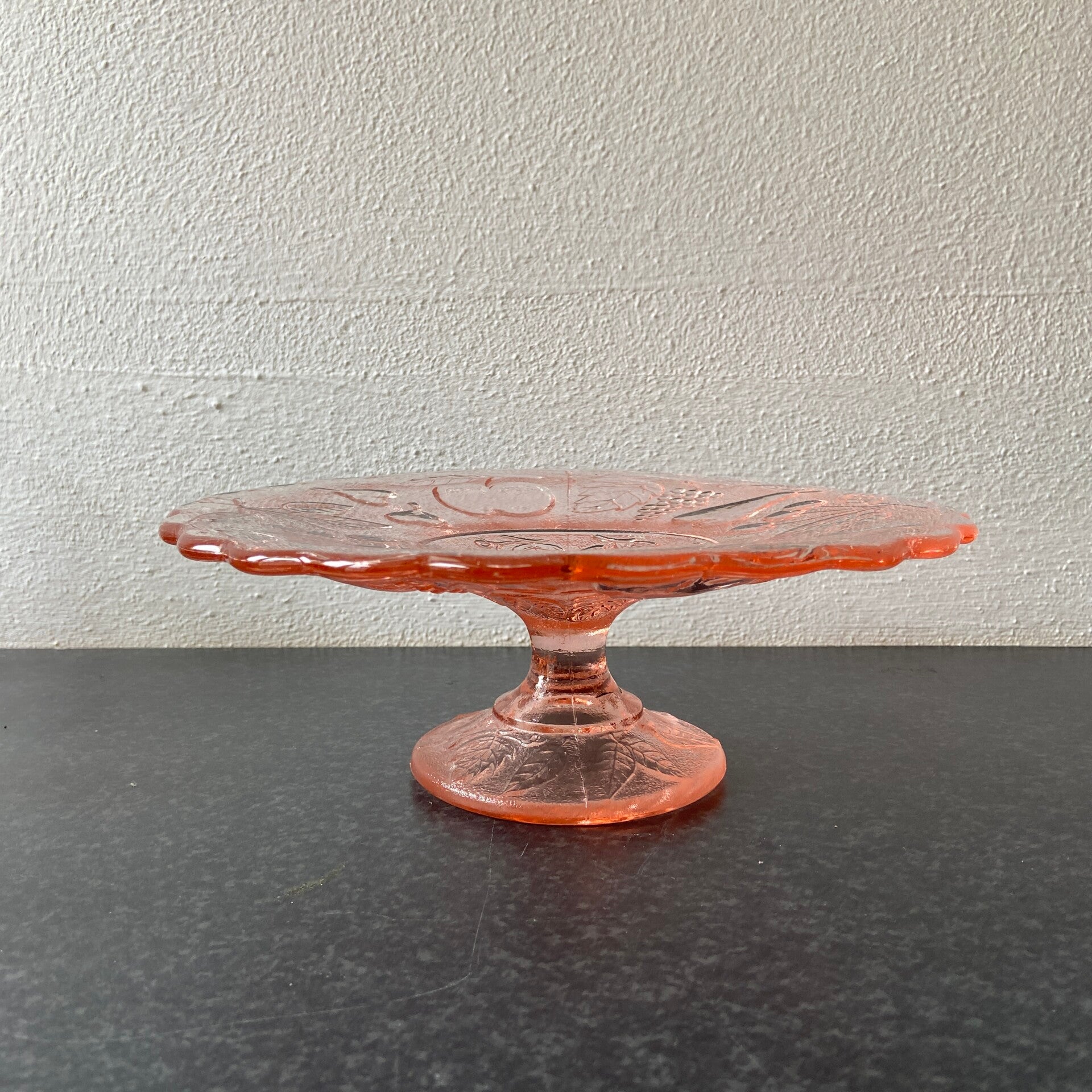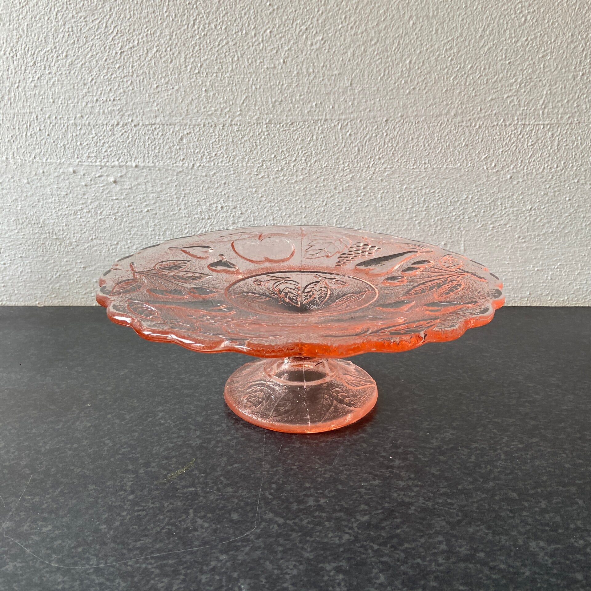 Vintage fruitschaal op voet van rosaline glas