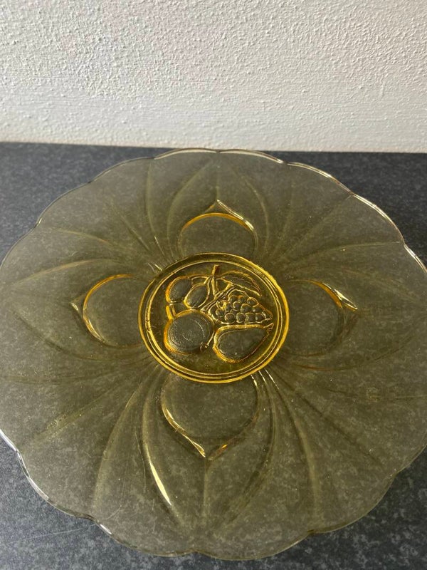 Bewerkte glazen schaal met decoraties van fruit en groenten. De schaal heeft een mooie vorm met geschulpte rand. De conditie van de schaal is goed.