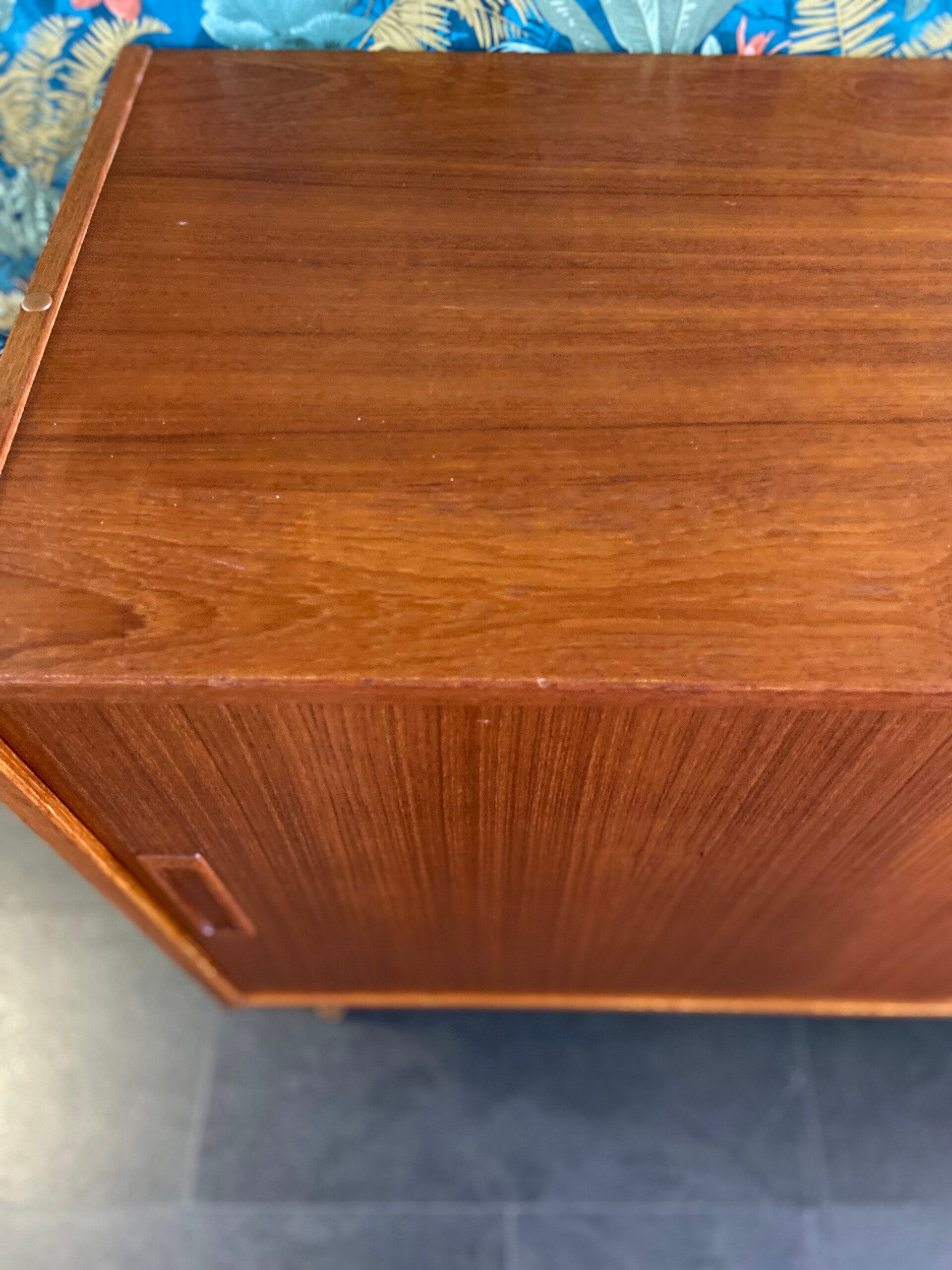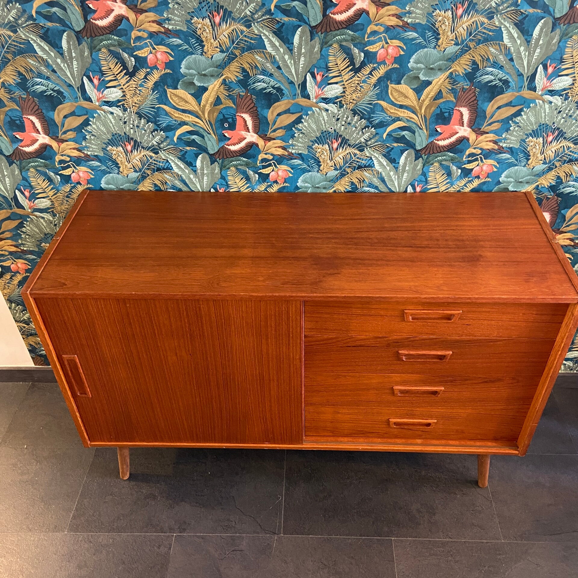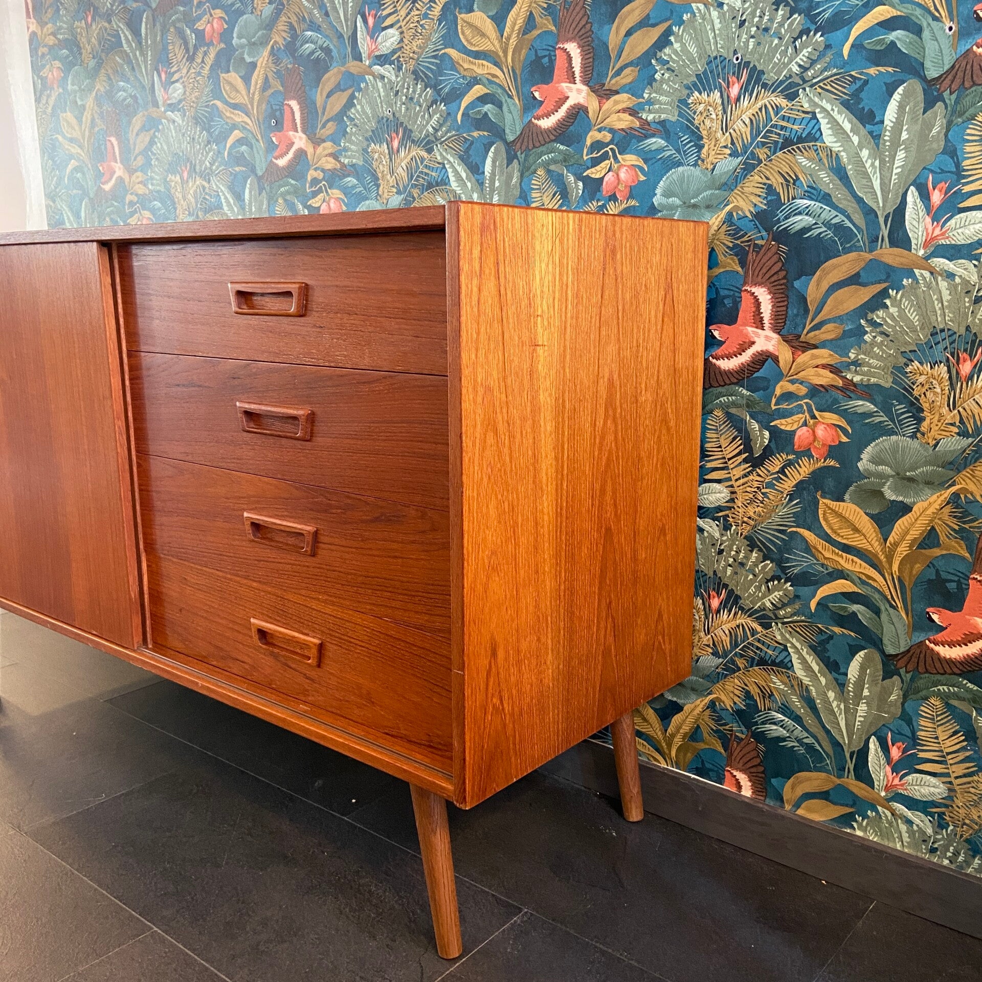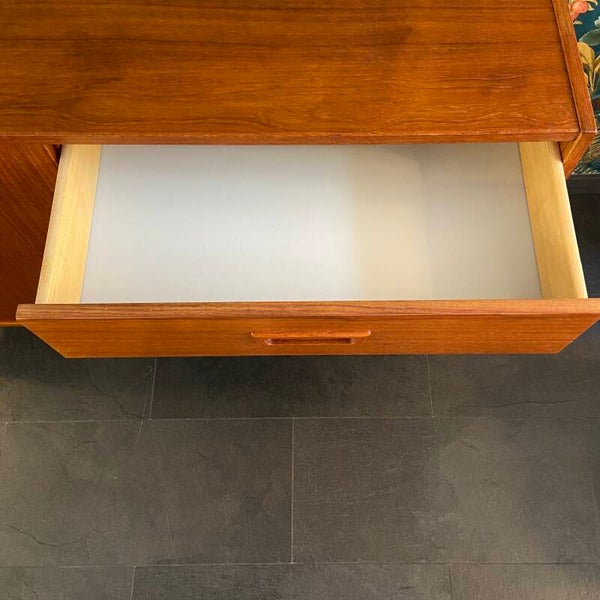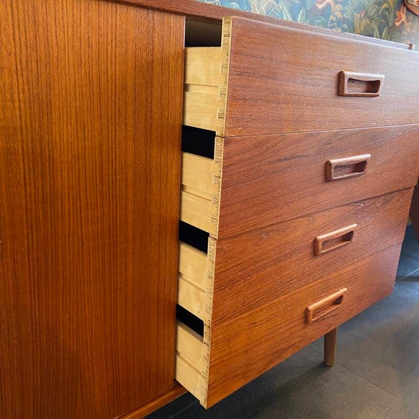 Zeer mooi en zwaar kwaliteitsdressoir van Westergaard Møbelfabrik uit Denemarken. De kast is uitgevoerd in teak en heeft links een schuifdeur met daarachter een in hoogte verstelbare plank en rechts 4 laden die veel opbergruimte bieden. De kast verkeert in zeer mooie staat met minimale gebruikssporen passend bij de leeftijd. Let ook op de mooi vormgegeven handgrepen.