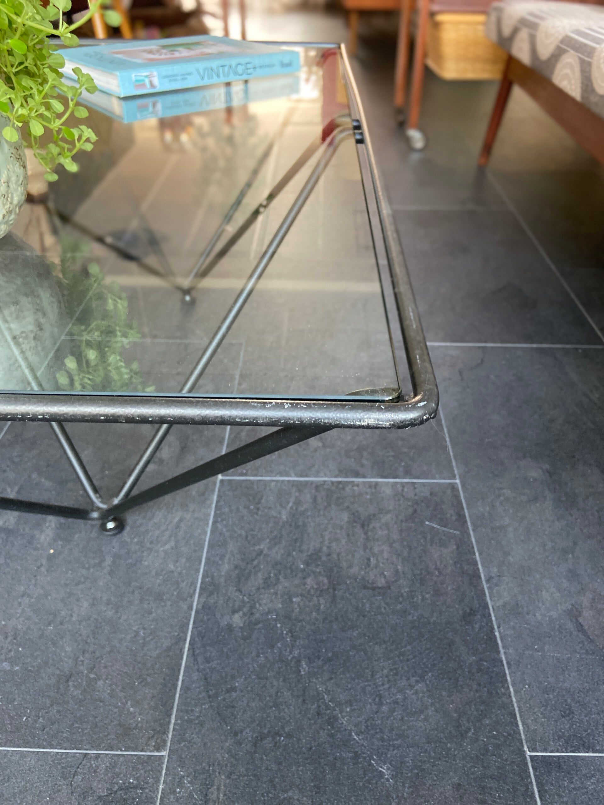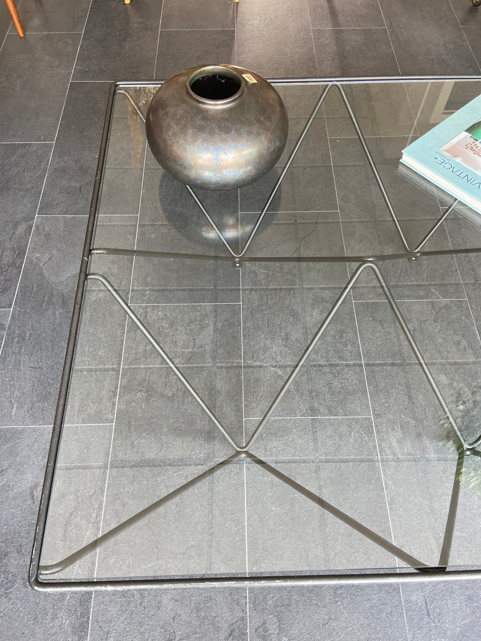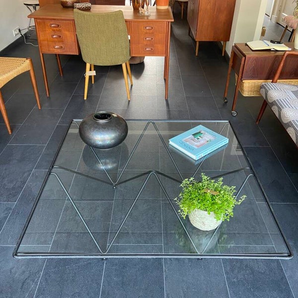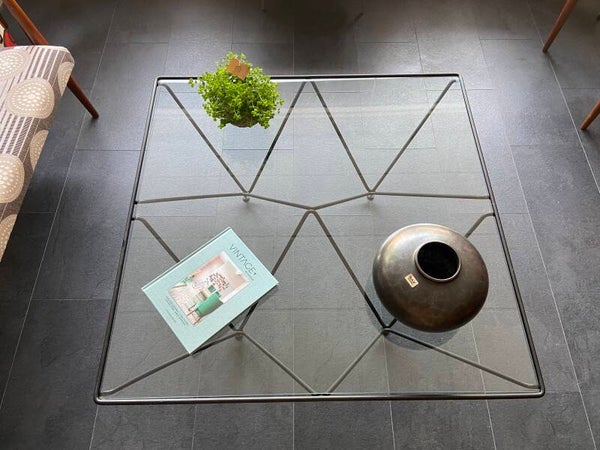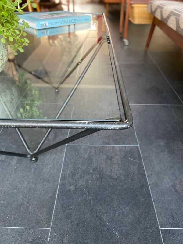 Deze salontafel in de stijl van de Italiaanse architect en ontwerper Paolo Piva is een echte blikvanger in de woonkamer! De tafel bestaat uit een geometrisch piramidevormig, metalen onderstel met daarop een glazen blad. Het blad verkeert in goede staat; geen chips e.d. Het frame verkeert in mooie staat met hier en daar wat gebruikssporen, maar niets storends naar mijn mening; zie de foto's die een goed beeld geven.