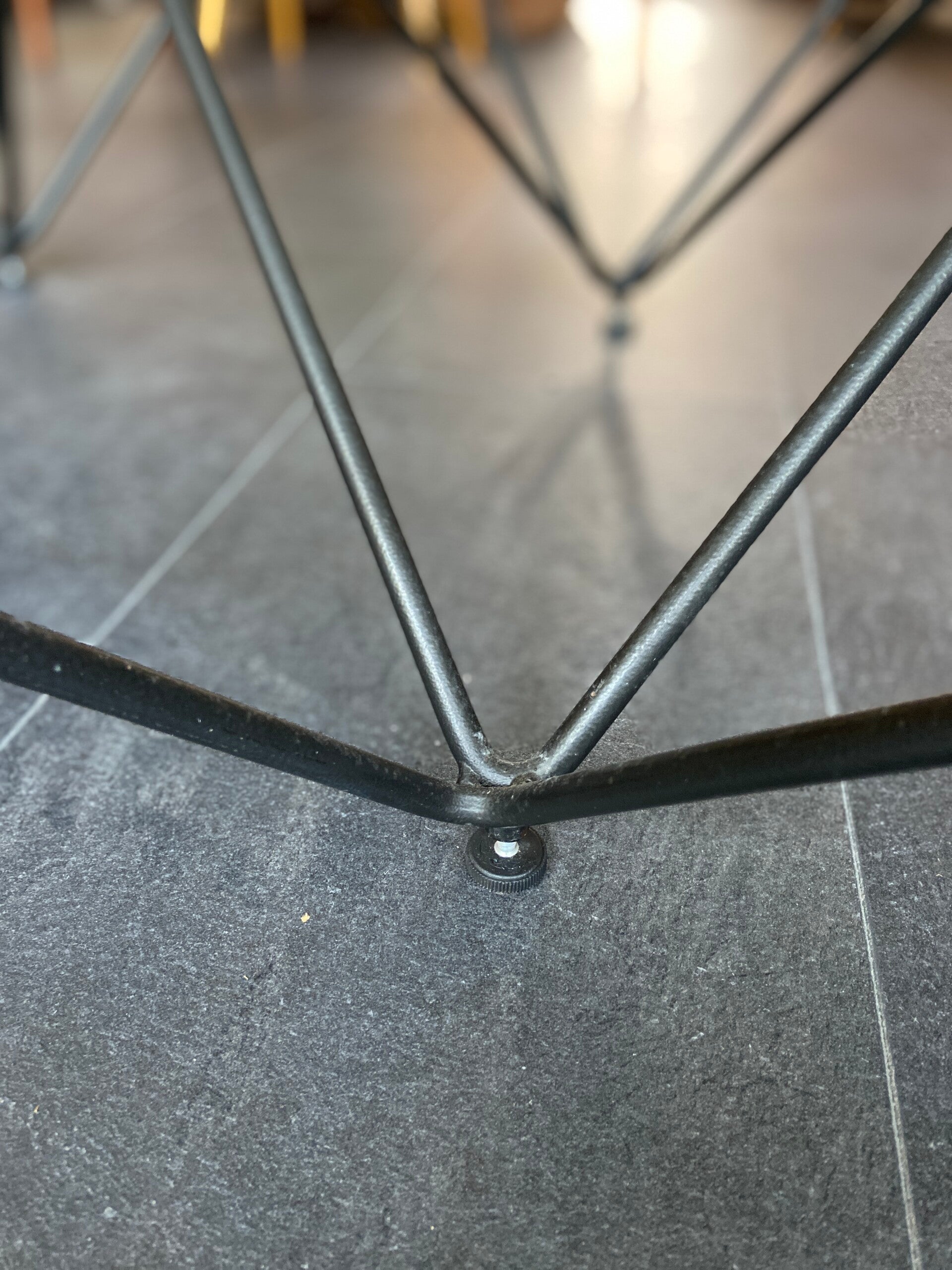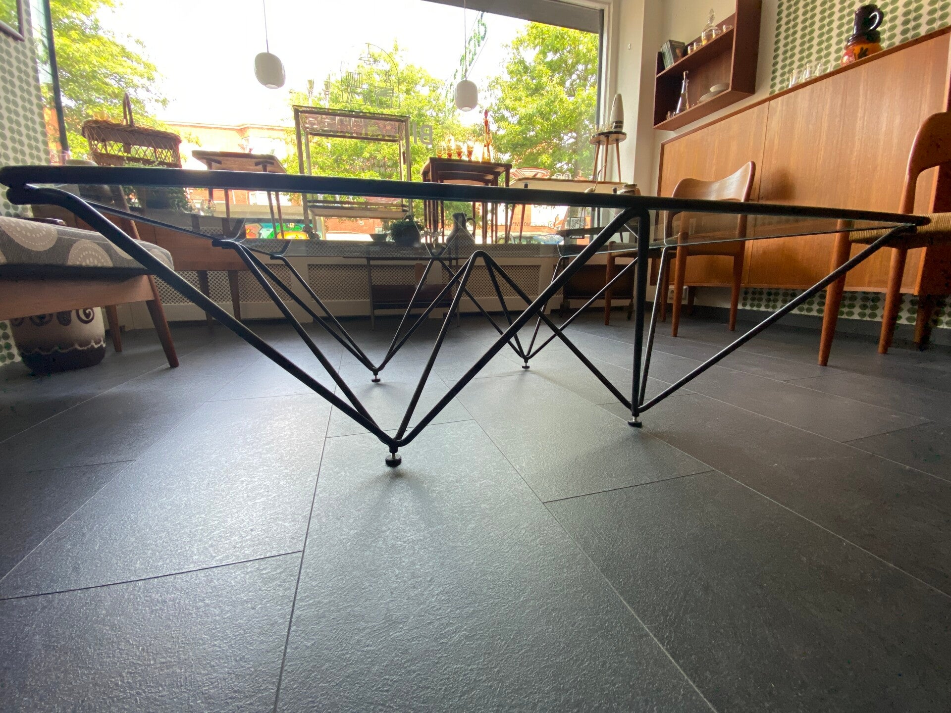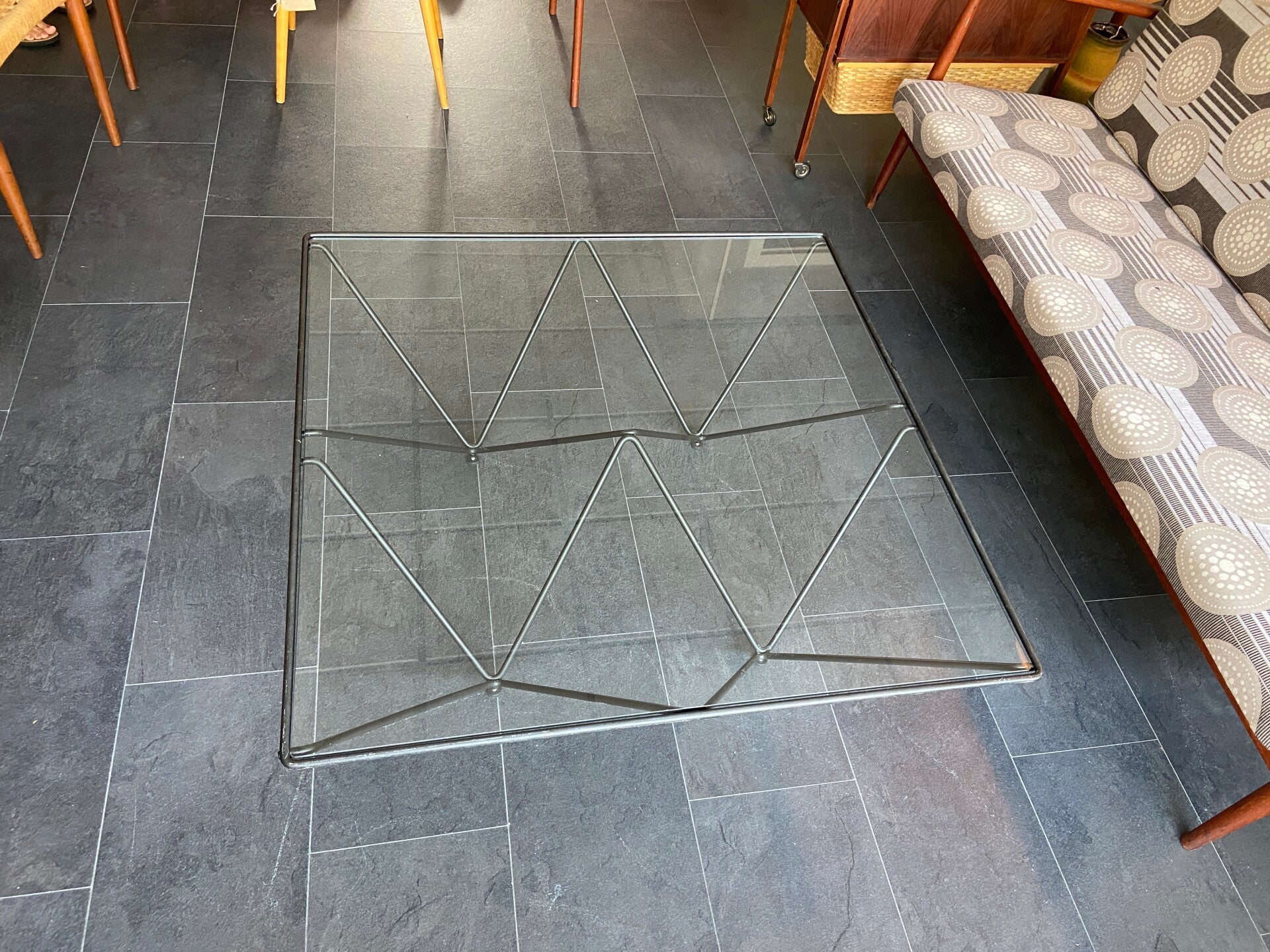 Deze salontafel in de stijl van de Italiaanse architect en ontwerper Paolo Piva is een echte blikvanger in de woonkamer! De tafel bestaat uit een geometrisch piramidevormig, metalen onderstel met daarop een glazen blad. Het blad verkeert in goede staat; geen chips e.d. Het frame verkeert in mooie staat met hier en daar wat gebruikssporen, maar niets storends naar mijn mening; zie de foto's die een goed beeld geven.