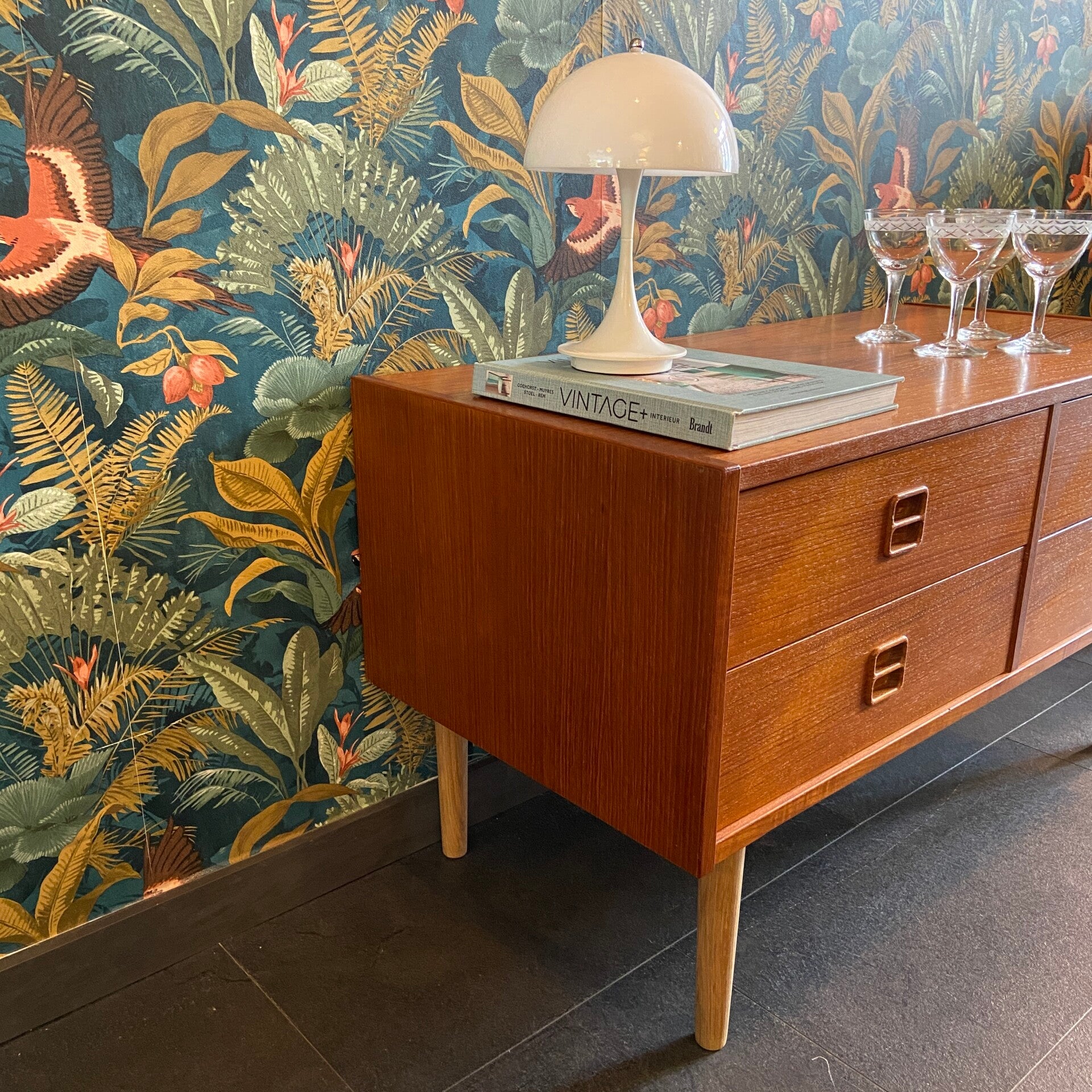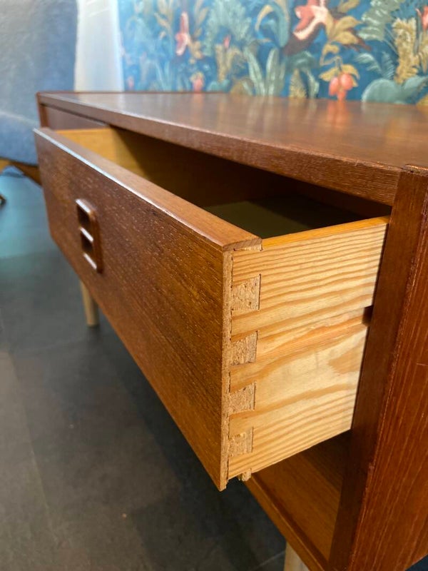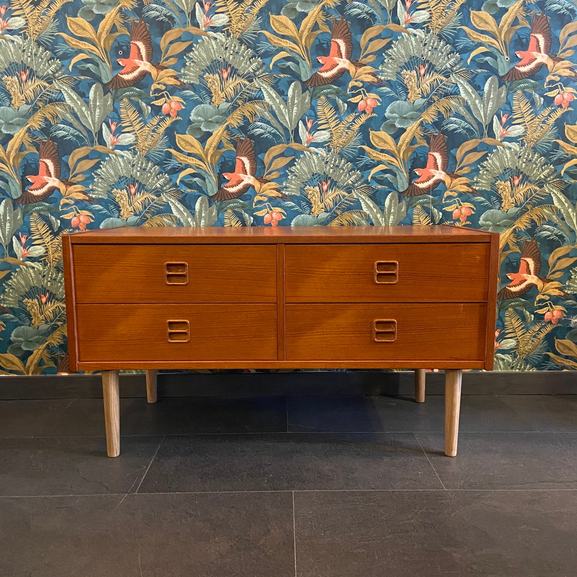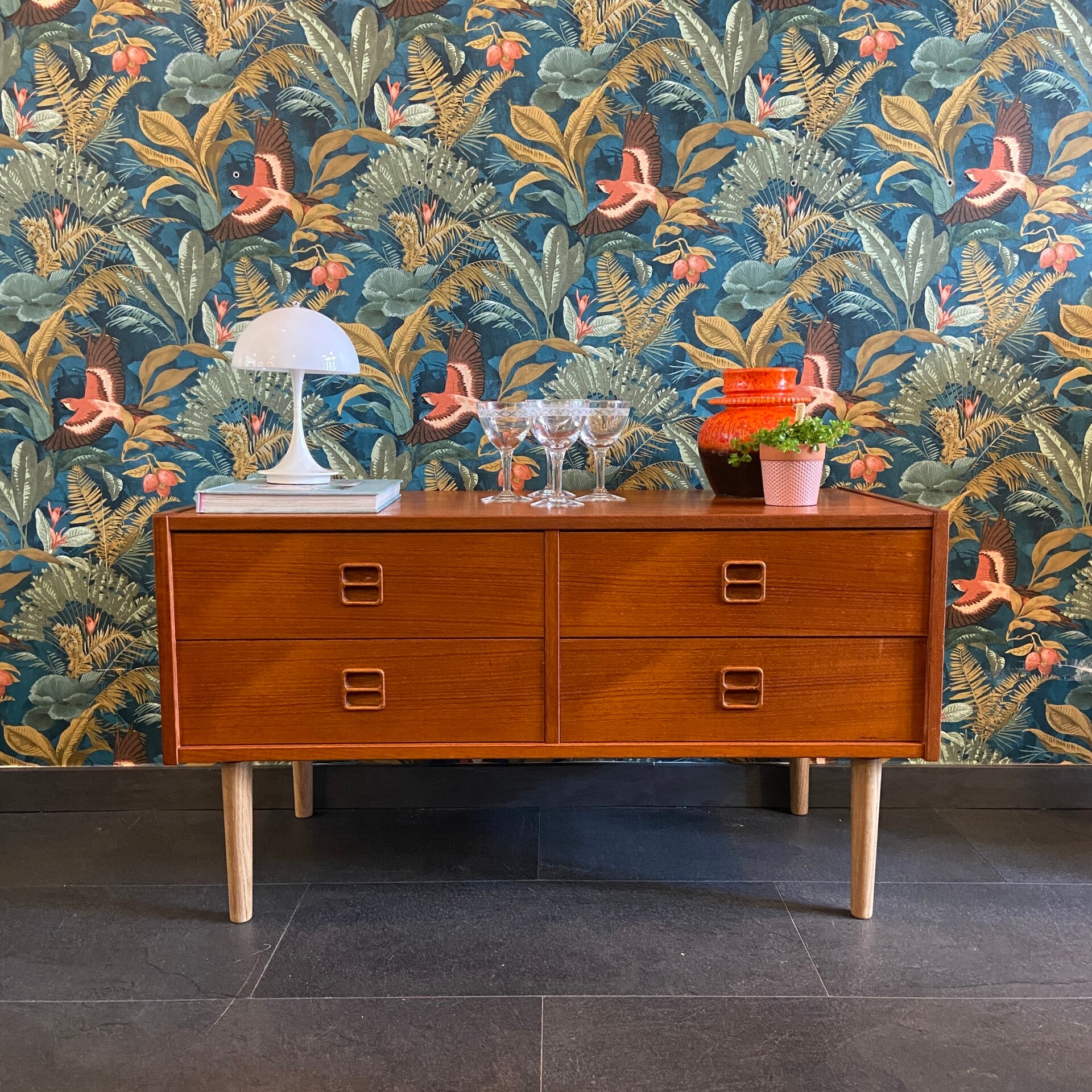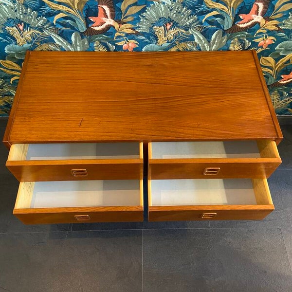 Multifunctionele kast met 4 laden uit Denemarken. De kast is gemaakt van warm teak fineer en heeft 4 laden om veel spullen in op te bergen. Ideaal om de TV op te zetten of de platenspeler, maar ook als compact dressoir, in de hal met een spiegel erboven, in de slaap- of kinderkamer een handig opbergmeubel! De kast verkeert in mooie staat met wat kleine gebruikssporen op het bovenblad. Zie hiervoor de detailfoto's.