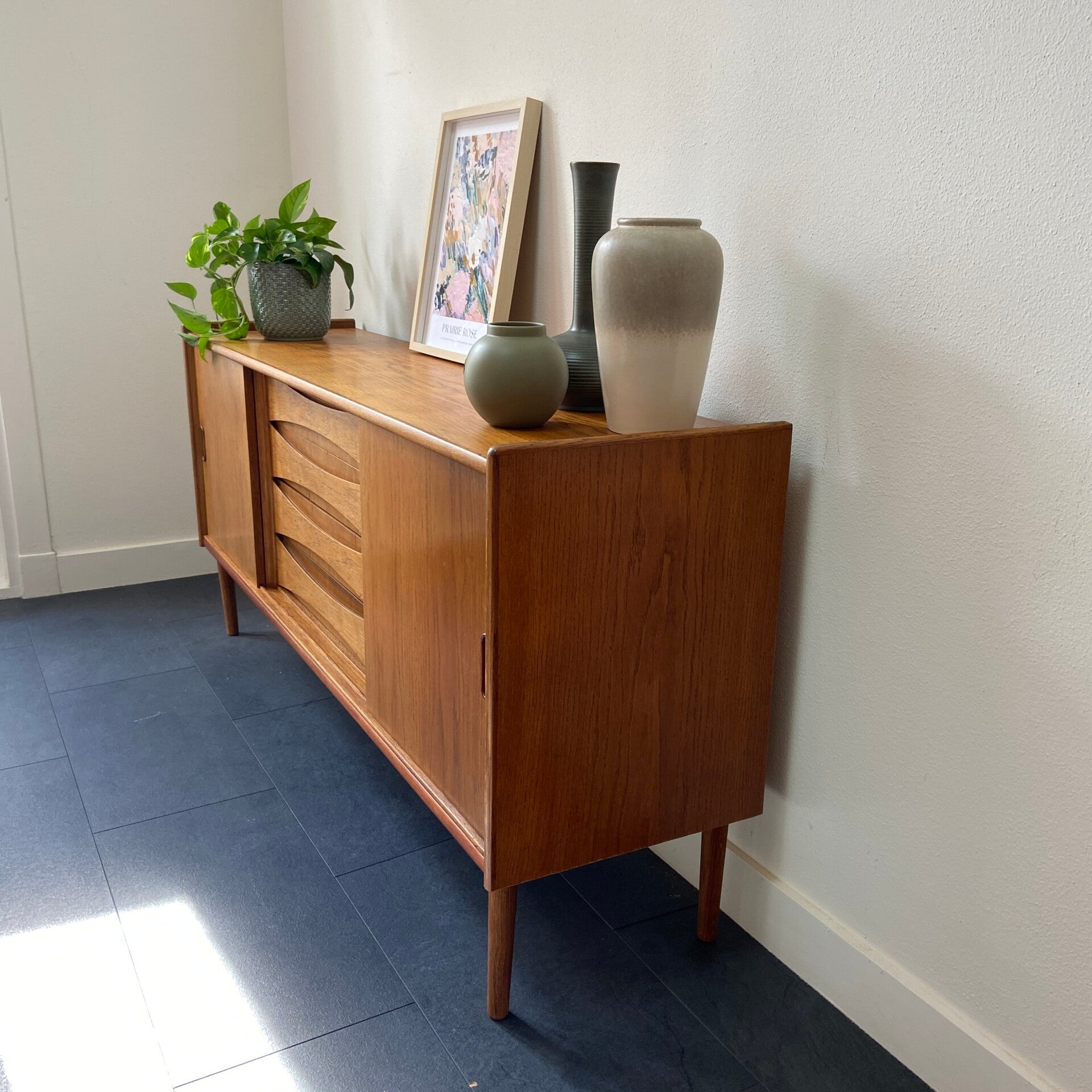 Ideaal dressoir; niet te groot en niet te klein met veel opbergruimte door de combinatie van kasten en laden. Het dressoir dankt zijn typische Deense uitstraling aan de fraai gevormde handgrepen van de laden en de ingelegde houten deurgrepen. Let ook op de mooie lijstafwerking in de overgang van de laden naar de schuifdeuren. Het dressoir heeft een beschermende hardwaxolie laag gekregen en verkeert in mooie staat met wat minimale gebruikssporen hier en daar. De derde lade gaat wat stroef.