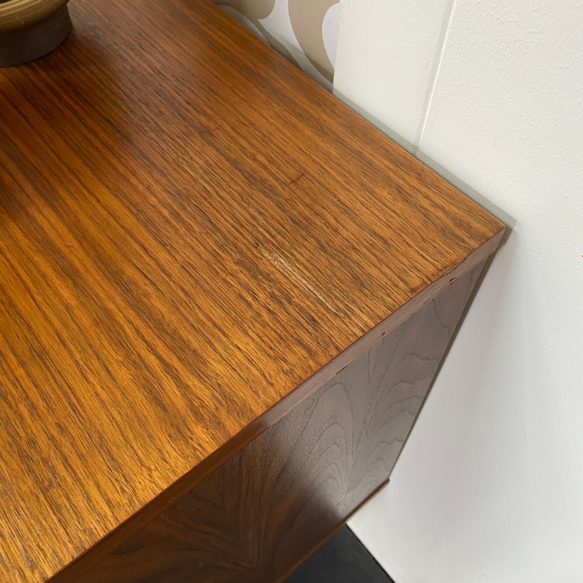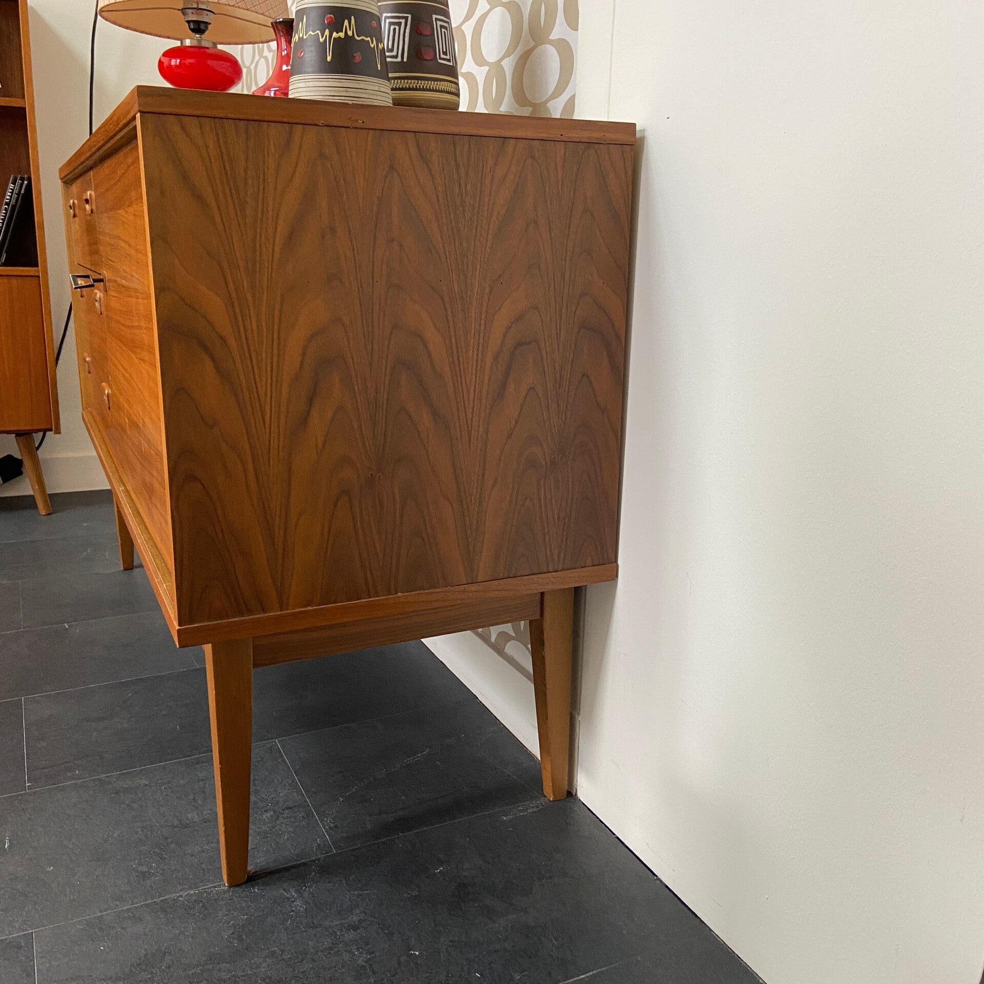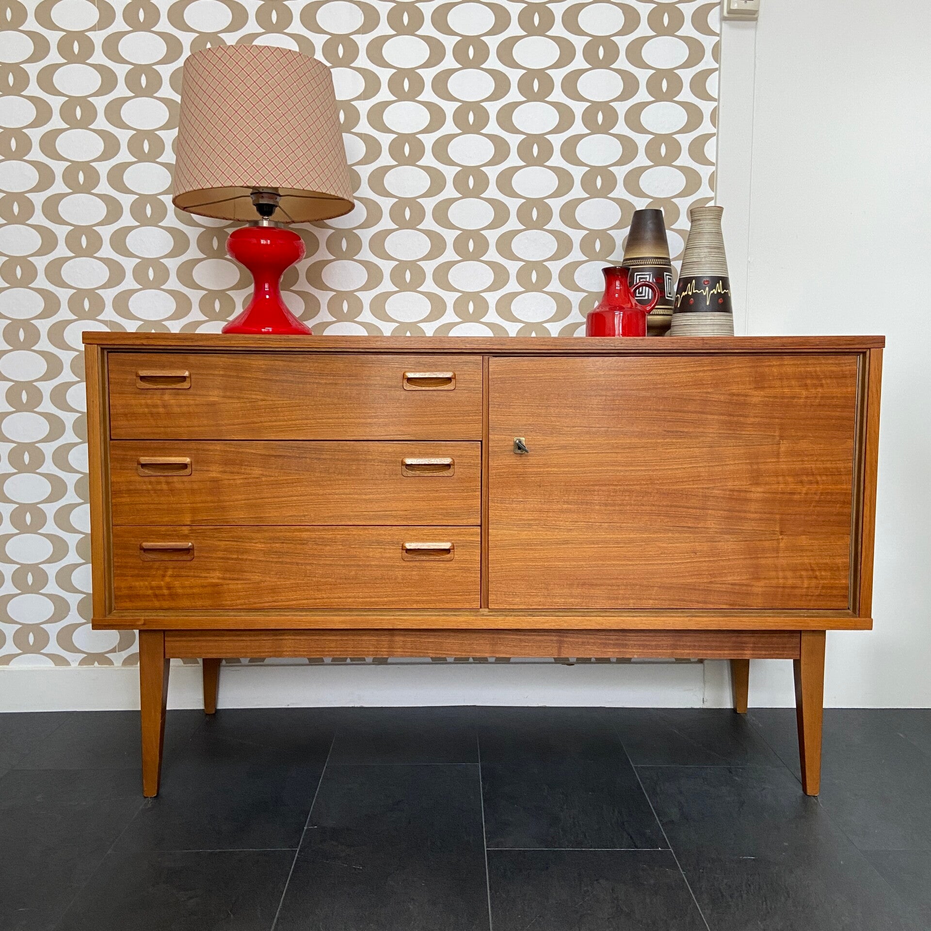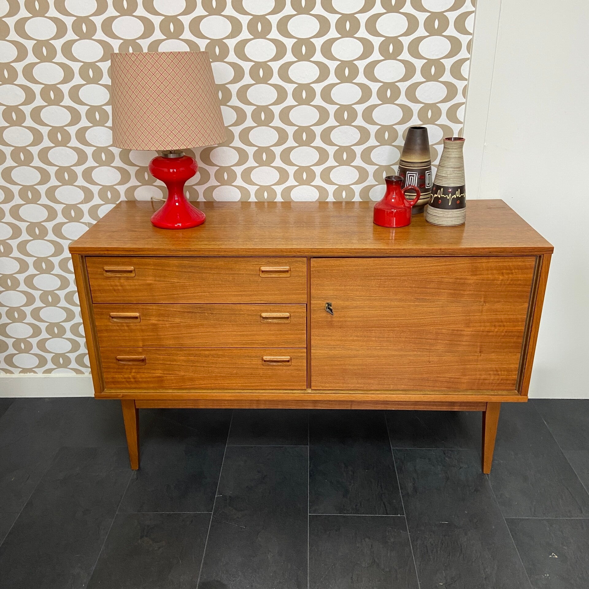 Mooi strak, compact sideboard met een Scandinavische uitstraling, maar gevonden in Duitsland :-) De kast heeft 3 laden met mooie houten handgrepen en 1 kast met deur en originele sleutel. Het fraai gevormde onderstel geeft de kast een stoere, solide uitstraling. Let ook op de mooie houttekening in het warme fineer! De conditie van de kast is goed met wat gebruikssporen op het blad in de vorm van krasjes en een lichte kring. Zie de detailfoto's.