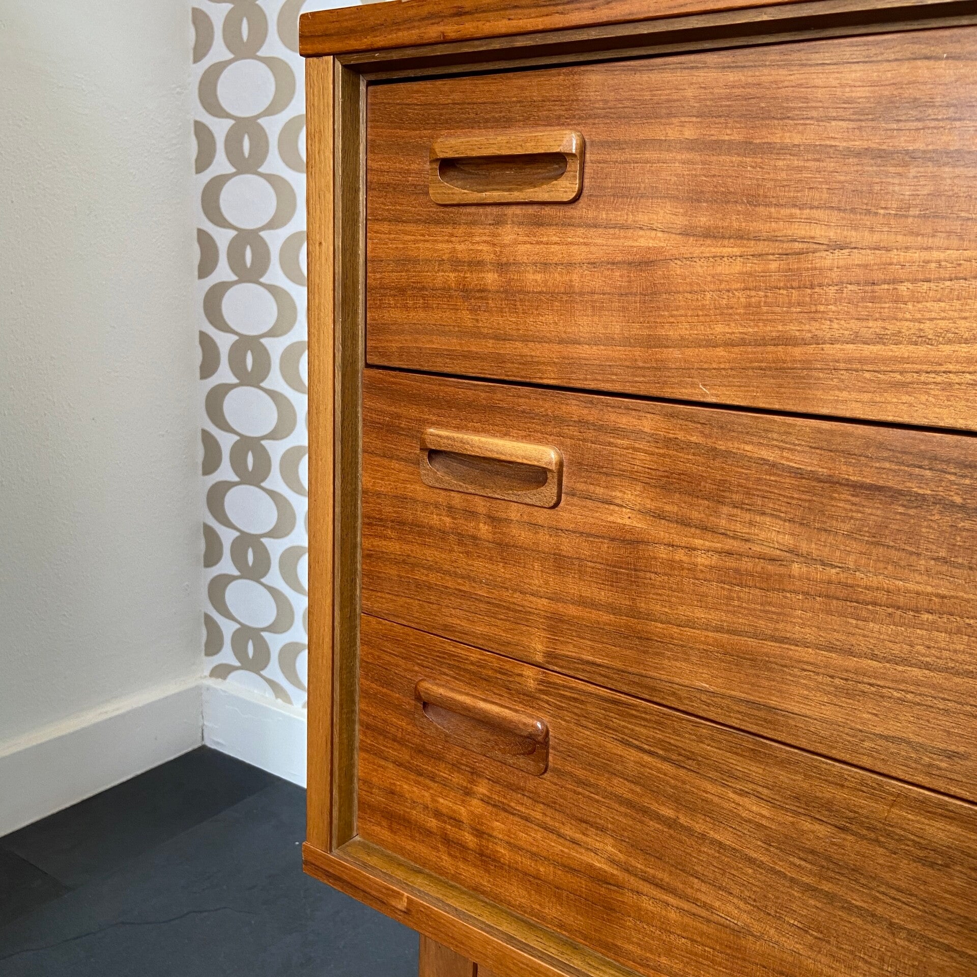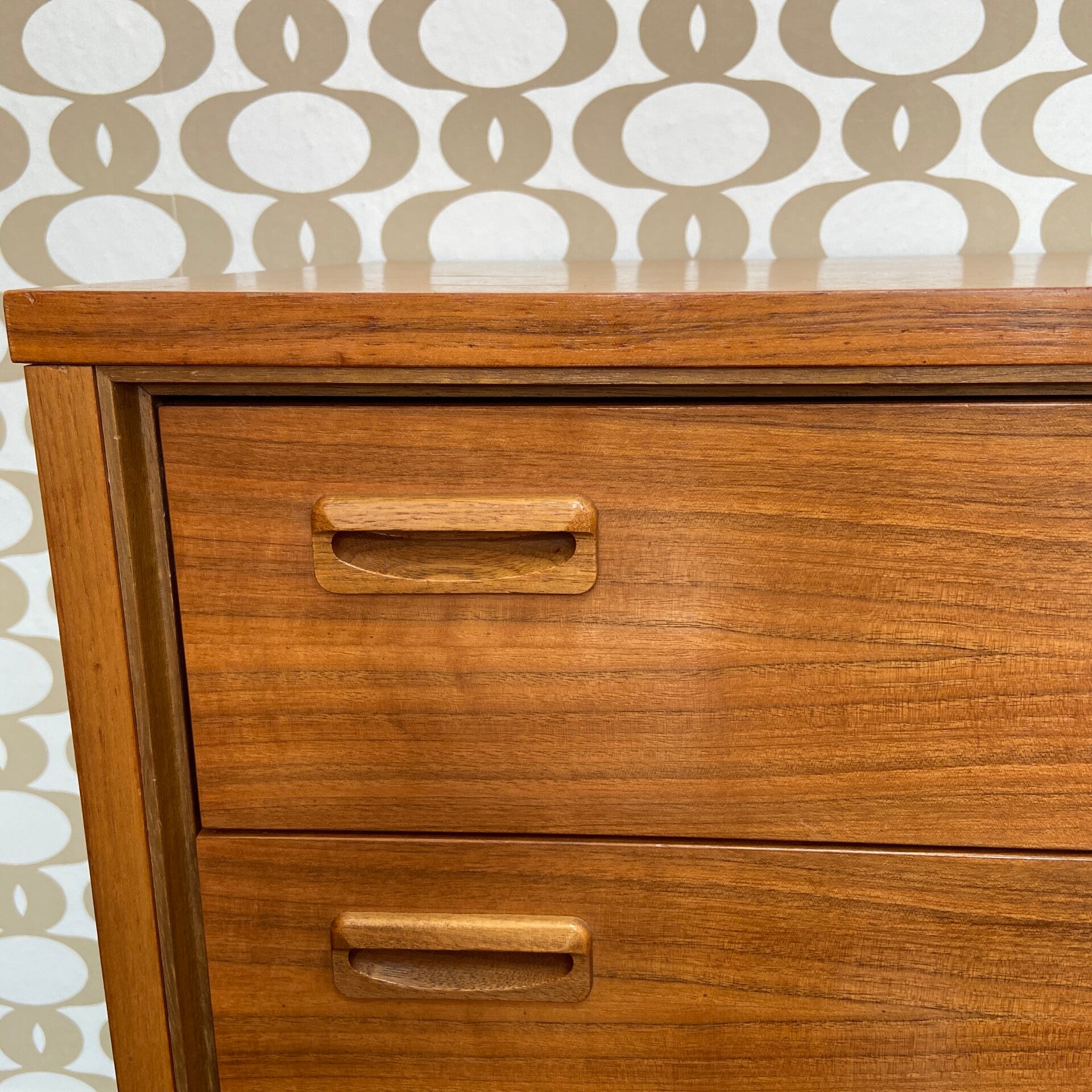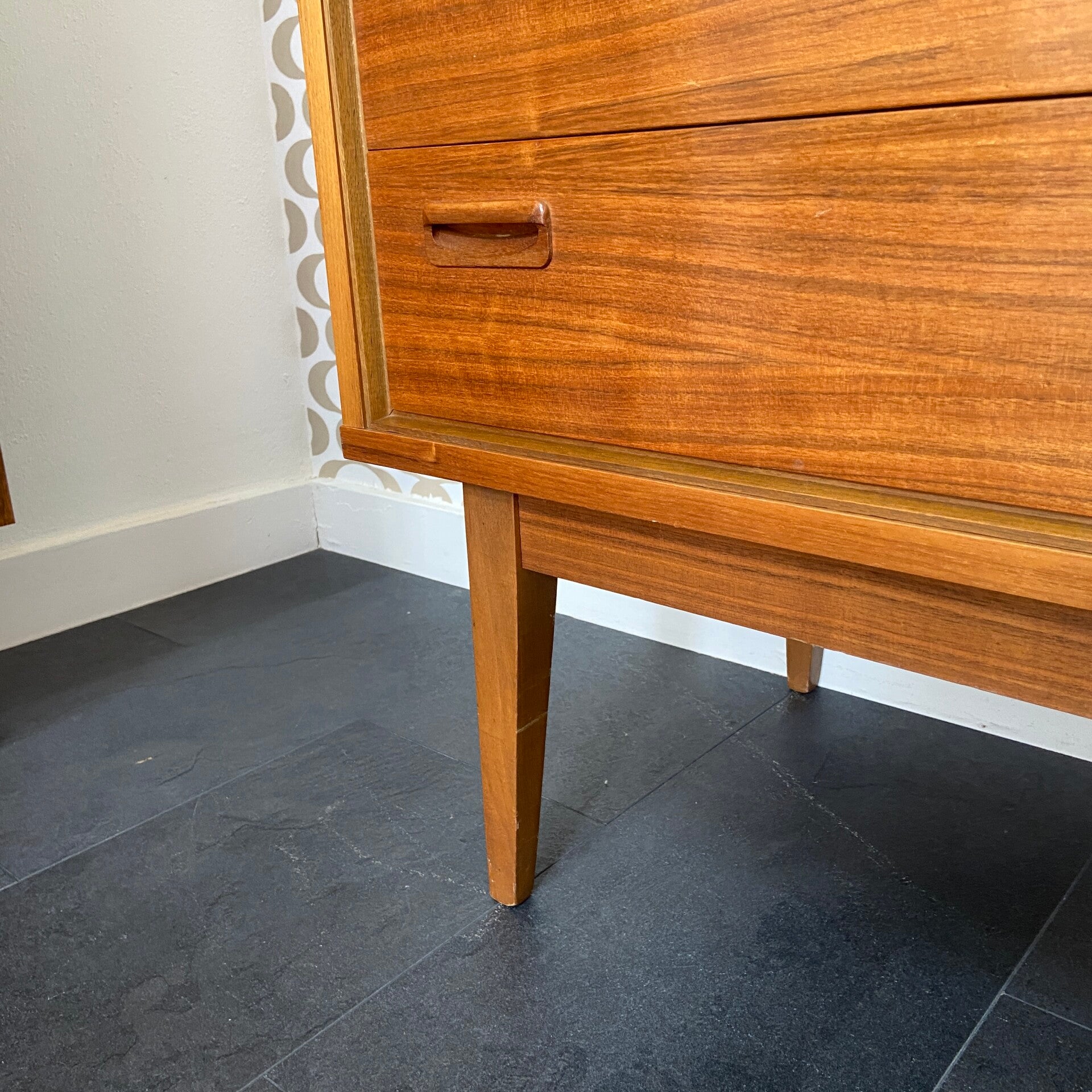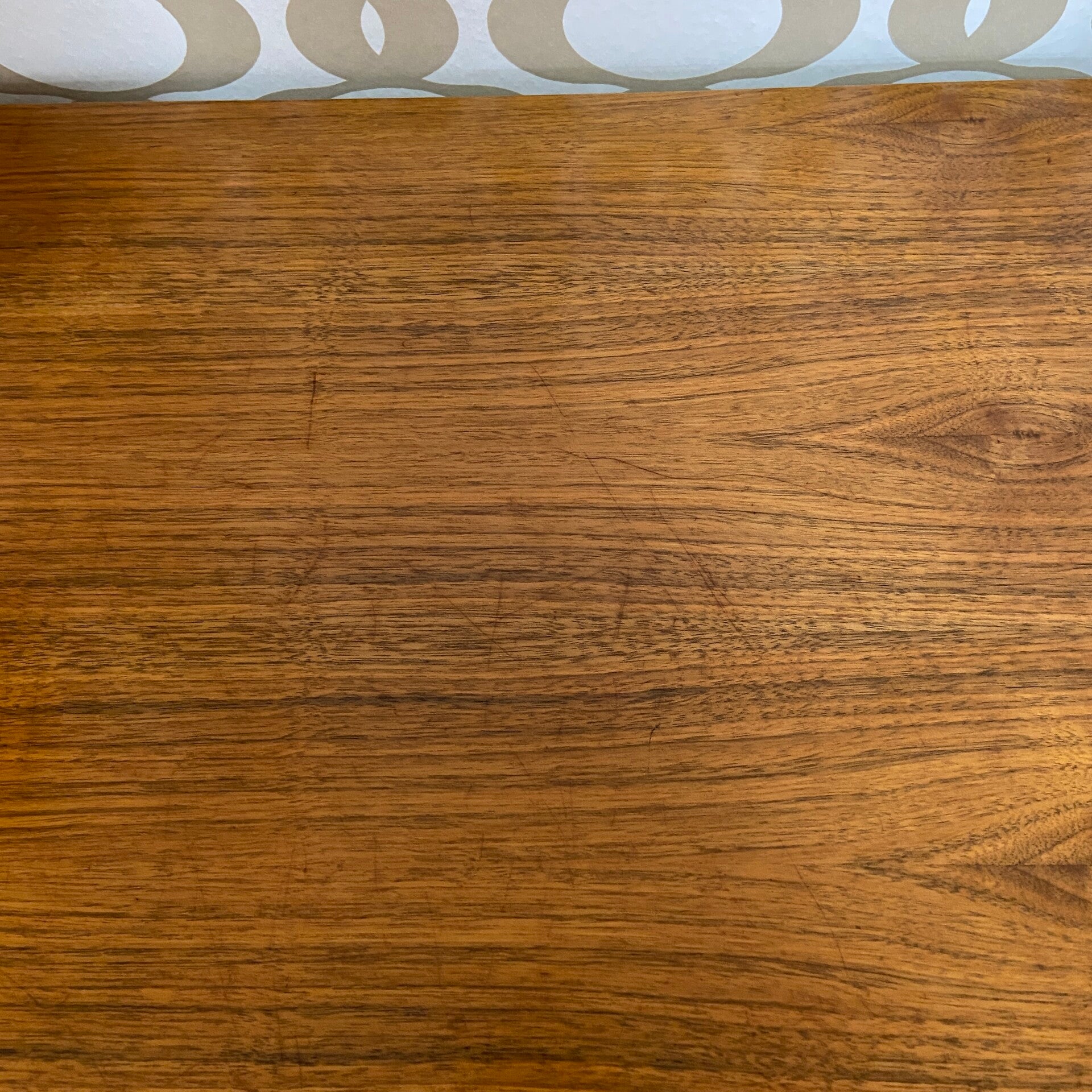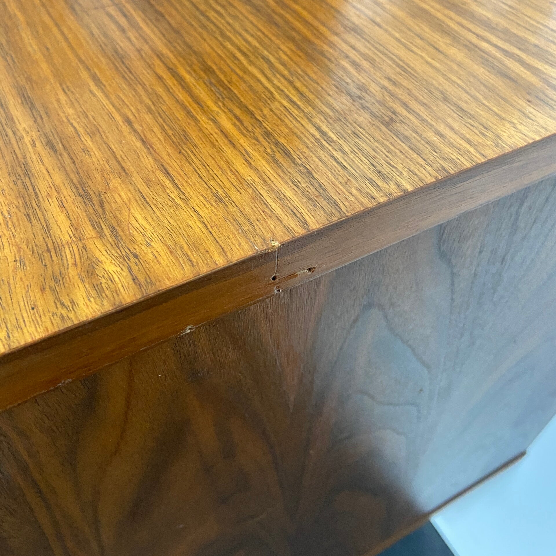 Mooi strak, compact sideboard met een Scandinavische uitstraling, maar gevonden in Duitsland :-) De kast heeft 3 laden met mooie houten handgrepen en 1 kast met deur en originele sleutel. Het fraai gevormde onderstel geeft de kast een stoere, solide uitstraling. Let ook op de mooie houttekening in het warme fineer! De conditie van de kast is goed met wat gebruikssporen op het blad in de vorm van krasjes en een lichte kring. Zie de detailfoto's.