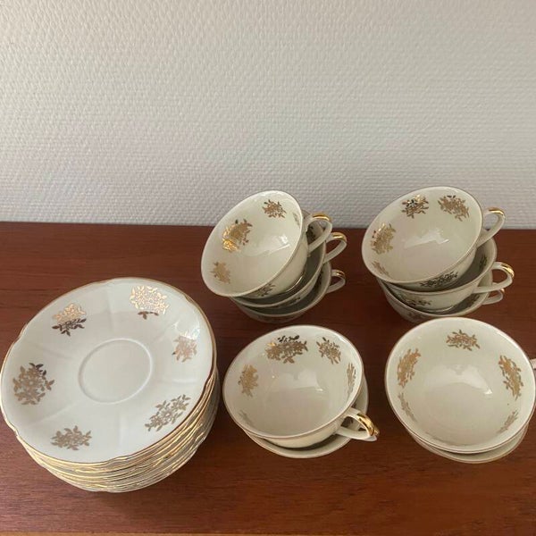 1x theepot, 1x melkkan, 1x suikerpot, 10 kopjes en 11 schotels. 2 kopjes hebben een minichipje en zijn niet meegenomen in de prijsbepaling. Ze kunnen gewoon gebruikt worden hoor. De set verkeert in goede staat met gebruikssporen die passen bij de leeftijd, maar geen breuk e.d.