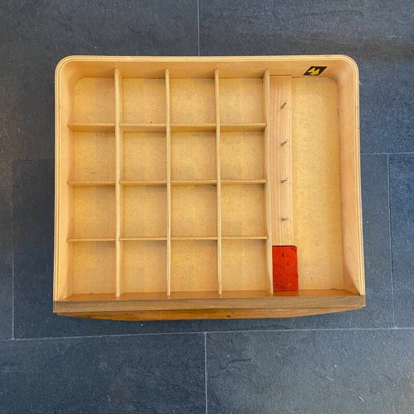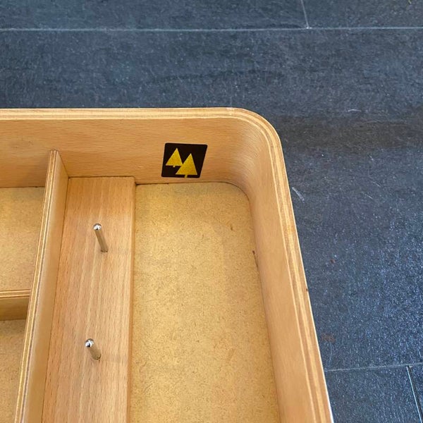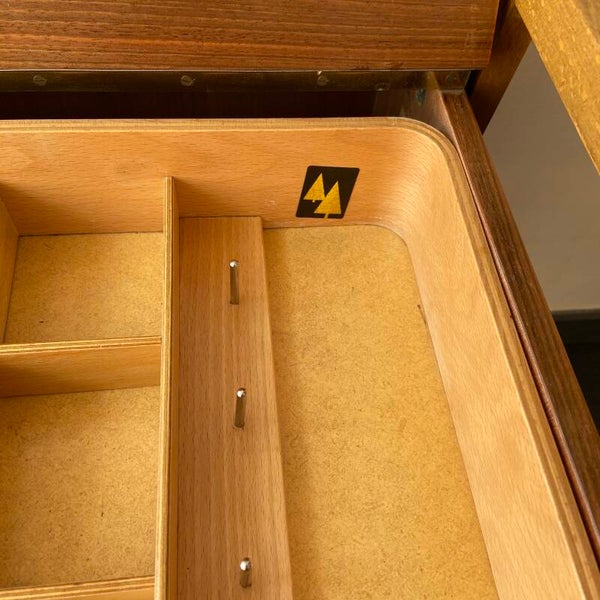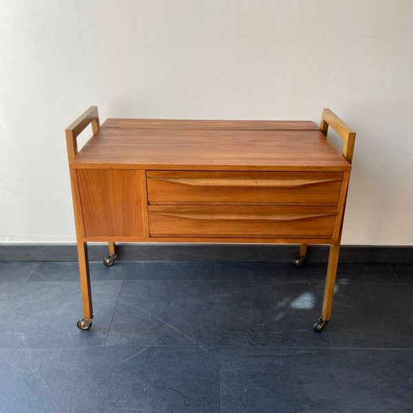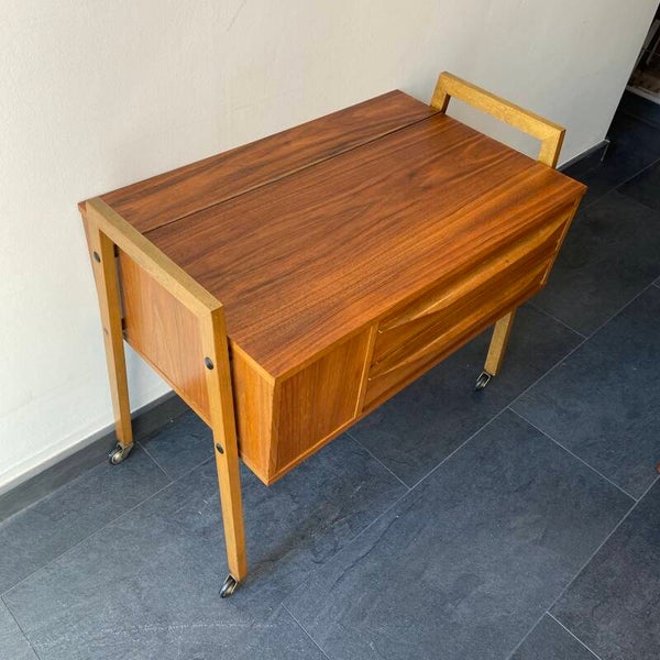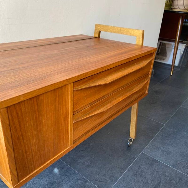 Bijzonder mooi naai-/fourniturenkastje van teakhout. Het kastje staat op wielen en is dus makkelijk te verplaatsen. Aan de bovenkant zit een klep die geopend kan worden waardoor je meteen zicht hebt op de inhoud van de bovenste lade. Bijzonder zijn de sierlijke rondingen in de laden en het materiaalgebruik. Het ranke frame en de sierlijke vormgegeven handgrepen maken het kastje een sieraad in huis. Natuurlijk kan het kastje ook gebruikt worden voor andere doeleinden, zoals bijzettafel, make-up kastje, hobbykastje of als nachtkast. De staat van de kast is zeer goed.