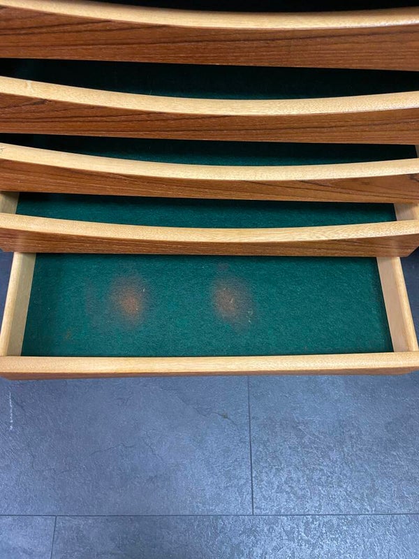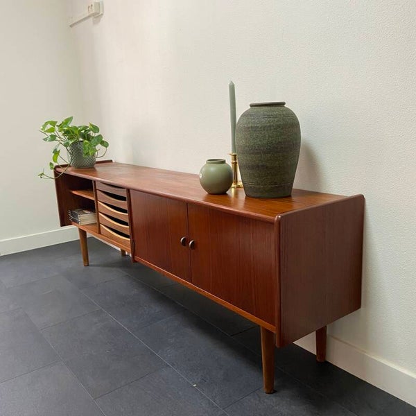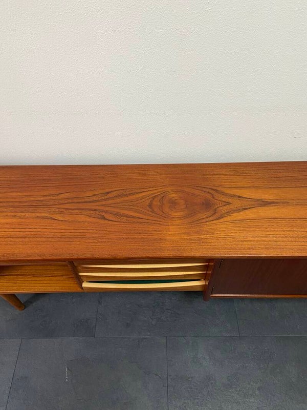 Verrassend uitgevoerd Deens dressoir! Een ondiep dressoir dat luchtig oogt doordat het links een open deel heeft met een plank. De vijf laden met vilt bieden veel opbergruimte. Het linkerdeel met 2 deuren bevat een bar met glazen achterwand van bewerkt glas. Het dressoir is uitgevoerd in warm teakhout met een mooie houttekening. Links is op het blad een nauwelijks zichtbare kring aanwezig. In de onderste lade zijn wat verkleuringen in het vilt aanwezig.