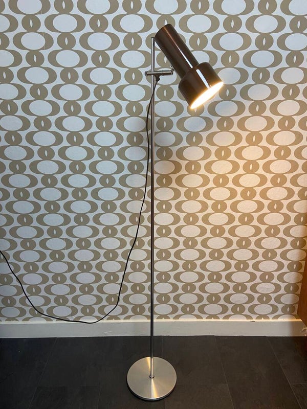 Mooie blikvanger! Deze vintage vloerlamp heeft een ranke vormgeving waardoor hij niet veel ruimte vraagt. De metalen kap is in hoogte verstelbaar en kan ook in de gewenste richting worden gedraaid. De lamp verkeert in mooie vintage staat en heeft op de voet gebruikssporen in de vorm van krasjes. De stekker is vervangen.