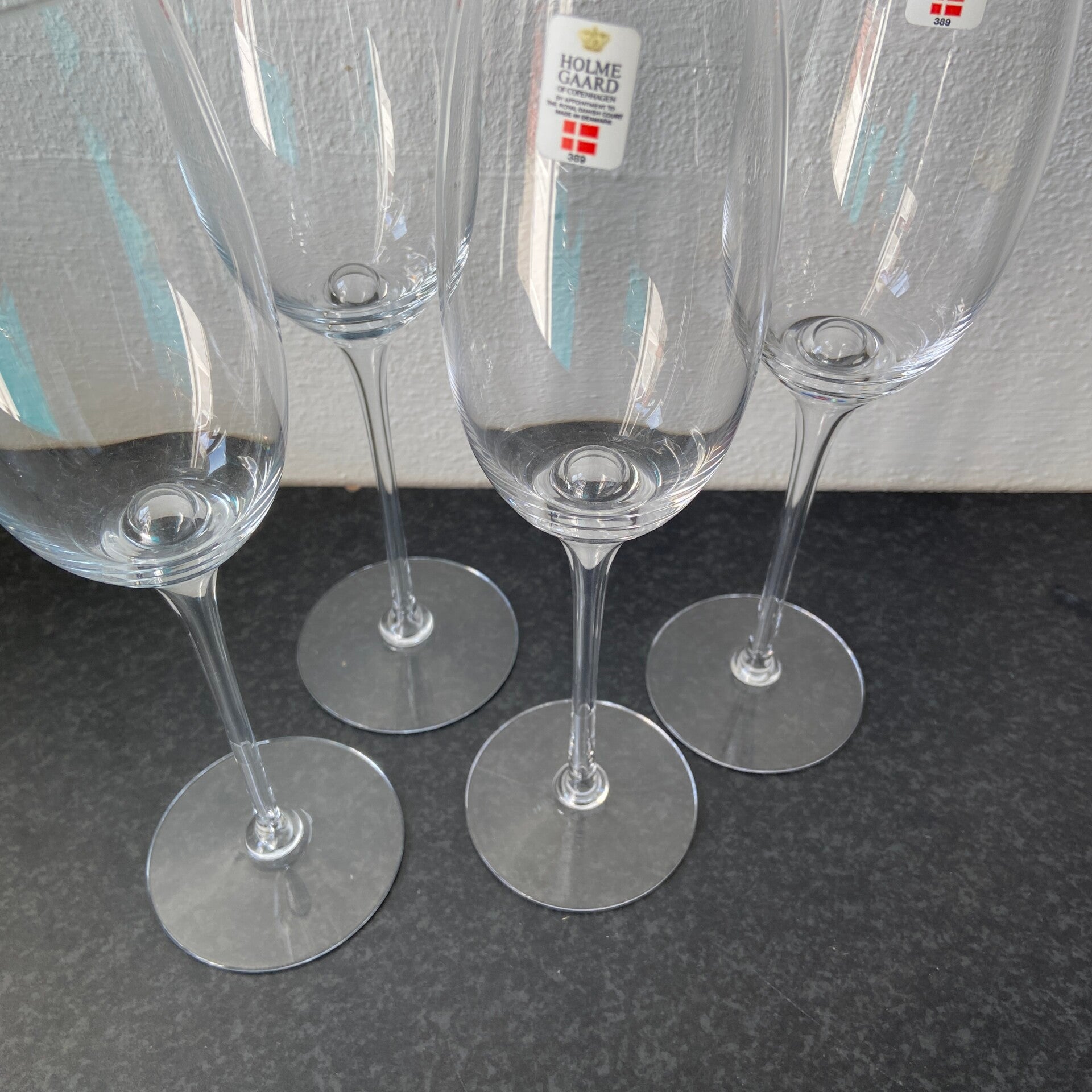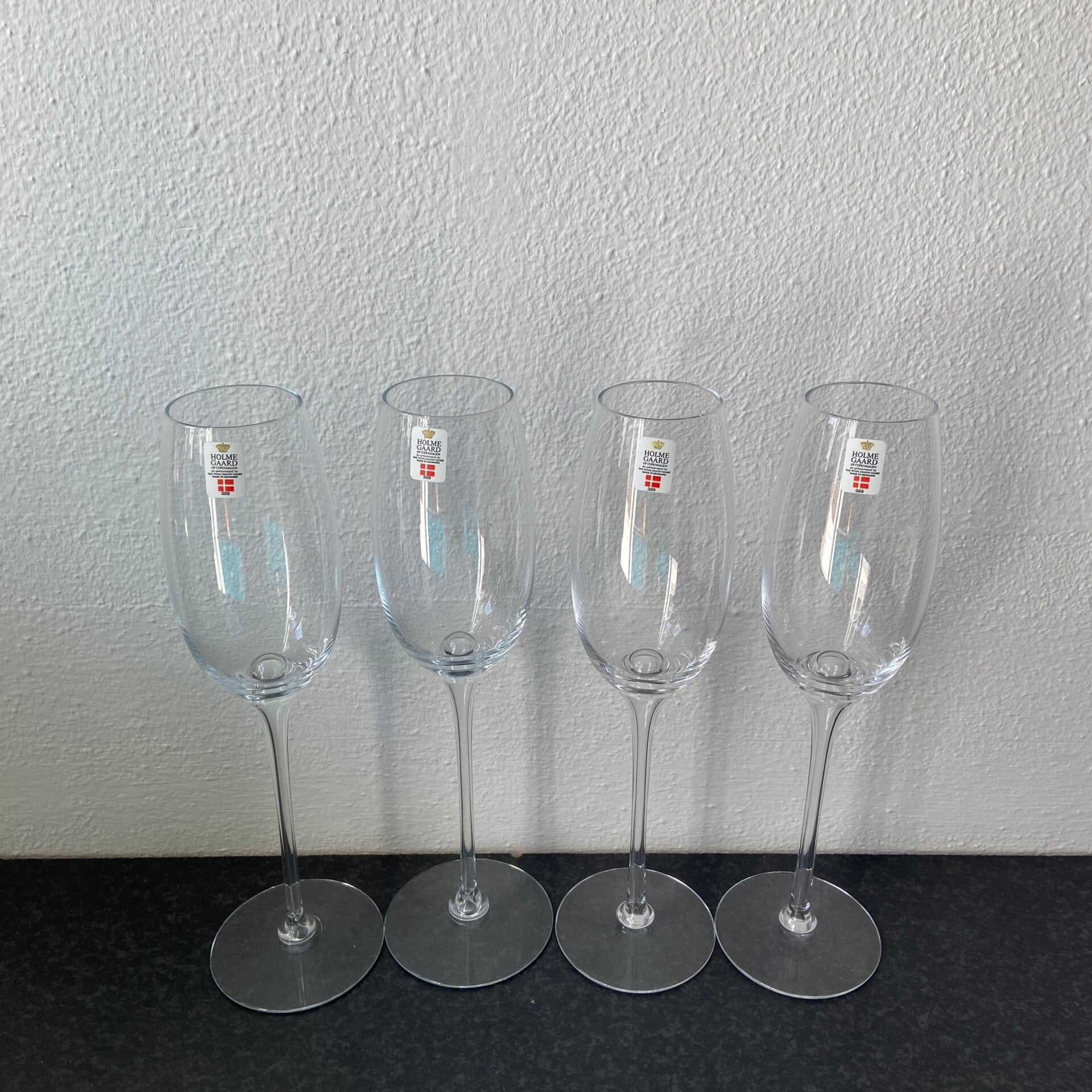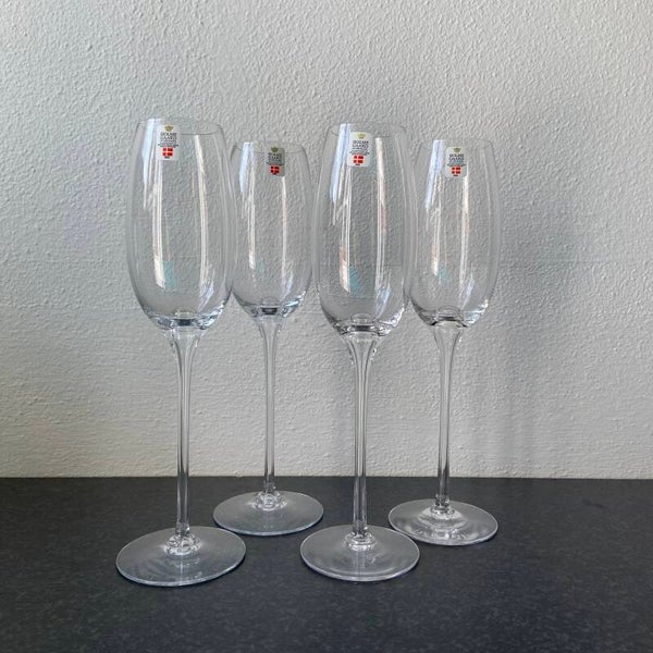 Set van 4 Deense design glazen van Holmegaard; ideaal voor feestelijke bubbels. Afmetingen: H25,5 cm.