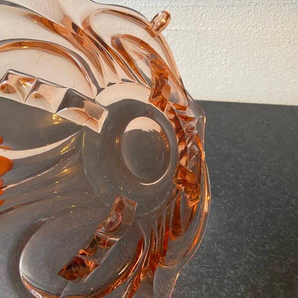 Fantastische schaal in roze persglas, erg mooi bewerkt en in zeer goede staat! De schaal is ontworpen door August Walther en Söhne en staat bekend als model 'Irene'.