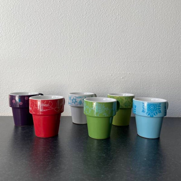 Set van 6 retro koffiekopjes in div. kleuren met houder