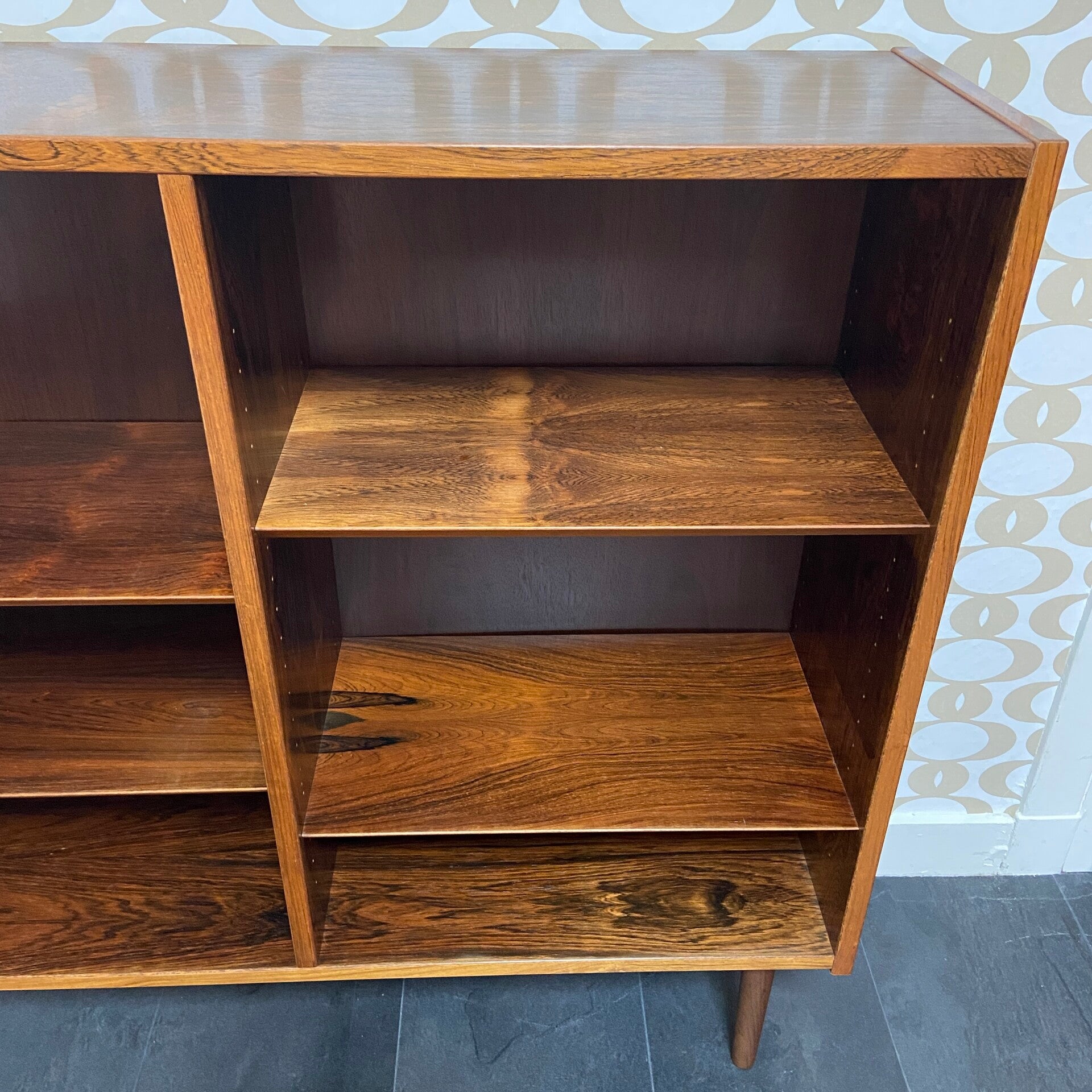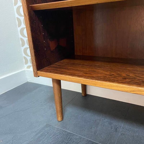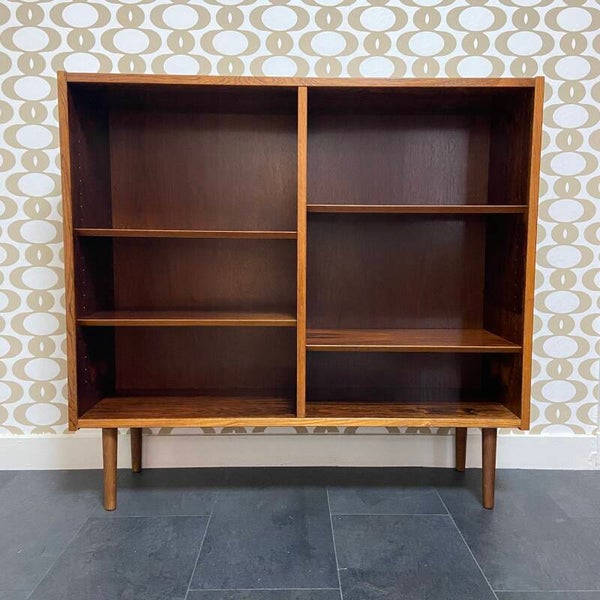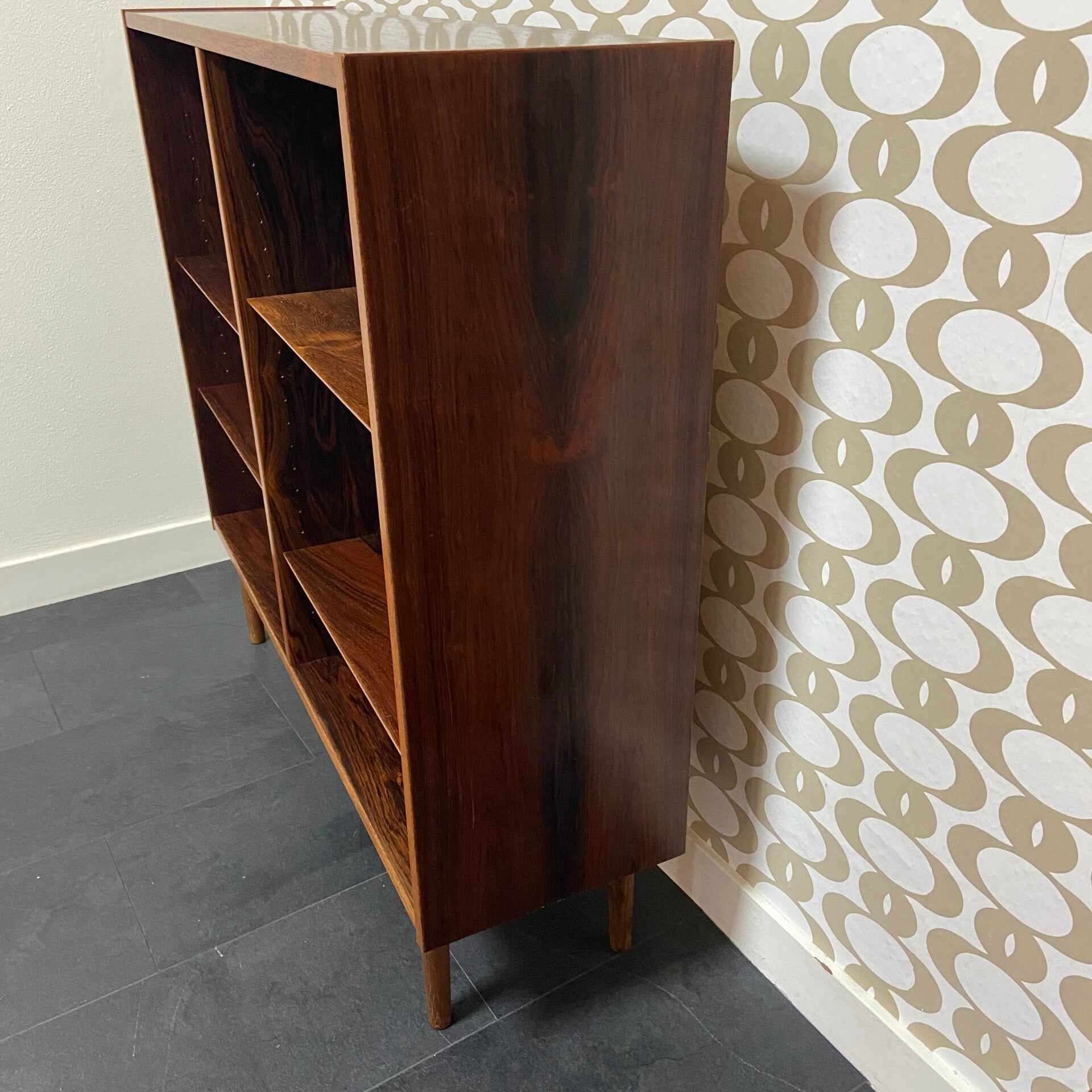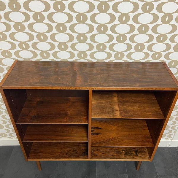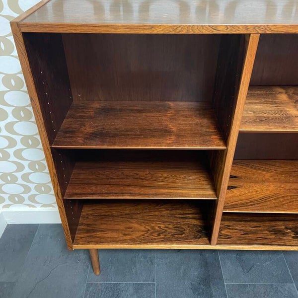 Prachtige Deens design van Hundevad! Deze boekenkast is gemaakt van palissanderfineer; een warme roodbruine houtsoort met een donkere houttekening. De kast heeft in hoogte verstelbare planken die zich onderscheiden door de schuin weglopende randen. Hierdoor krijgt de strakke kast een elegante uitstraling. De kast verkeert in mooie staat met hier en daar wat oppervlakkige gebruikssporen, passend bij de leeftijd.