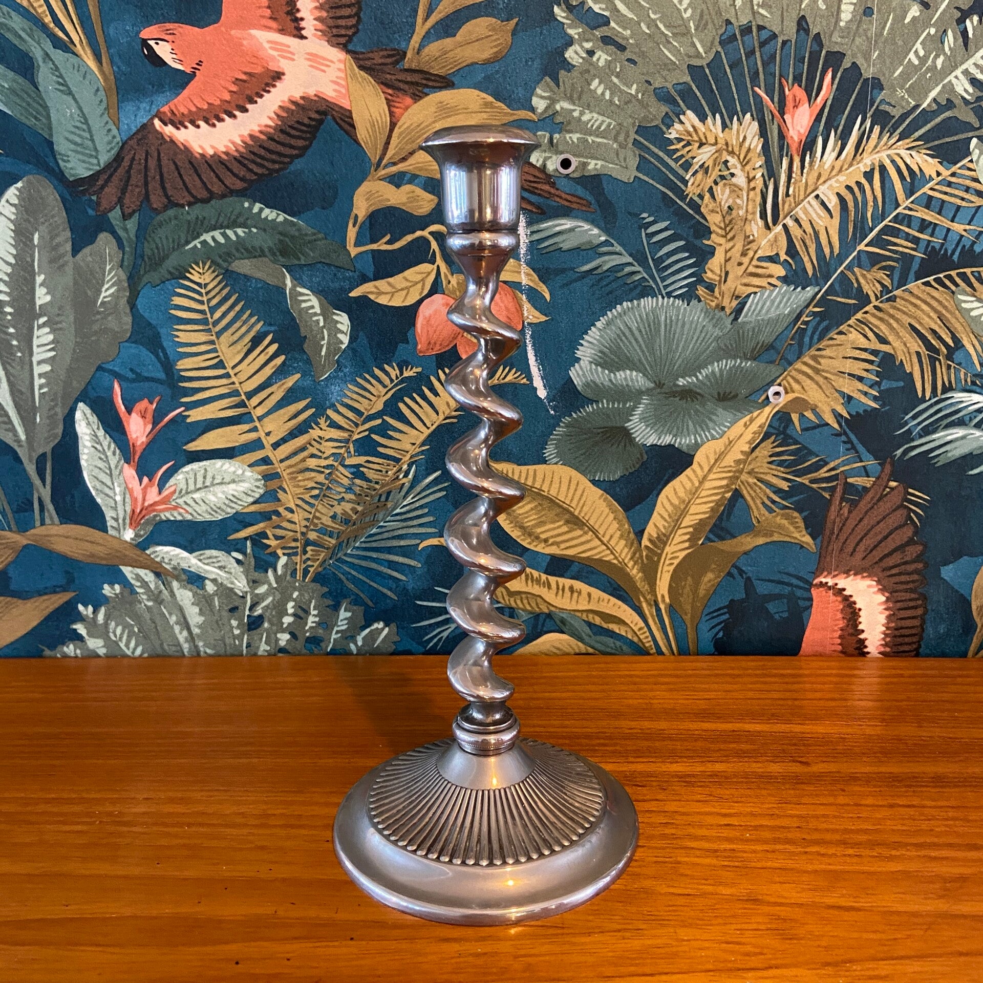 Eye catcher! Bijzondere kandelaar met een gedraaide steel en bewerkte voet. De kandelaar is zeer stevig en van zware kwaliteit.