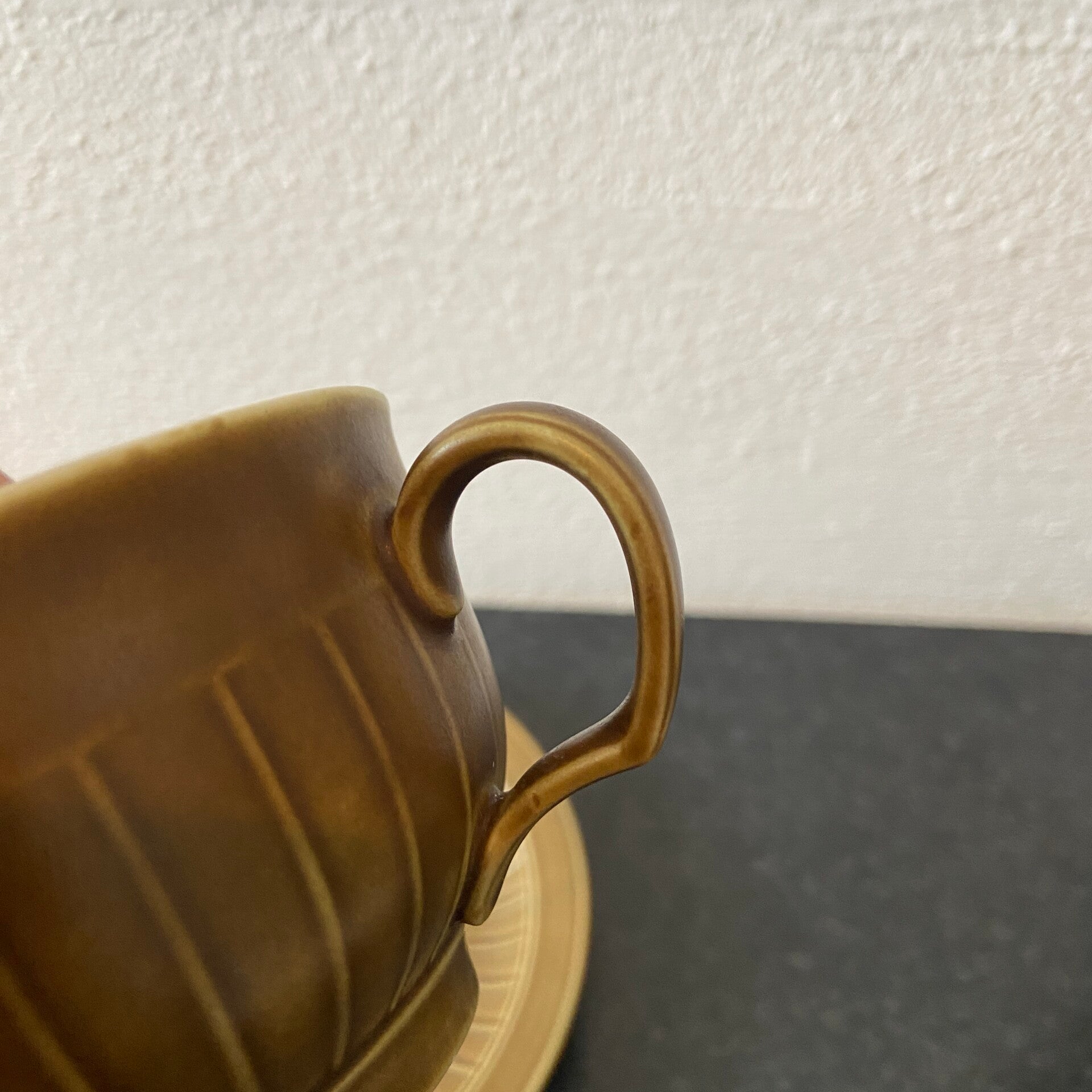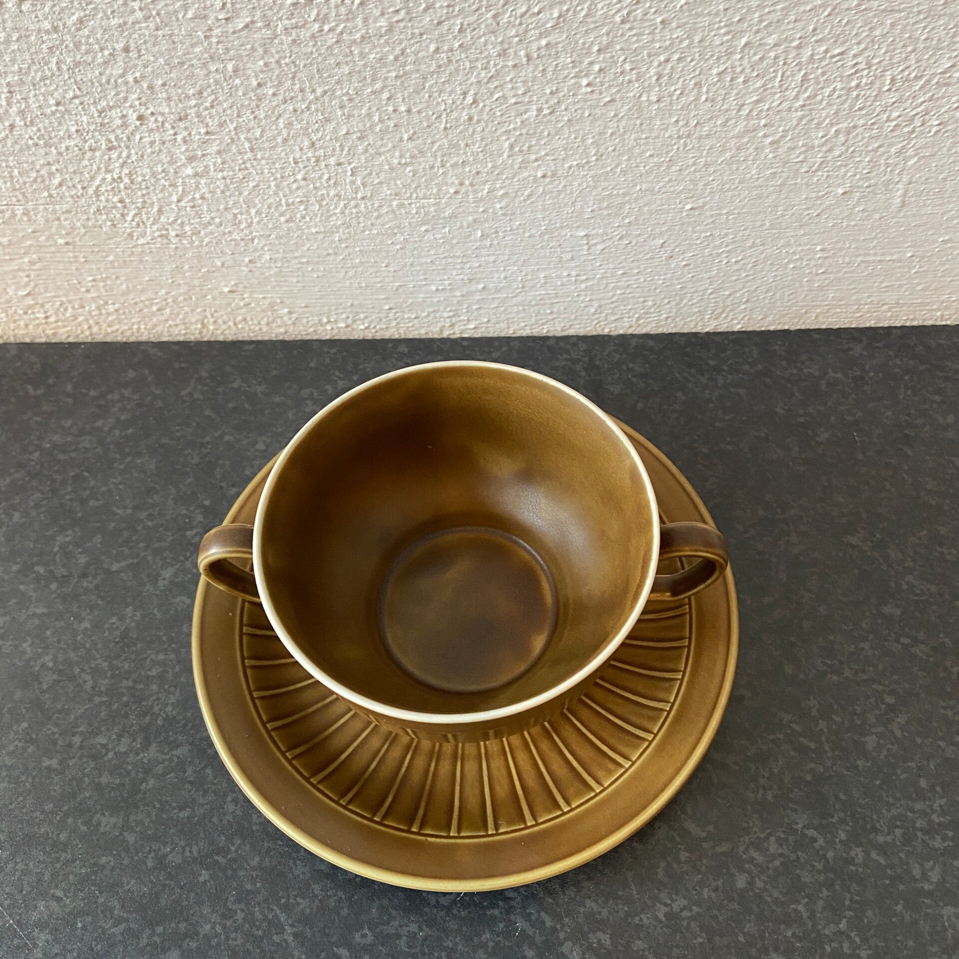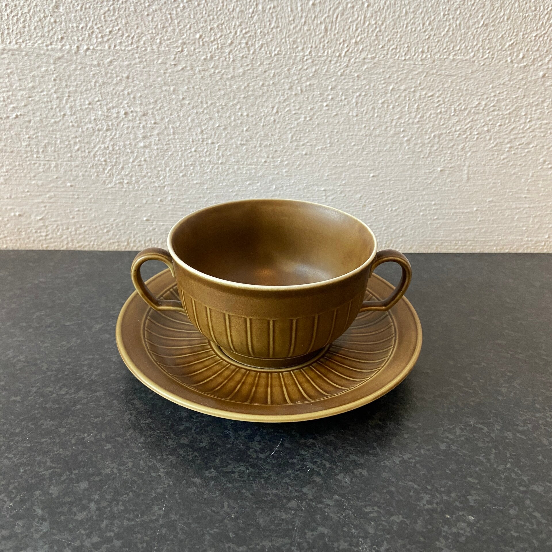 Set van 6 vintage West Germany soepkommen met schotel in perfecte staat! De set is uitgevoerd in een mooie aardse bruin/groene kleur en subtiel met verticale lijnen bewerkt. De set is gemerkt.