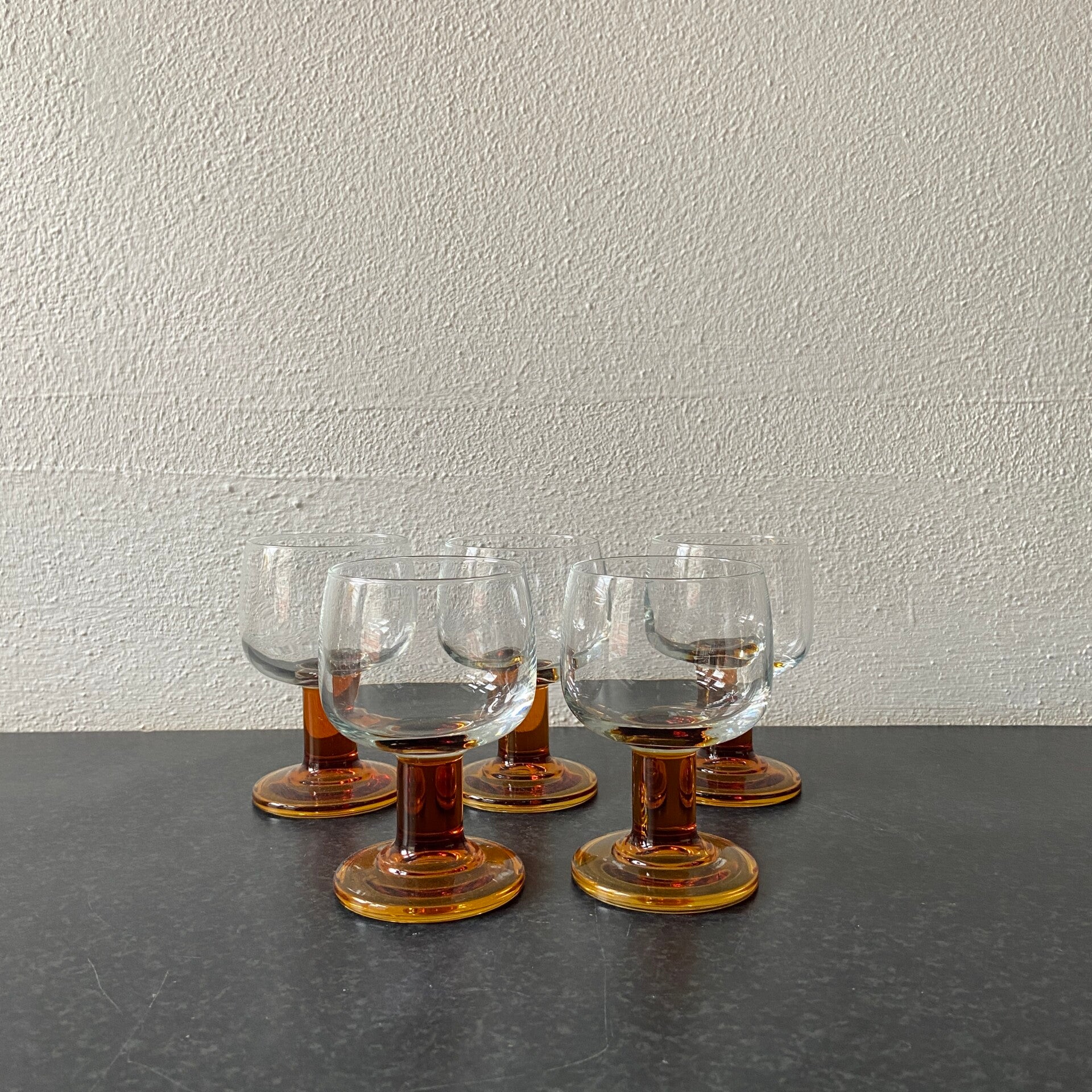 Zeer mooie set kleine wijnglazen op amberkleurige voet uit Frankrijk in perfecte staat.