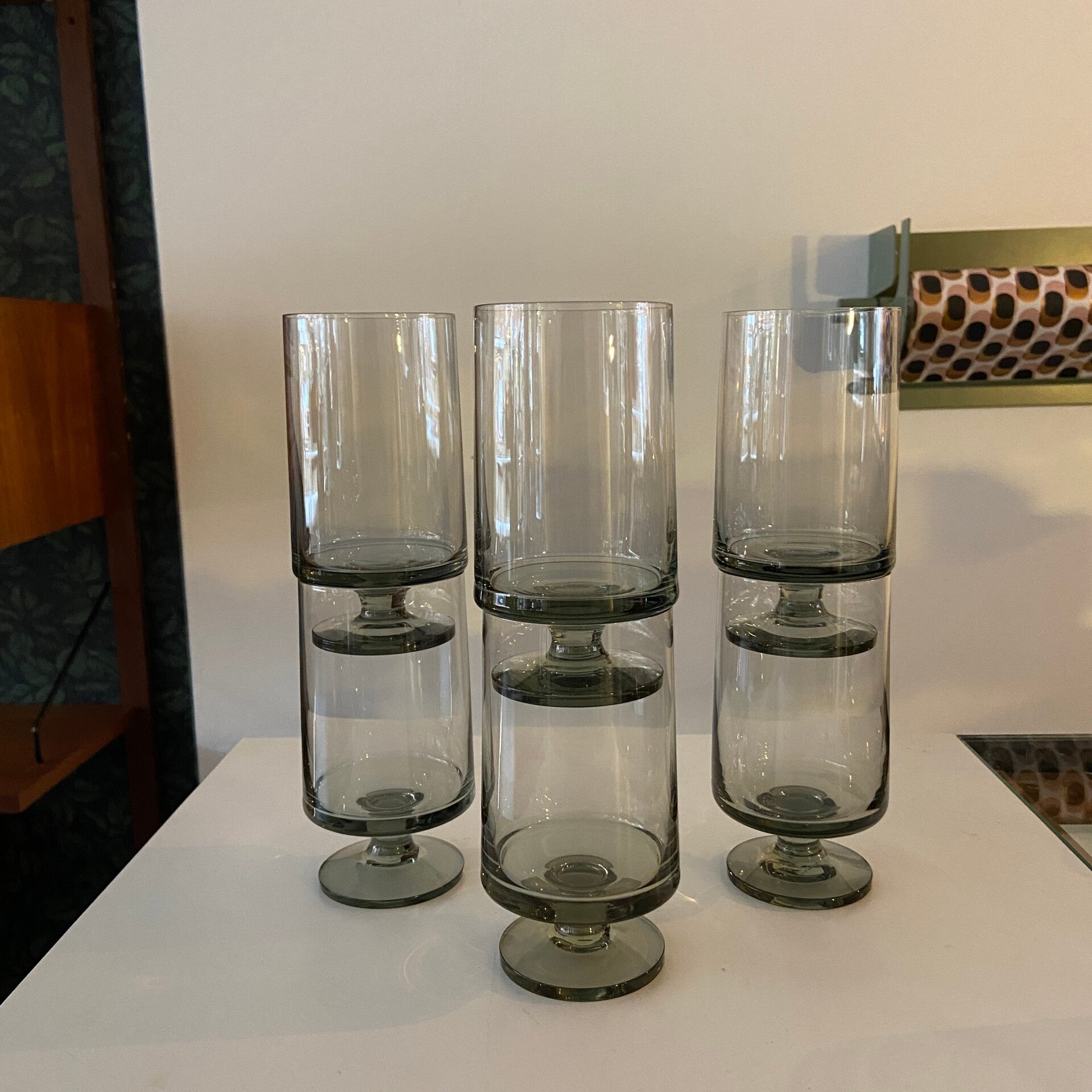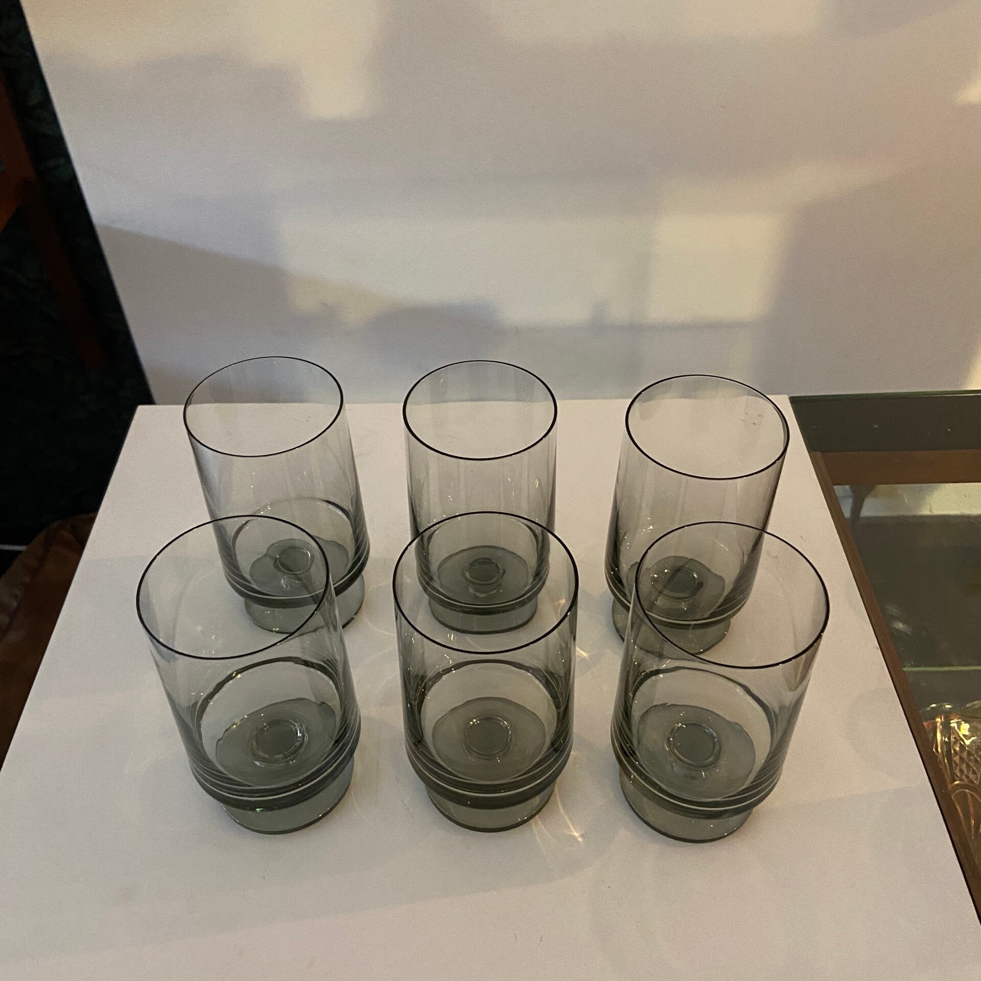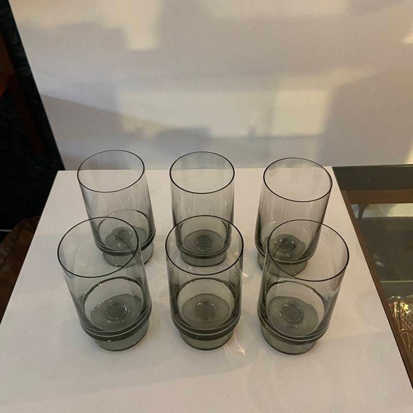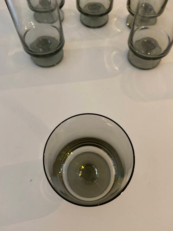 Deze mooie glazen zijn onderdeel van de STUB-serie, ontworpen door Grethe Meyer en Ibi Trier Mørch in de jaren 60. De glazen zijn gemaakt van grijs rookglas en uitgevoerd in een kenmerkend strak design. De glazen zijn stapelbaar, dus ruimtebesparend. De conditie is uitstekend.