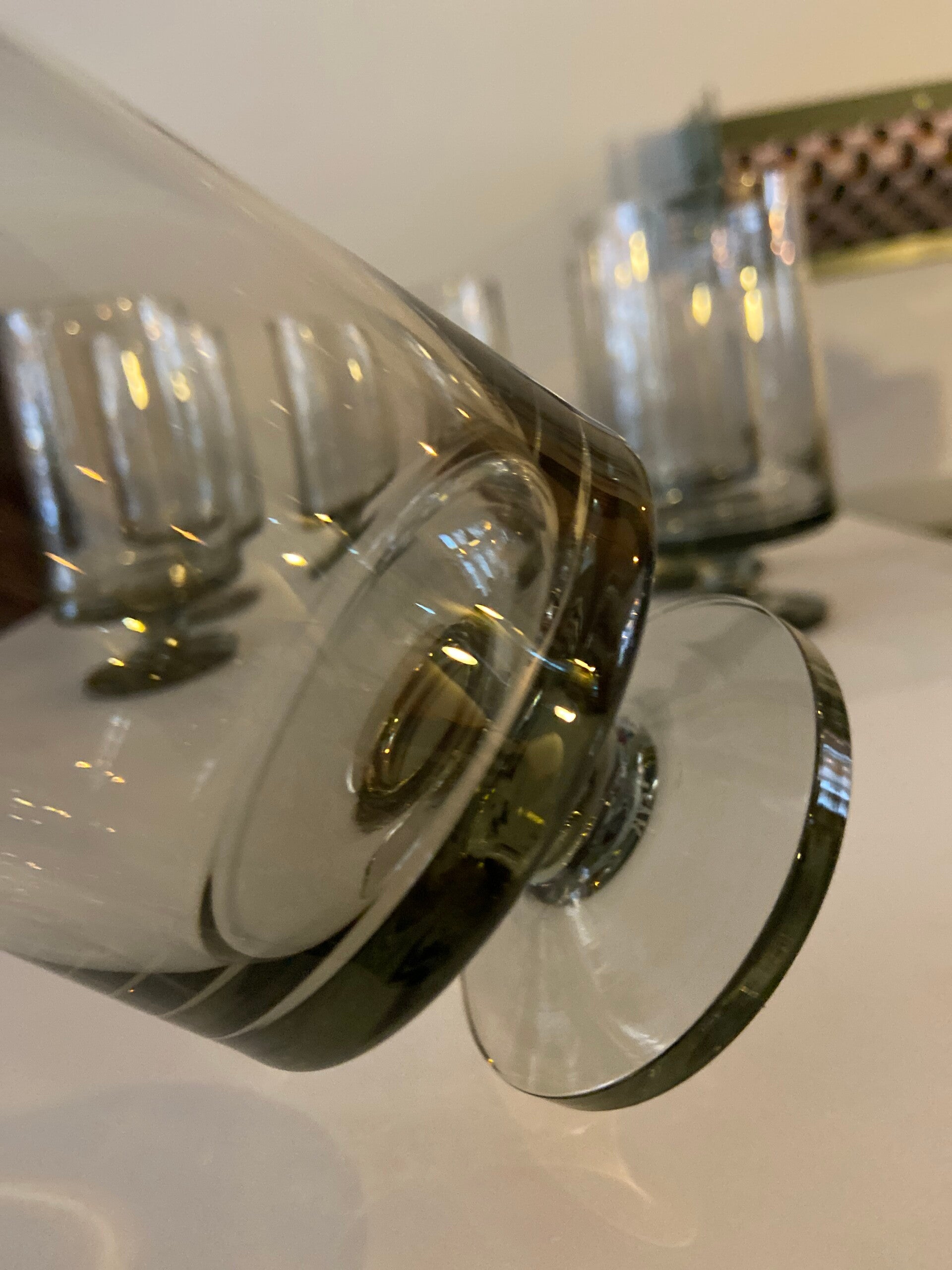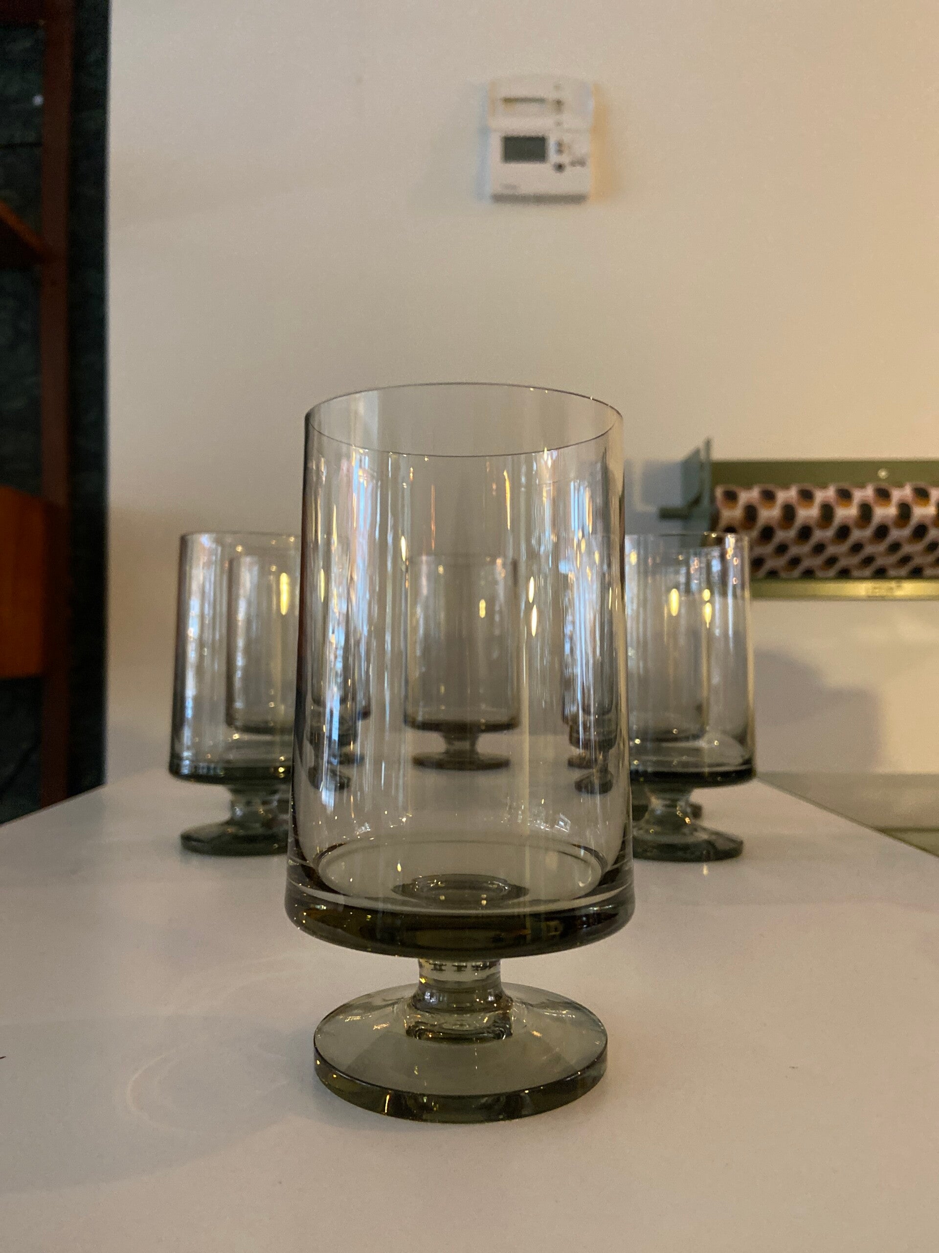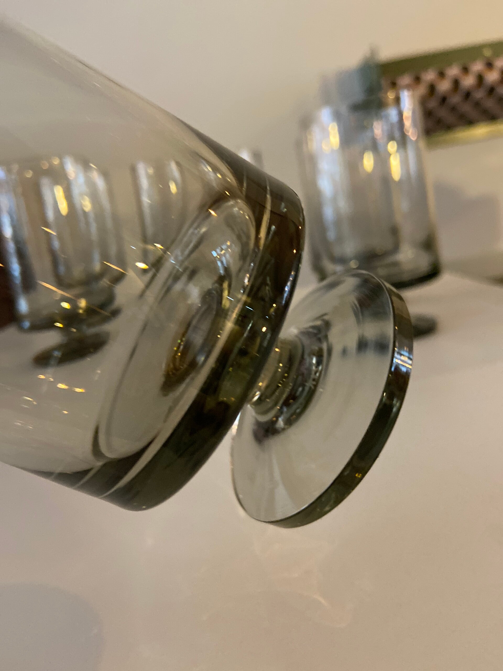 Deze mooie glazen zijn onderdeel van de STUB-serie, ontworpen door Grethe Meyer en Ibi Trier Mørch in de jaren 60. De glazen zijn gemaakt van grijs rookglas en uitgevoerd in een kenmerkend strak design. De glazen zijn stapelbaar, dus ruimtebesparend. De conditie is uitstekend.
