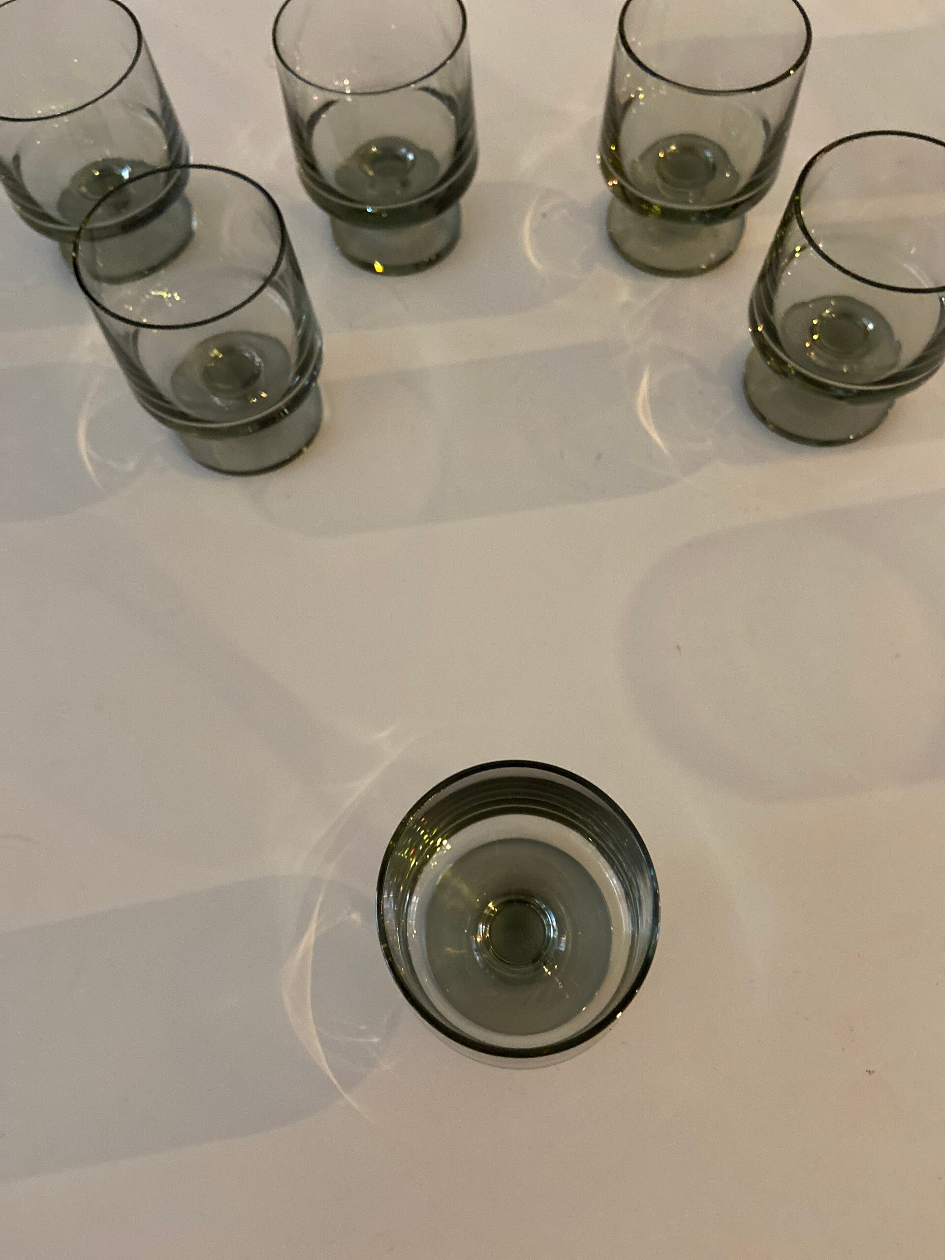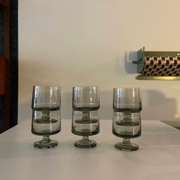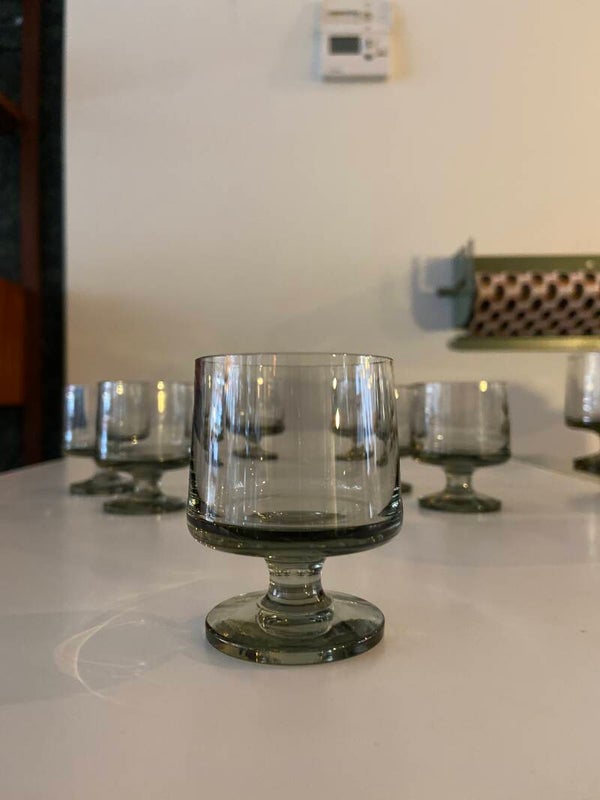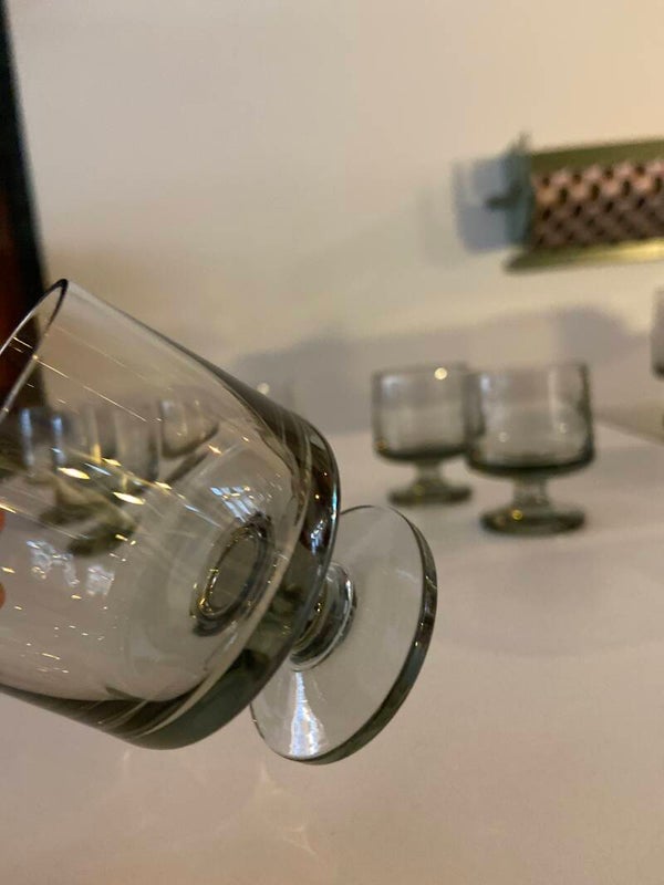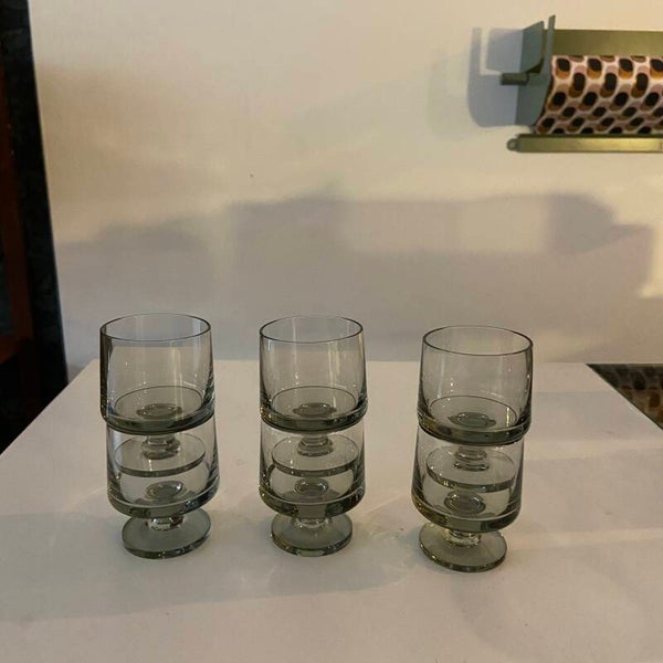 Deze mooie glazen zijn onderdeel van de STUB-serie, ontworpen door Grethe Meyer en Ibi Trier Mørch in de jaren 60. De glazen zijn gemaakt van grijs rookglas en uitgevoerd in een kenmerkend strak design. De glazen zijn stapelbaar, dus ruimtebesparend. De conditie is uitstekend.