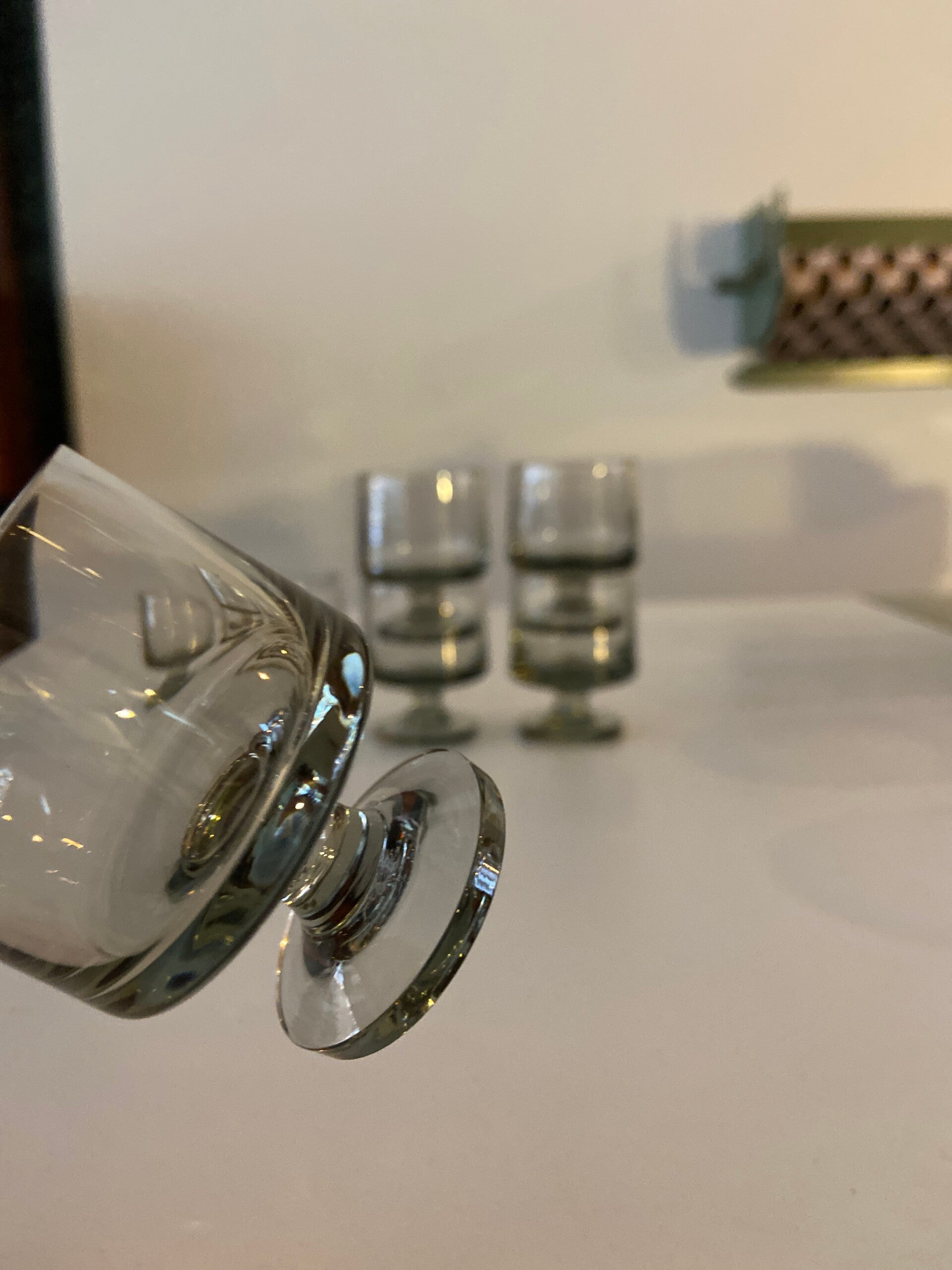 Deze mooie glazen zijn onderdeel van de STUB-serie, ontworpen door Grethe Meyer en Ibi Trier Mørch in de jaren 60. De glazen zijn gemaakt van grijs rookglas en uitgevoerd in een kenmerkend strak design. De glazen zijn stapelbaar, dus ruimtebesparend. De conditie is uitstekend.