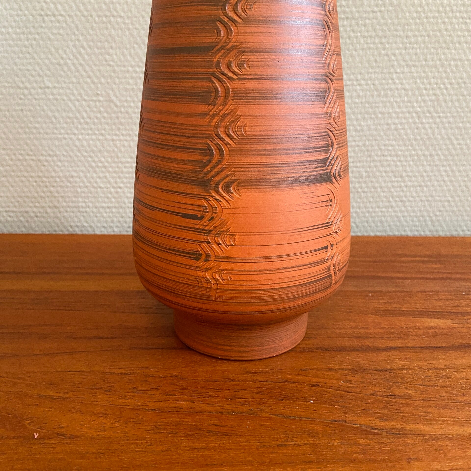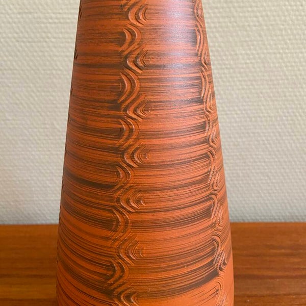 Deze Scheurich vaas is uitgevoerd in mat aardewerk in de kleuren oranje en bruin, de binnenzijde is bruin geglazuurd. De vaas heeft verticale banen met een verfijnd patroon. De staat is goed.