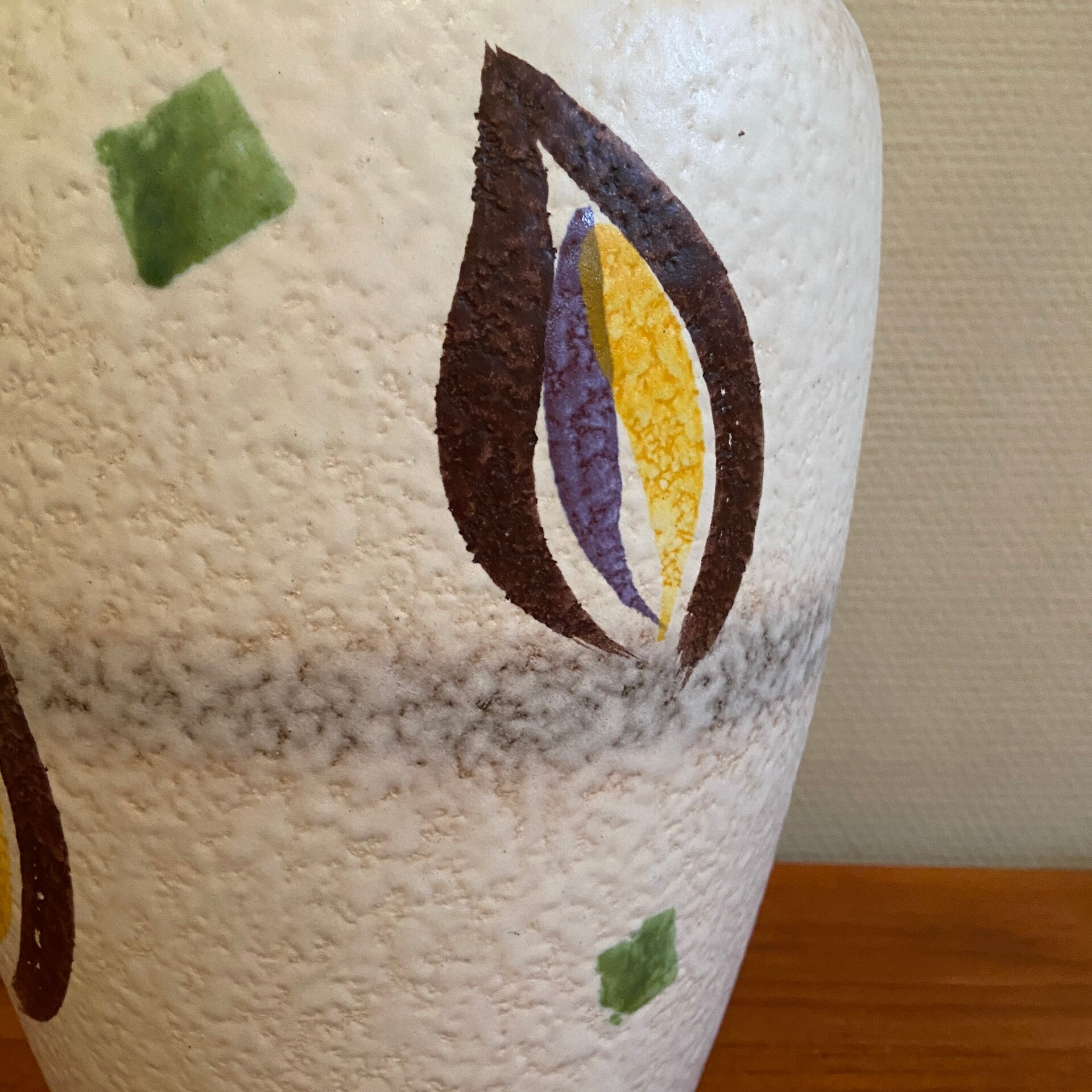 Deze West Germany vaas is uitgevoerd in wit bewerkt aardewerk met handbeschilderde bladeren in geel, zwart en lila. De conditie is goed.