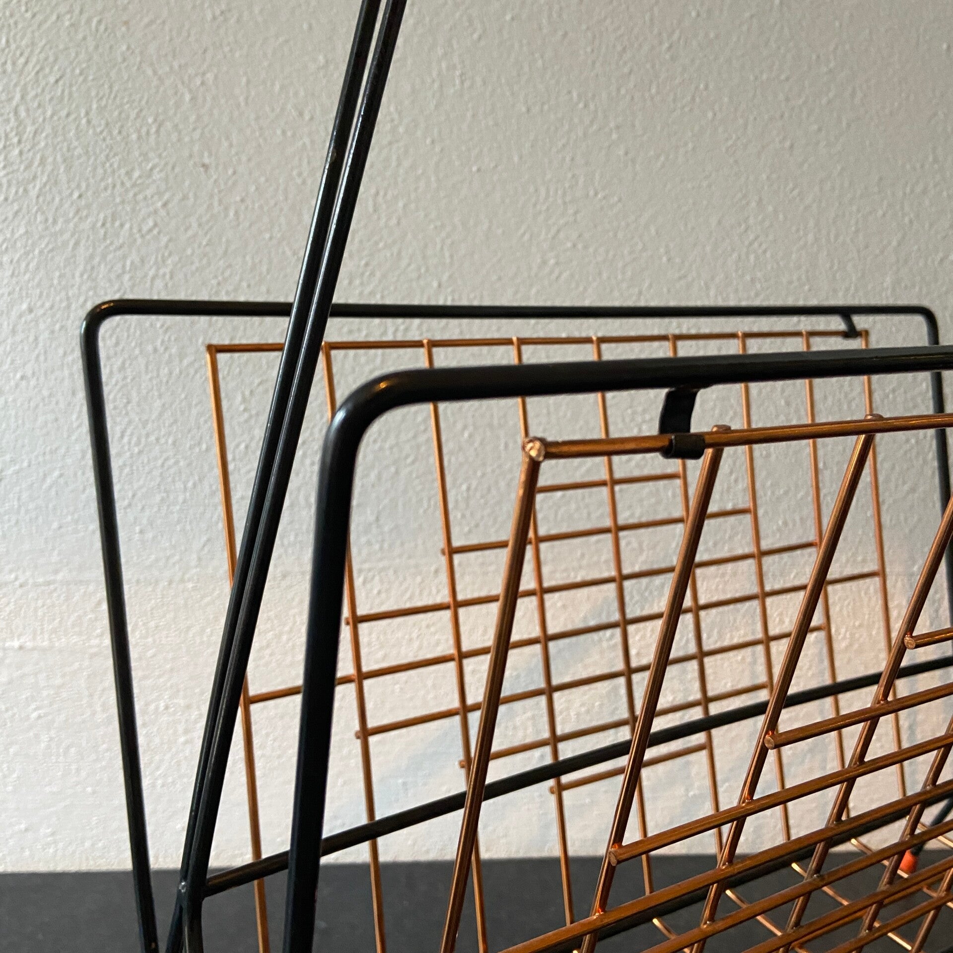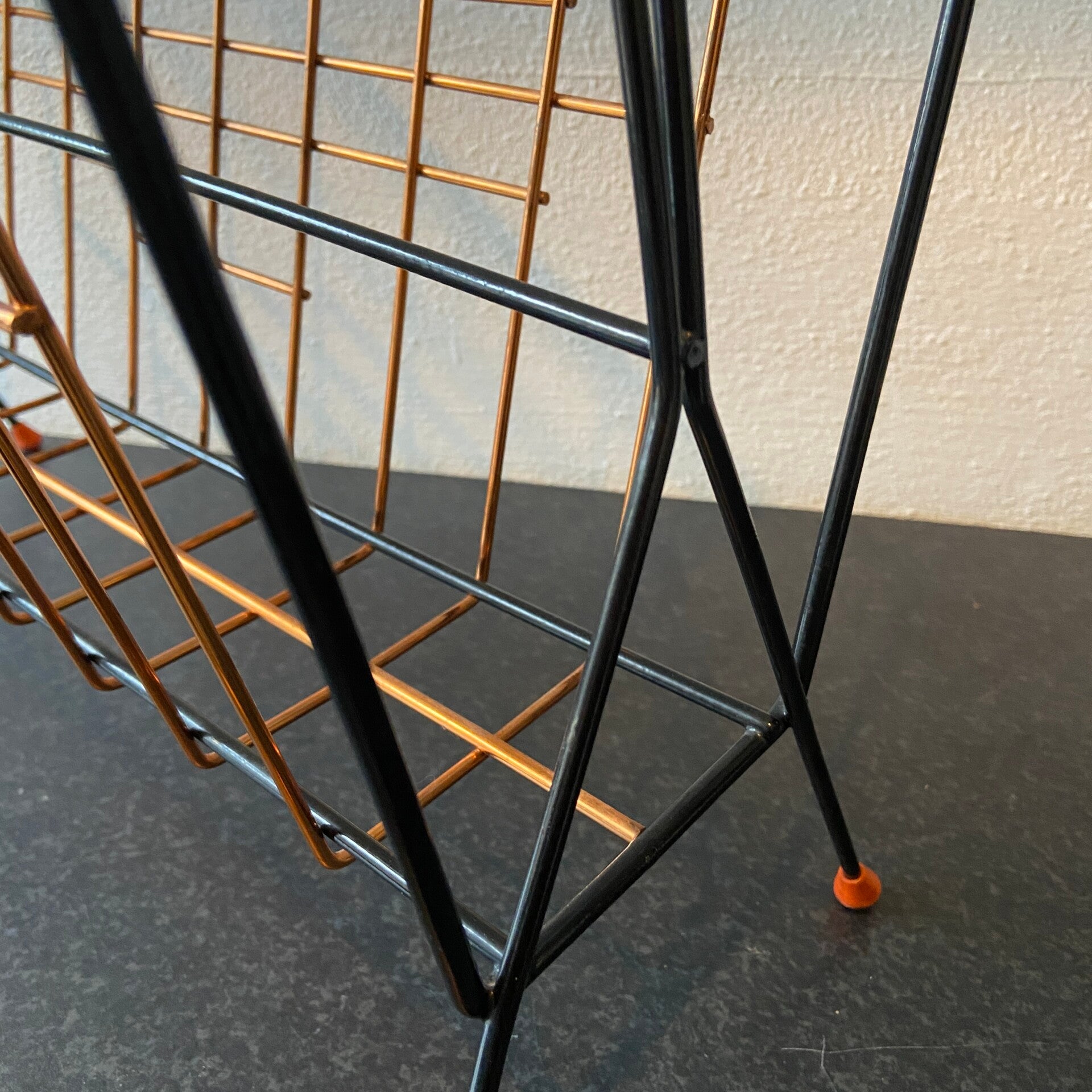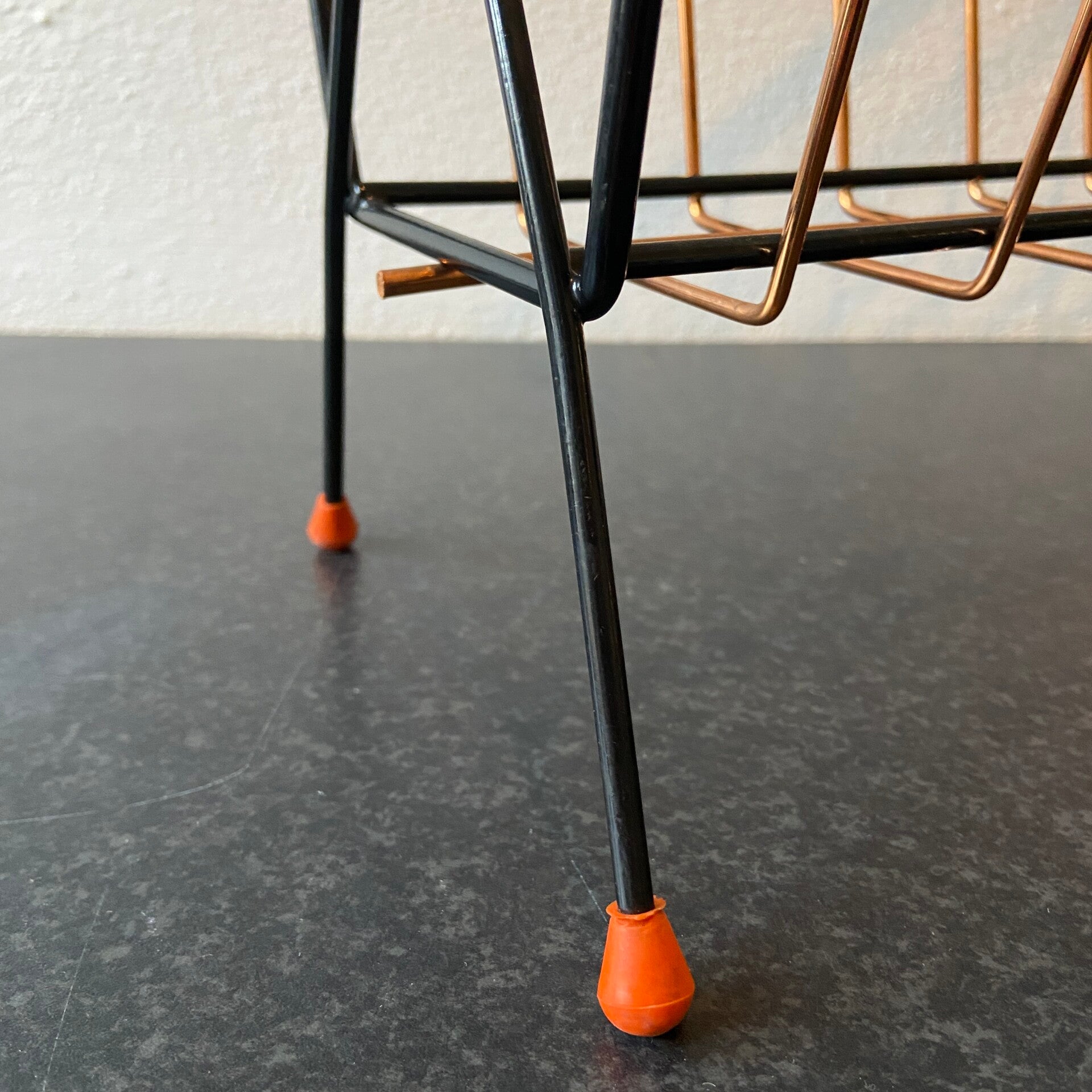 Zeer bijzonder exemplaar lectuurhouder! Deze lectuurhouder is gemaakt van koper met een zwart metalen frame. De houder staat op rode vloerdopjes. De conditie is goed.