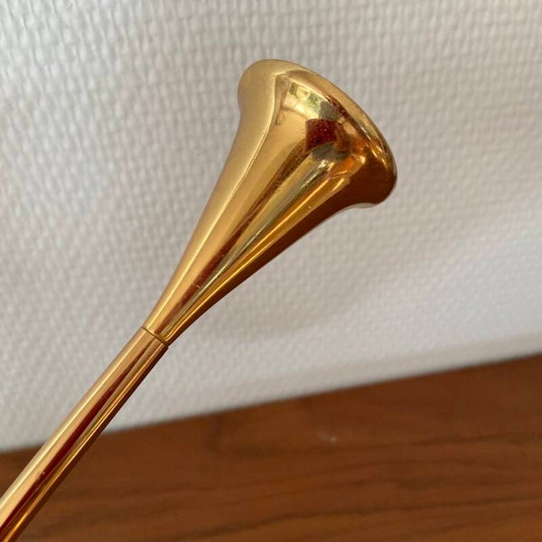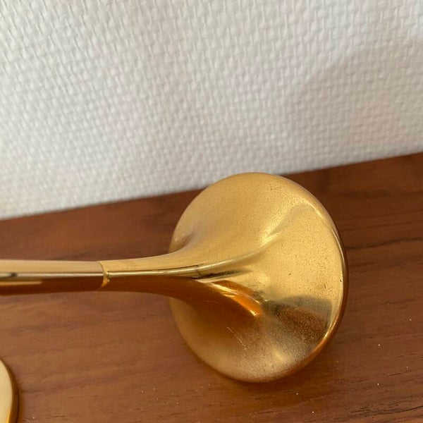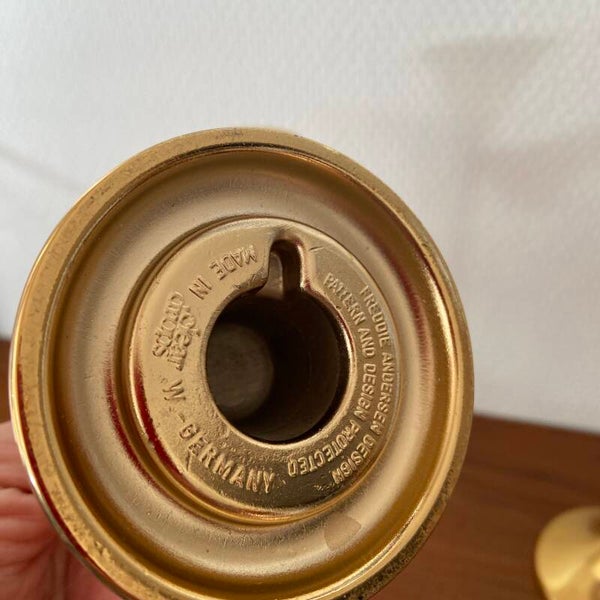 Deze 'clear drops' kandelaren zijn ontworpen door Freddie Andersen en gemaakt in West Germany in de jaren '70. Oorspronkelijk waren het olielampjes, maar de houders van zeer zwaar messing zijn ook goed geschikt als kandelaren. De kandelaren verkeren in mooie staat en zijn alledrie gemerkt aan de onderzijde.