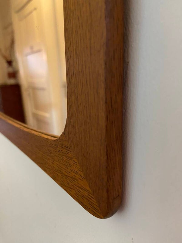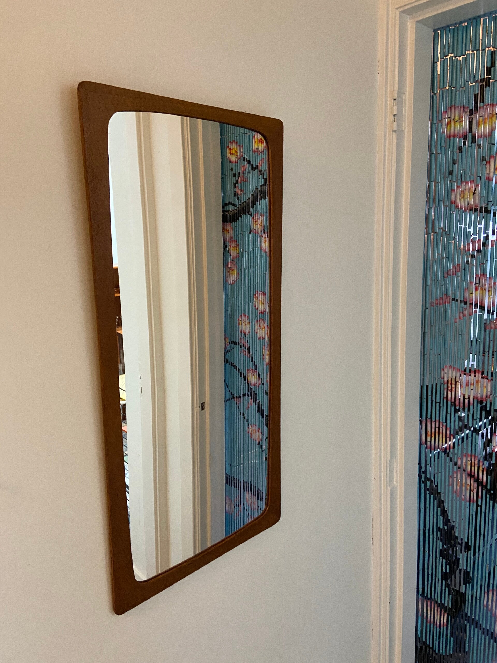 Mooie Deense grote spiegel in teakhouten lijst. De spiegel is in mooie staat.