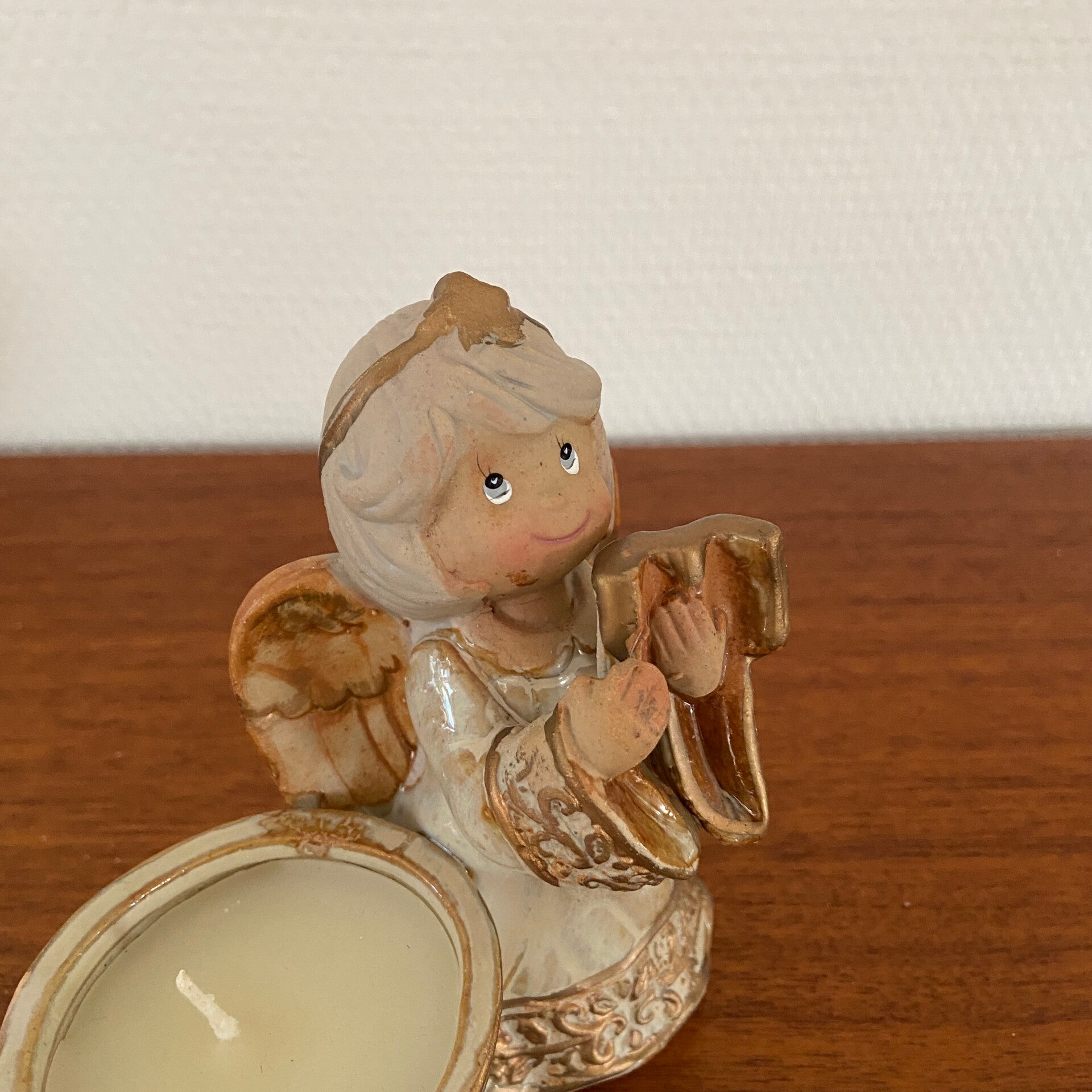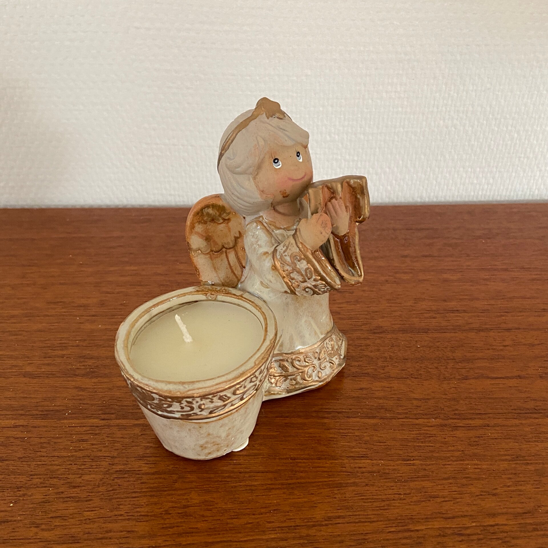 Aardewerk engel in goud/brons tinten met kaars