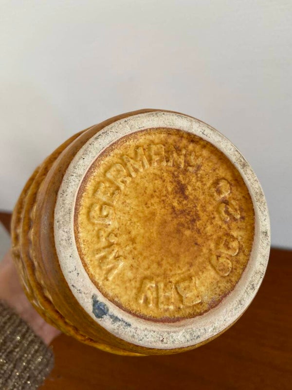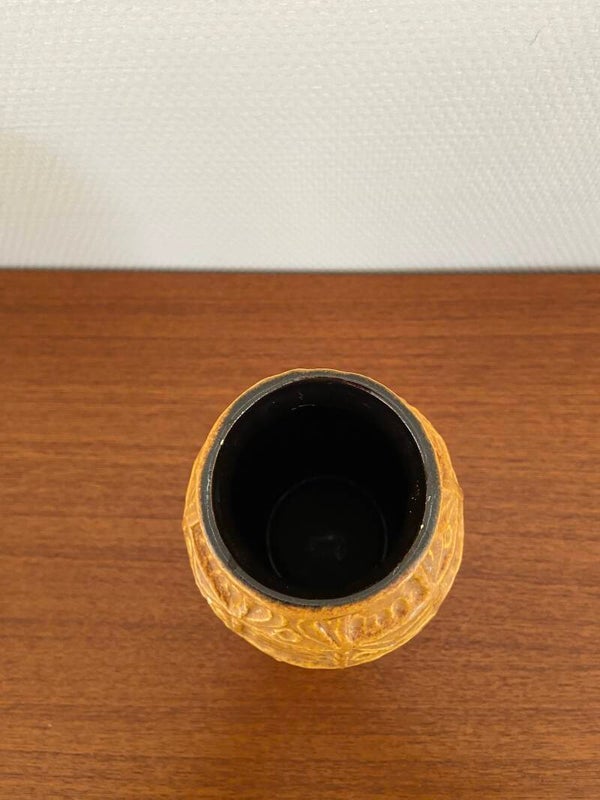 Deze West Germany vaas kom je niet vaak tegen! De vaas is uitgevoerd in geel, mat aardewerk met een rijk bewerkt patroon. De binnenzijde is donkerbruin geglazuurd. De conditie is goed.