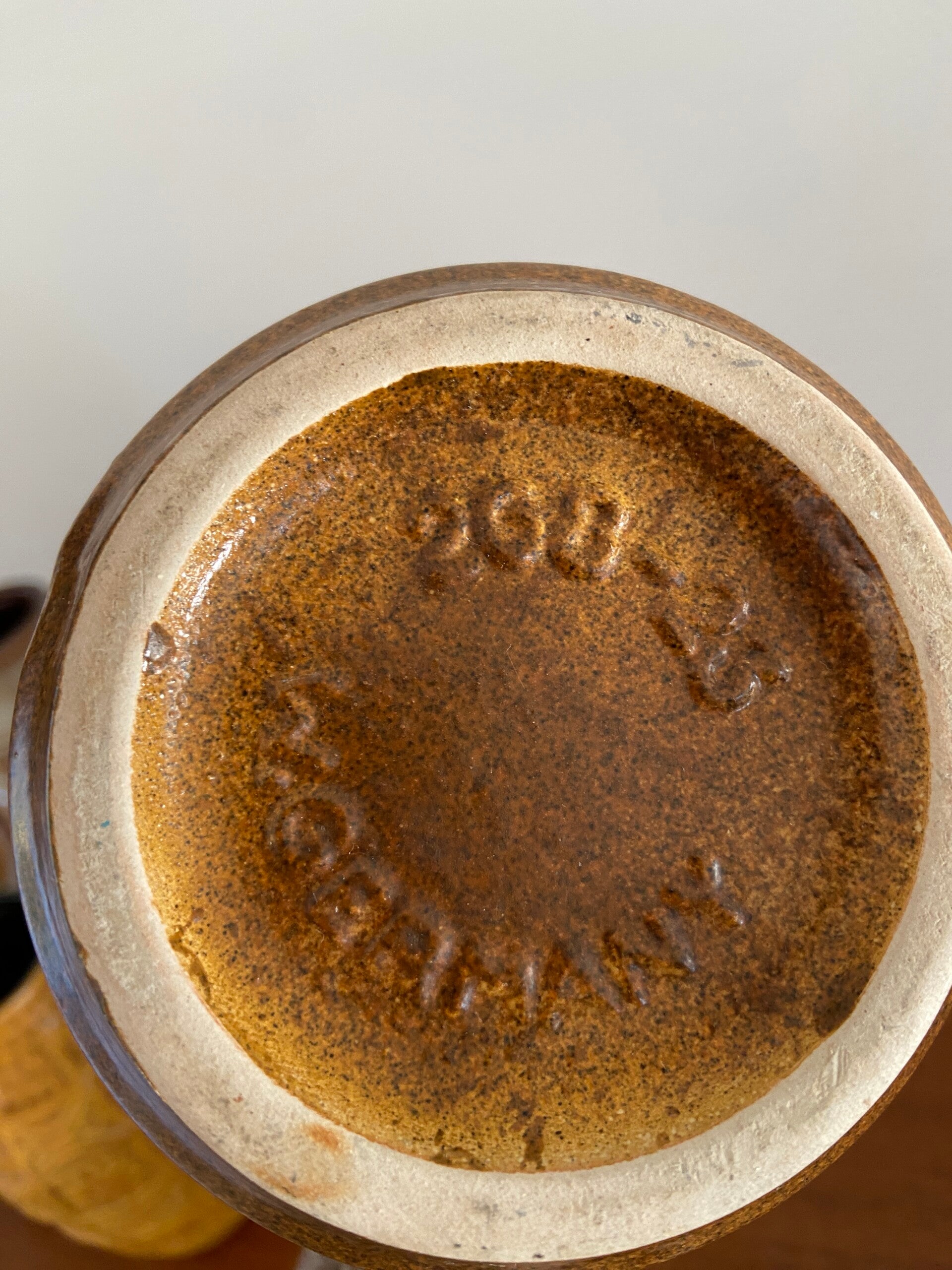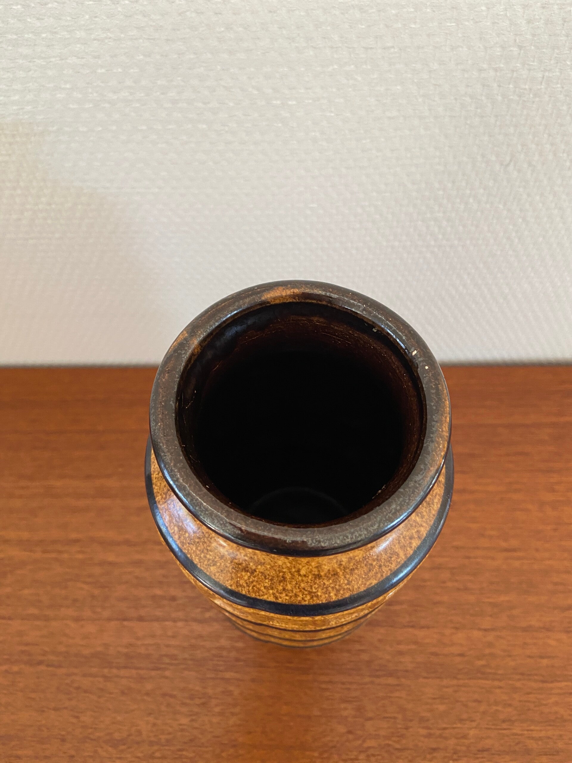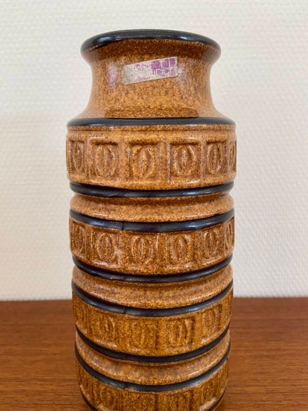 West Germany vaas in warme aardetinten caramel en bruin. De vaas is gedecoreerd met het bekende Tundra motief en aan de binnenzijde donkerbruin geglazuurd. De staat is goed.