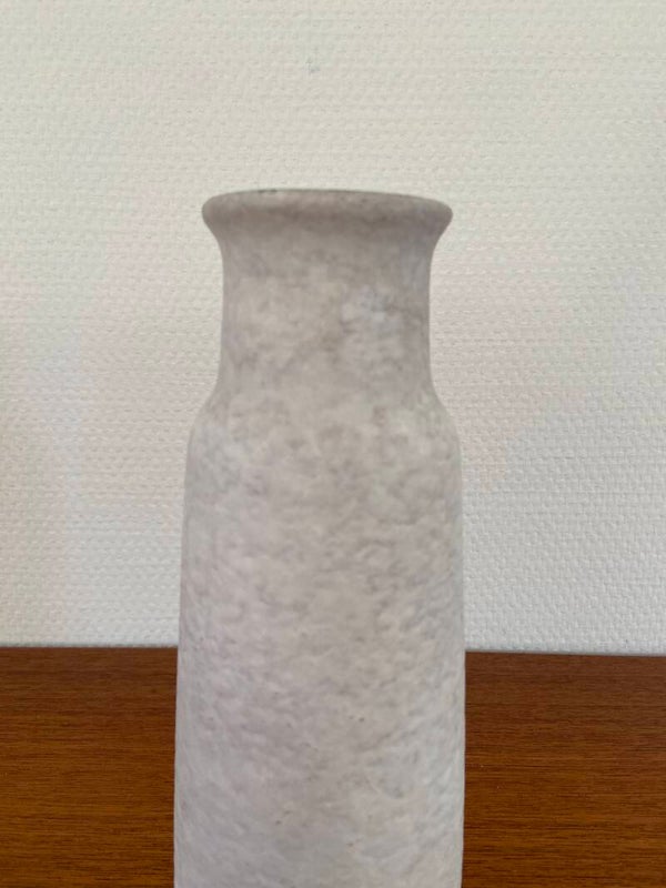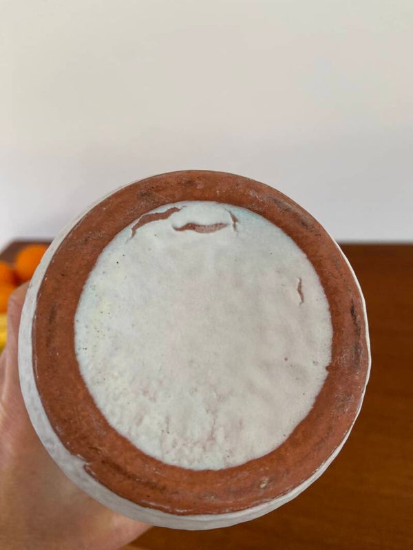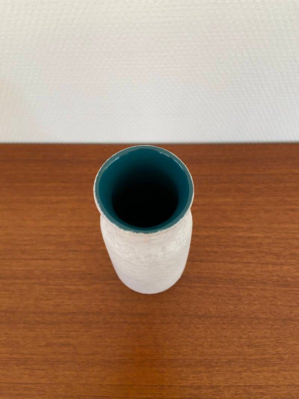 Bijzonder vaasje van Tonnieshof, West Germany. De vaas is uitgevoerd in wit 'gewolkt' aardewerk met een turquoise geglazuurde binnenkant.