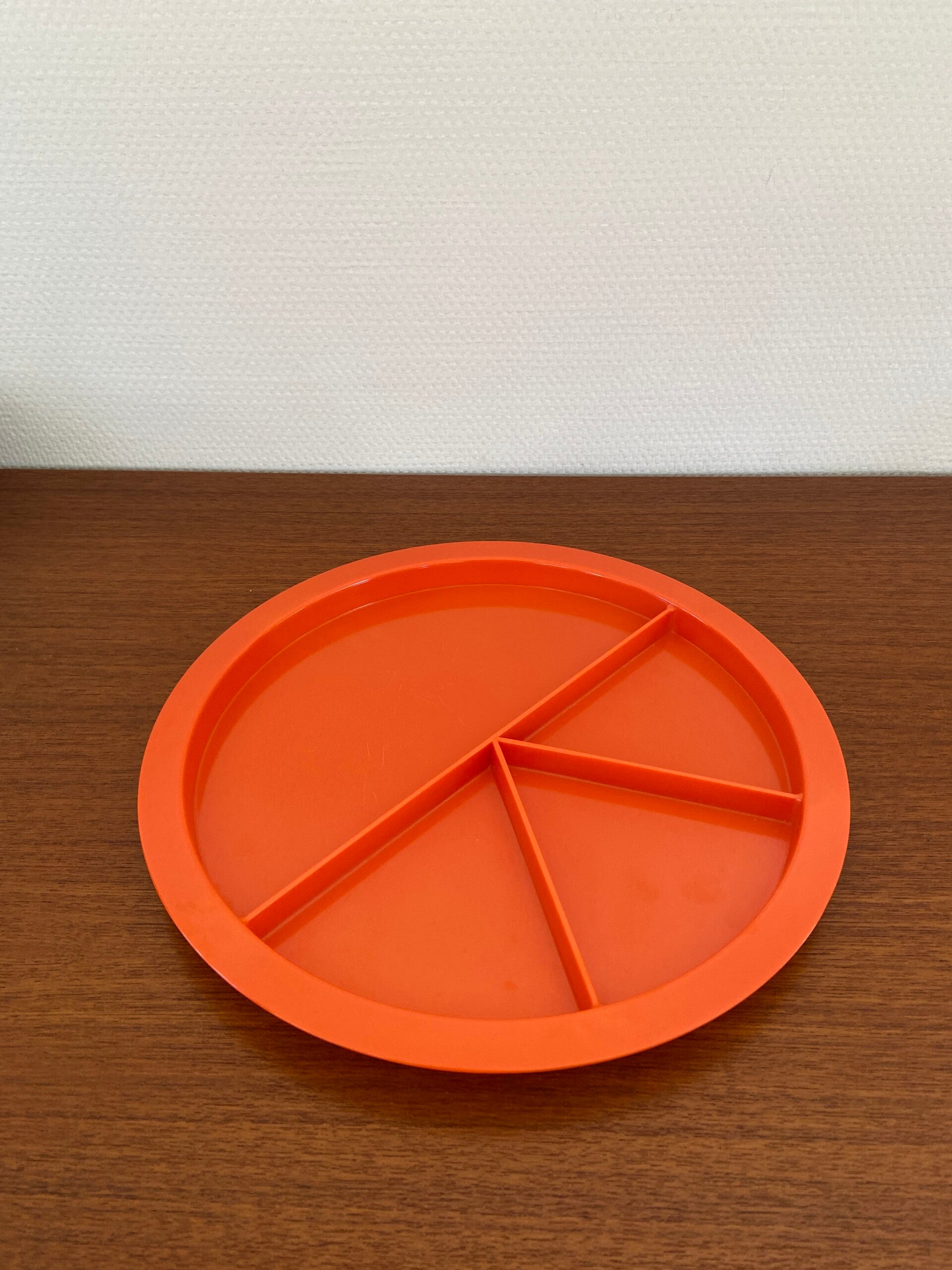 Vrolijke schaal met vakverdeling uit de jaren '70, uitgevoerd in oranje kunststof. De schaal is in mooie staat met wat krasjes in het materiaal, passend bij de leeftijd.