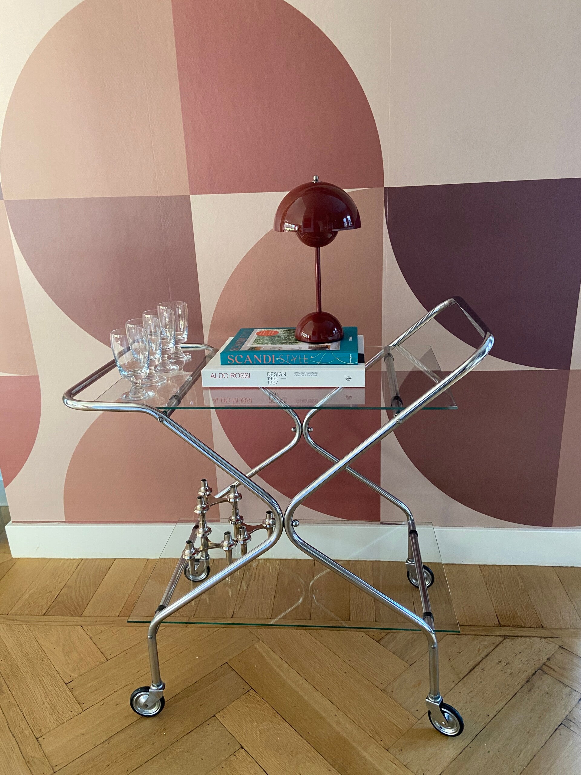 Mooi gevormde vintage serveerwagen met een chroom en 1 glasplaat. De onderste glasplaat is helaas gesneuveld in de winkel (op de foto's nog aanwezig) De wagen verkeert in mooie staat. De prijs is aangepast i.v.m. ontbreken onderste glasplaat.