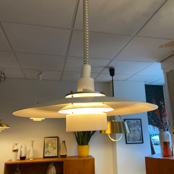 Deze Zweedse schalenlamp van Markslojd is uit gevoerd in wit metaal met een trekpendel, dus de hoogte is handig te regelen. De lamp verkeert in mooi staat.
