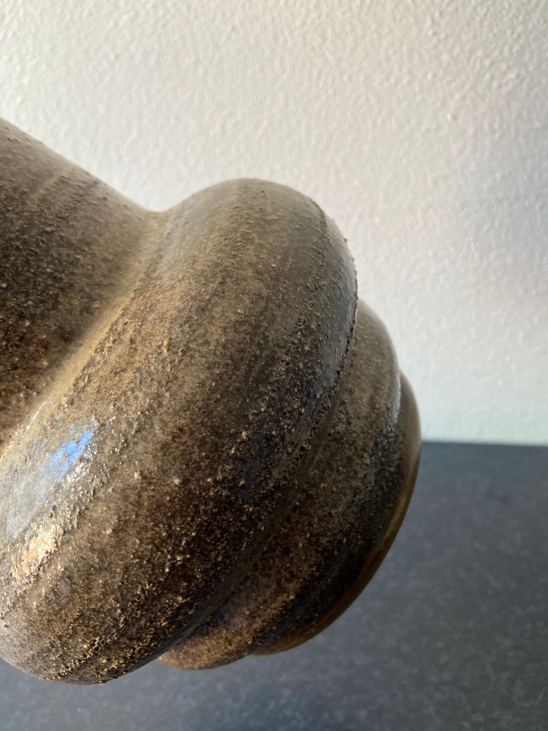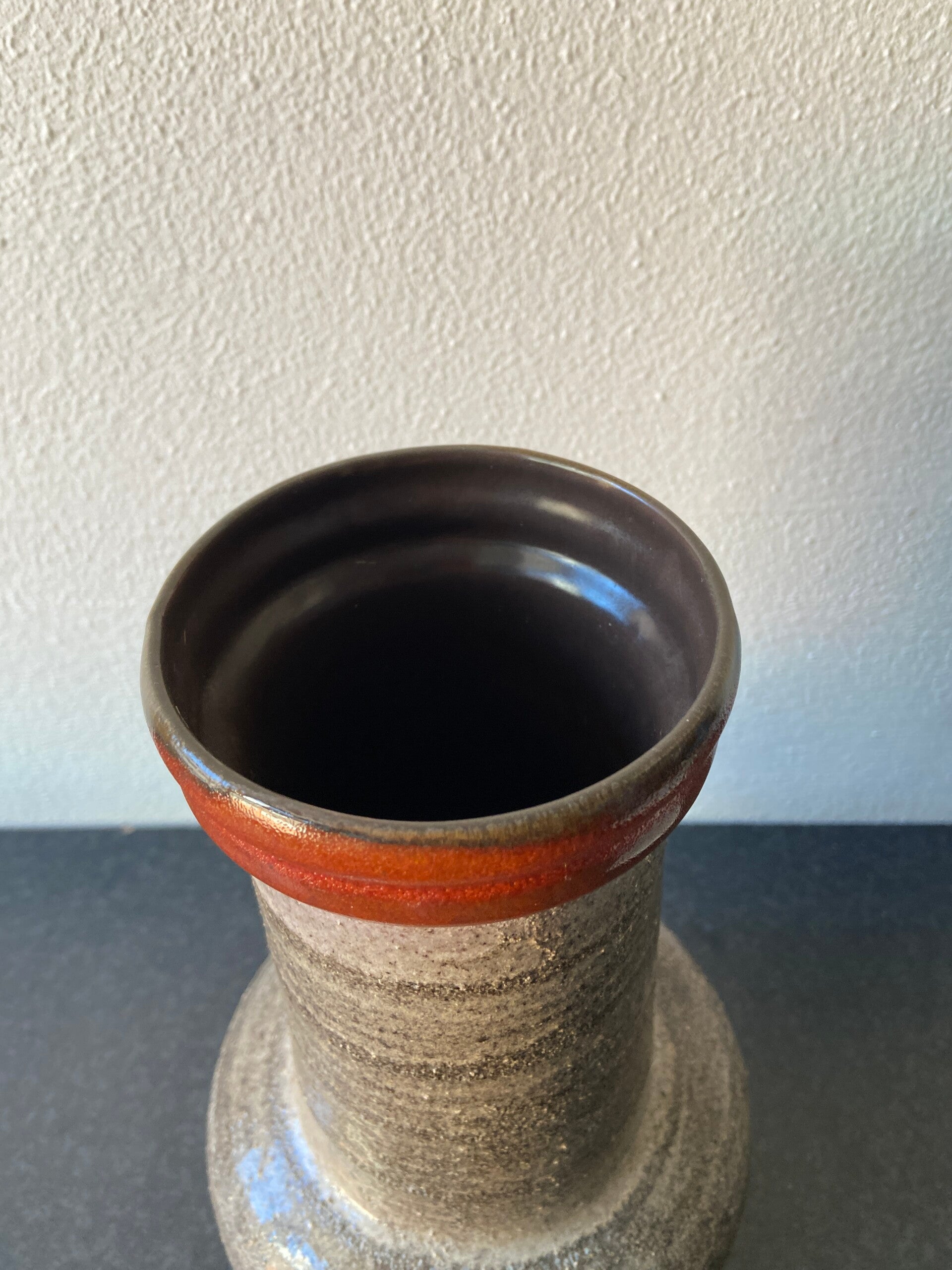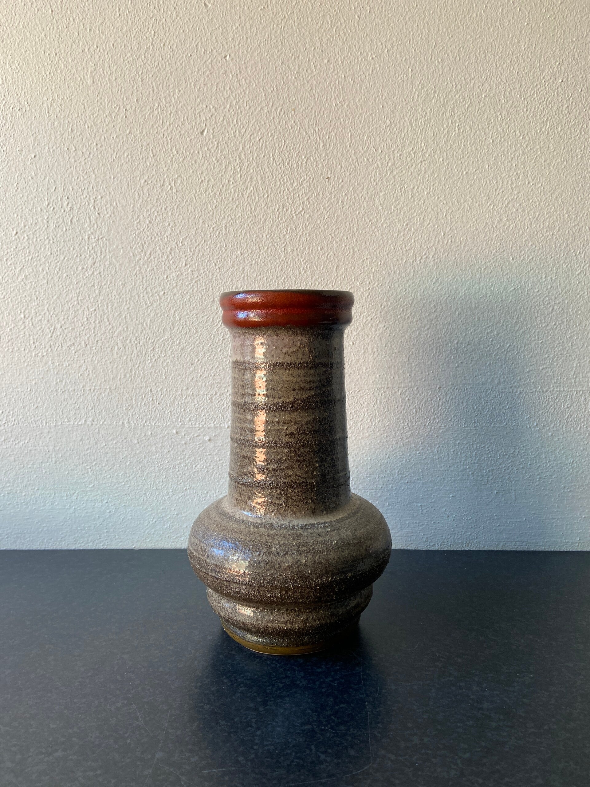 Stoere East Germany vaas in bruin/zandtinten met decoratieve oranje rand. De binnenkant is bruin geglazuurd. De vaas verkeert in goede staat en is gemerkt en genummerd 1418.