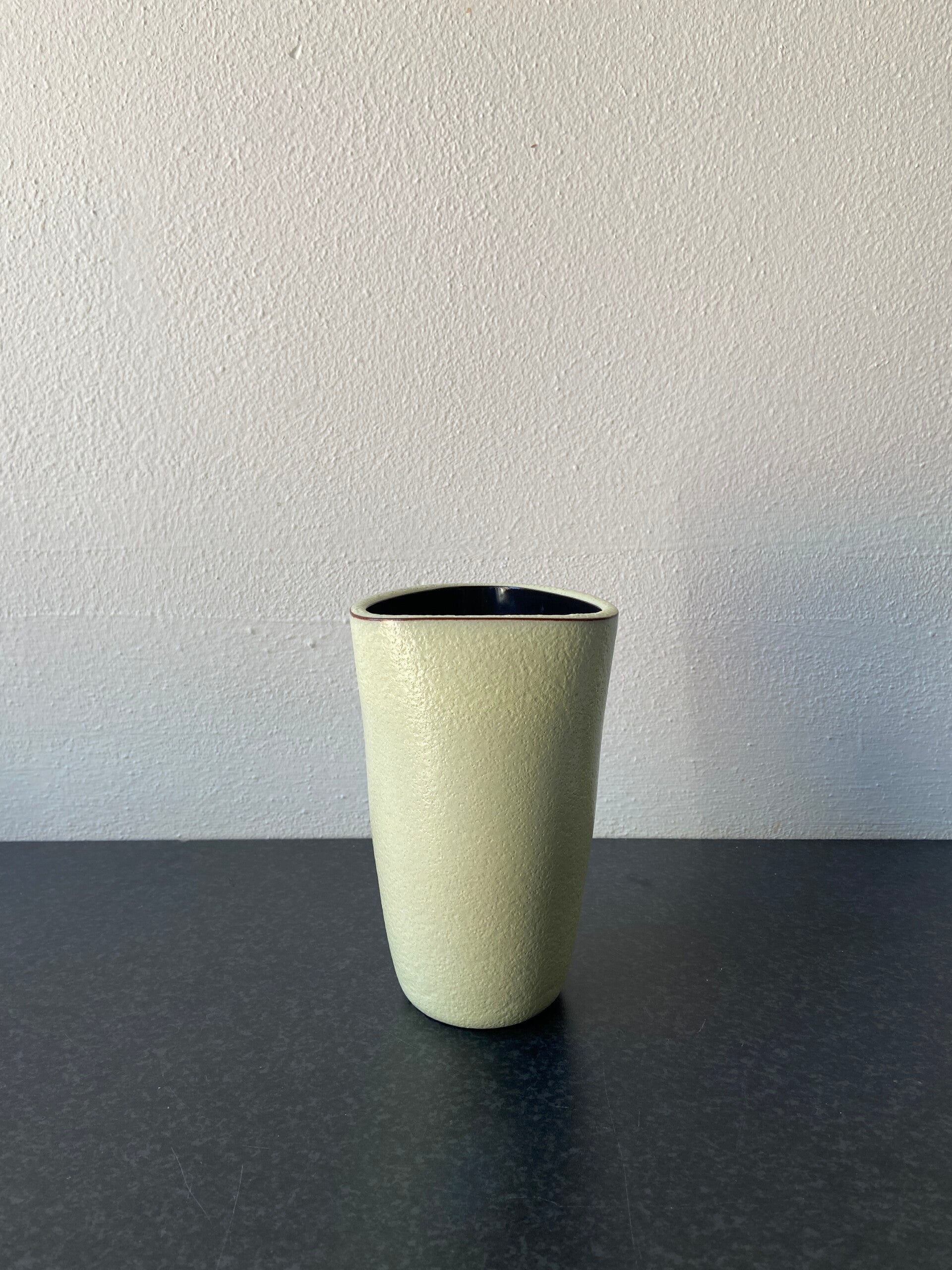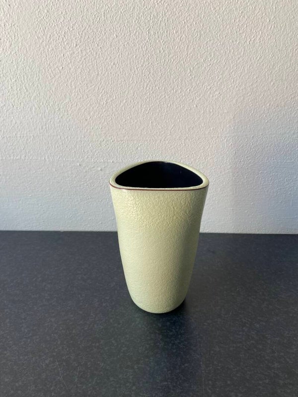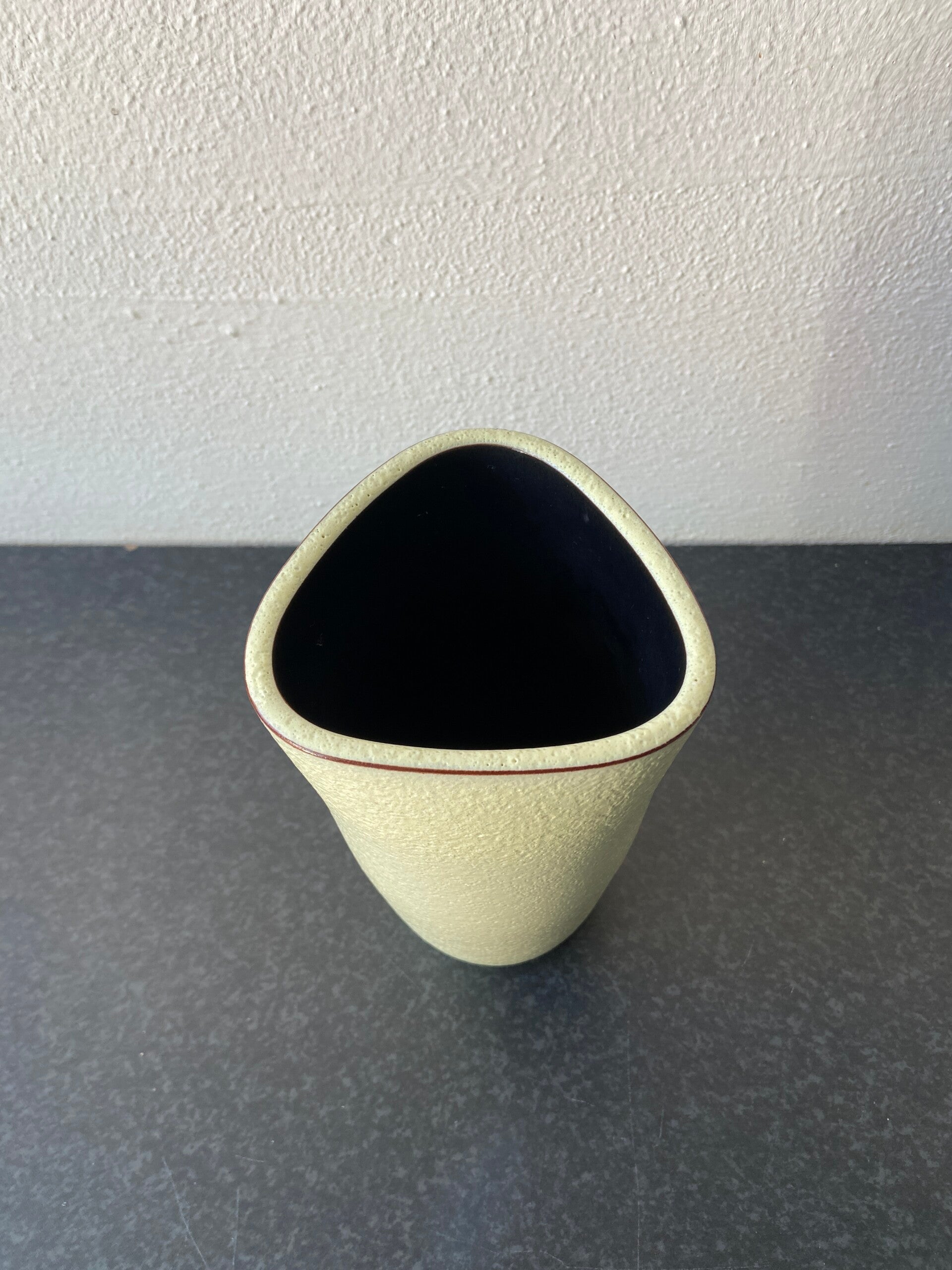 Dit bijzondere Dutch Design driehoekvaasje is in 1955 ontworpen door Jaap Ravelli. De vaas is gemaakt van geel aardewerk met een donkerbruine binnenzijde. De staat is goed.