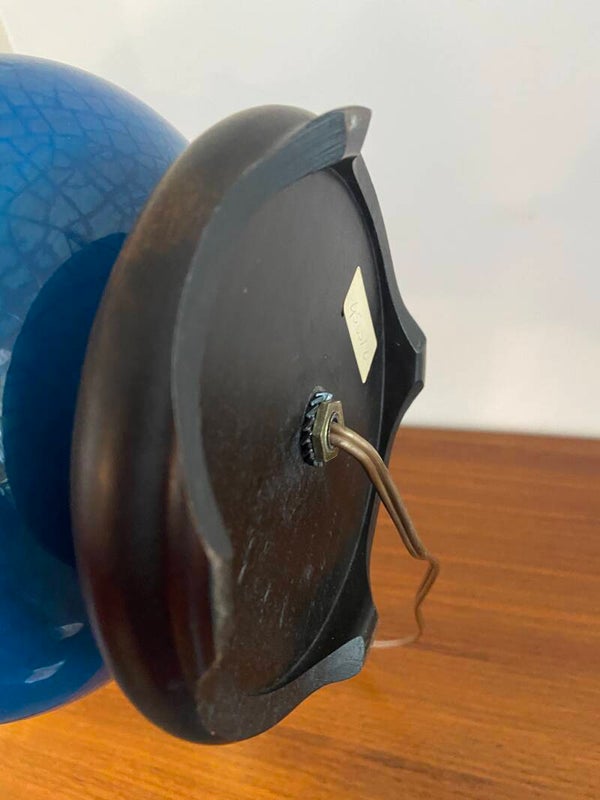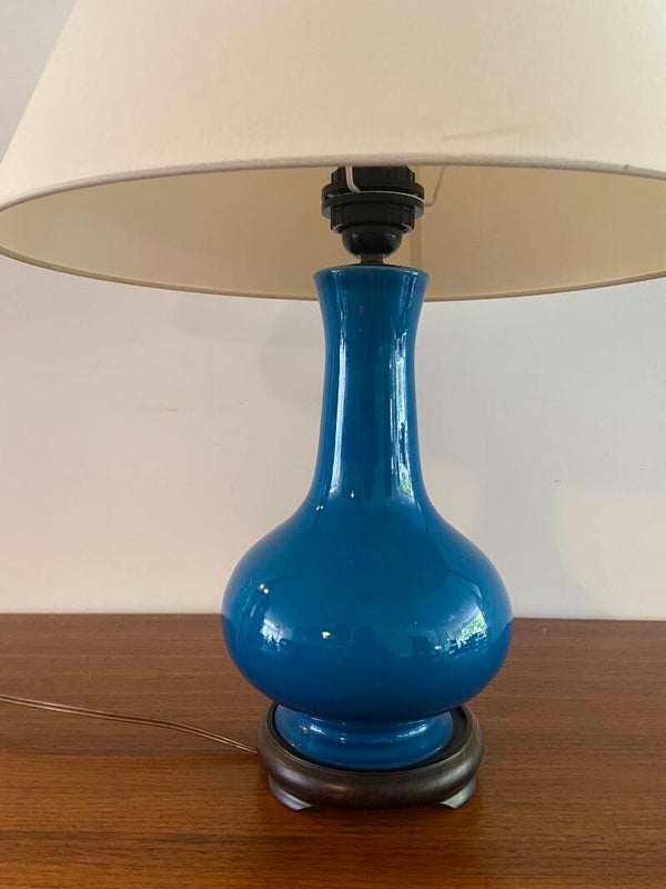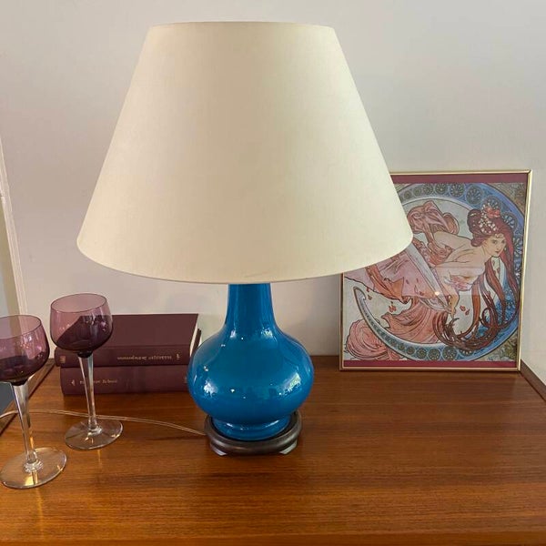 Bijzondere Franse tafellamp met een prachtige blauwe voet van keramiek. Momenteel zit er een ecrukleurige kap op de lamp maar deze kan eventueel gemakkelijk vervangen worden door een exemplaar. De lamp werkt goed en de conditie van de voet is zeer goed. De kap is in nette staat; gebruikt maar geen defecten.