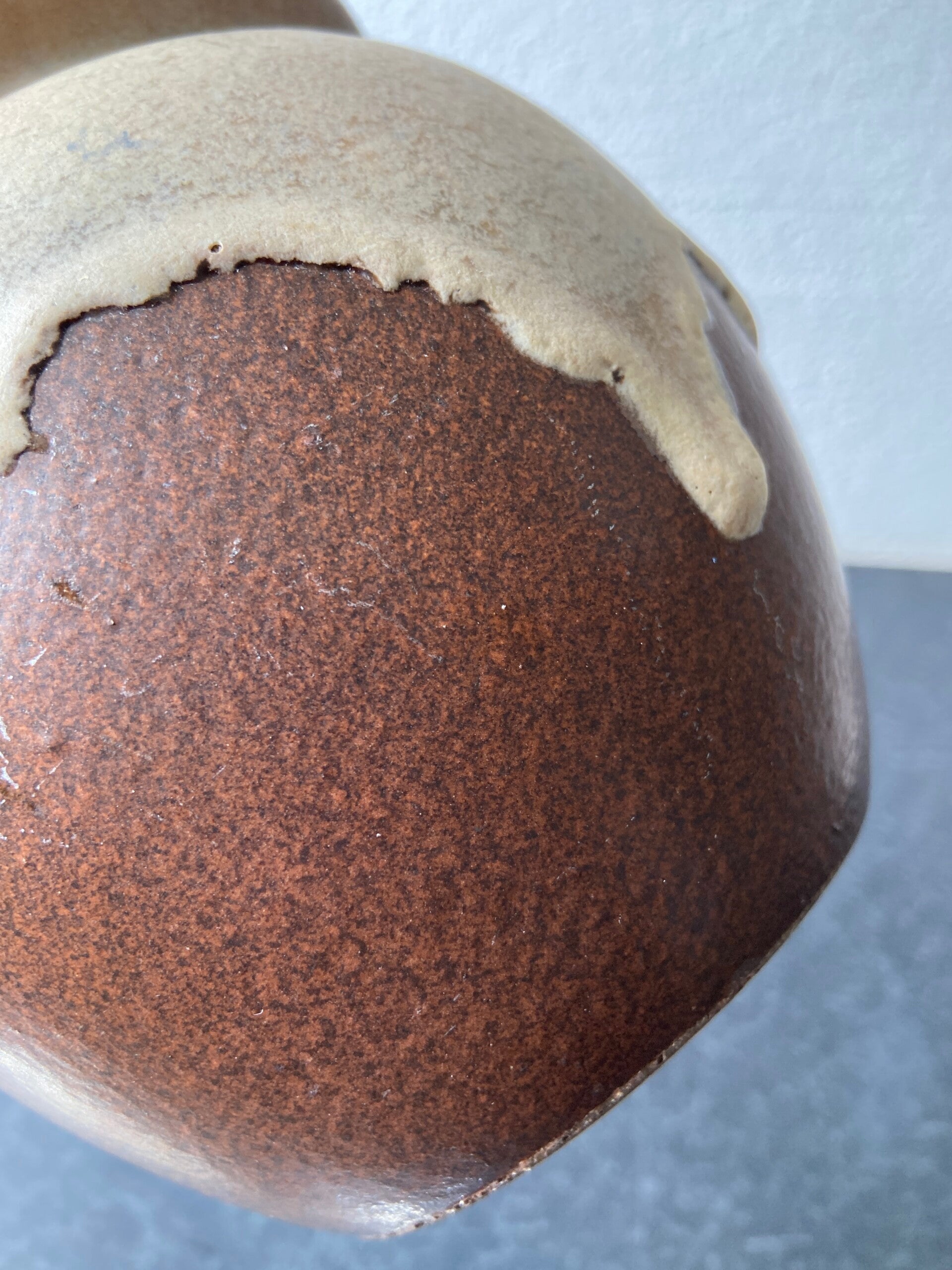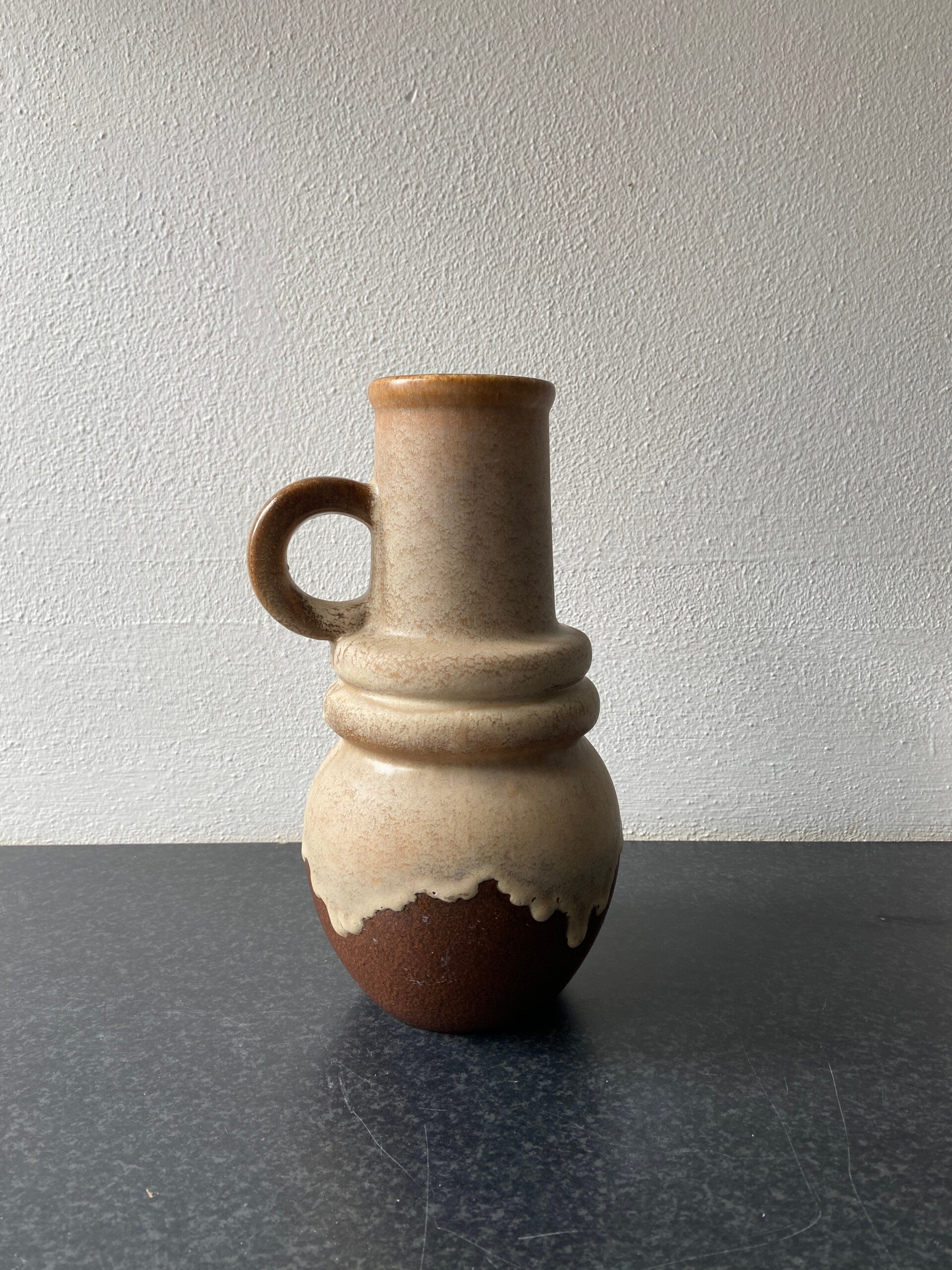 West Germany vaas uitgevoerd in bruin en beige aardewerk met beige fat lava accenten. De binnenzijde is bruin geglazuurd. De conditie is goed.