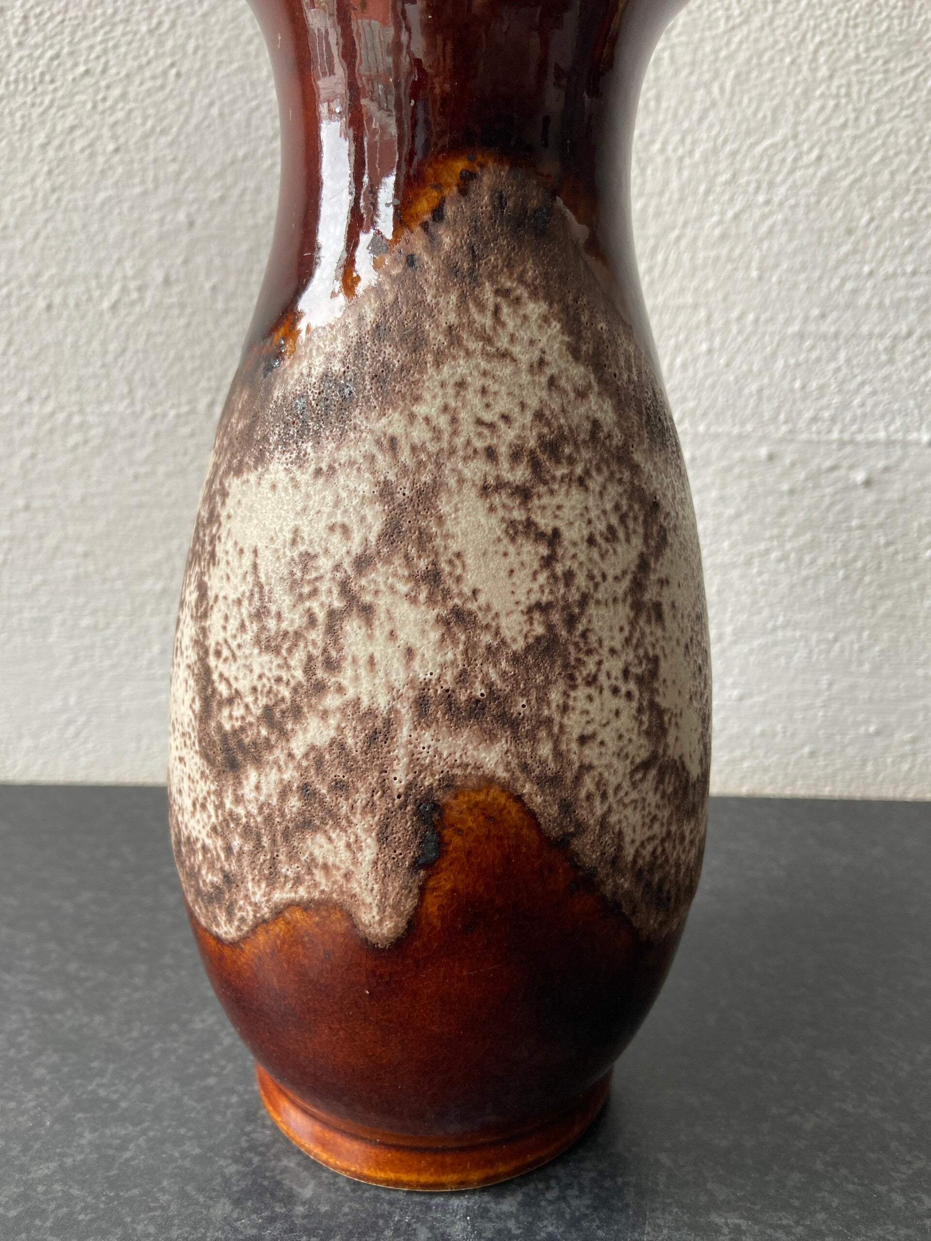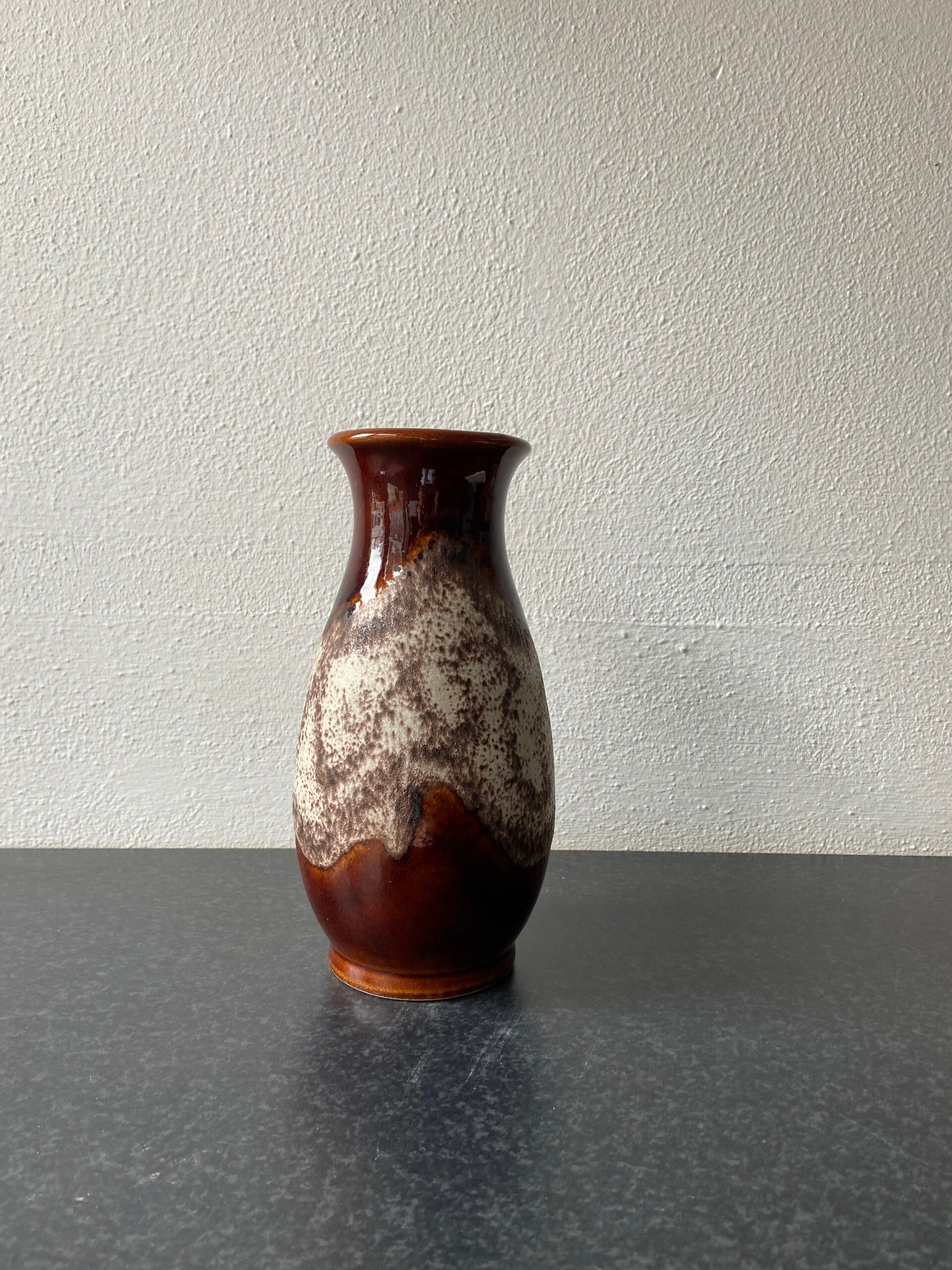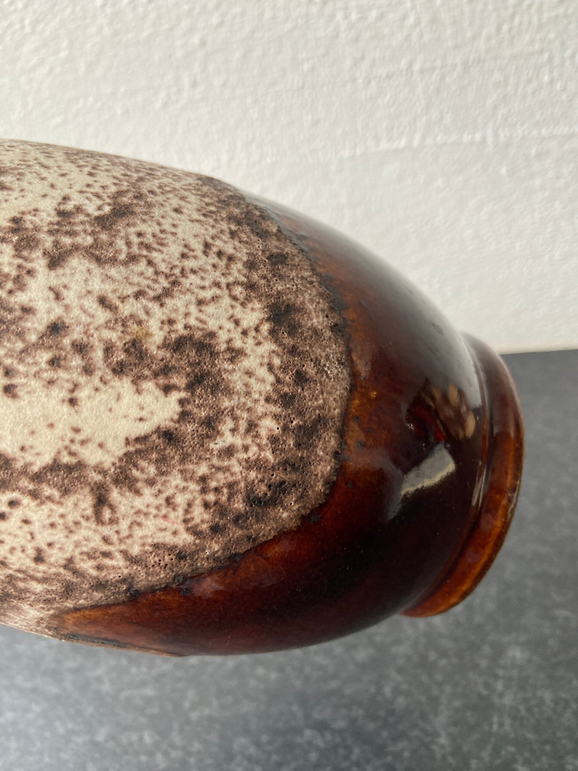 West Germany vaas in bruin en cremekleurig keramiek met donkere fat lava accenten.