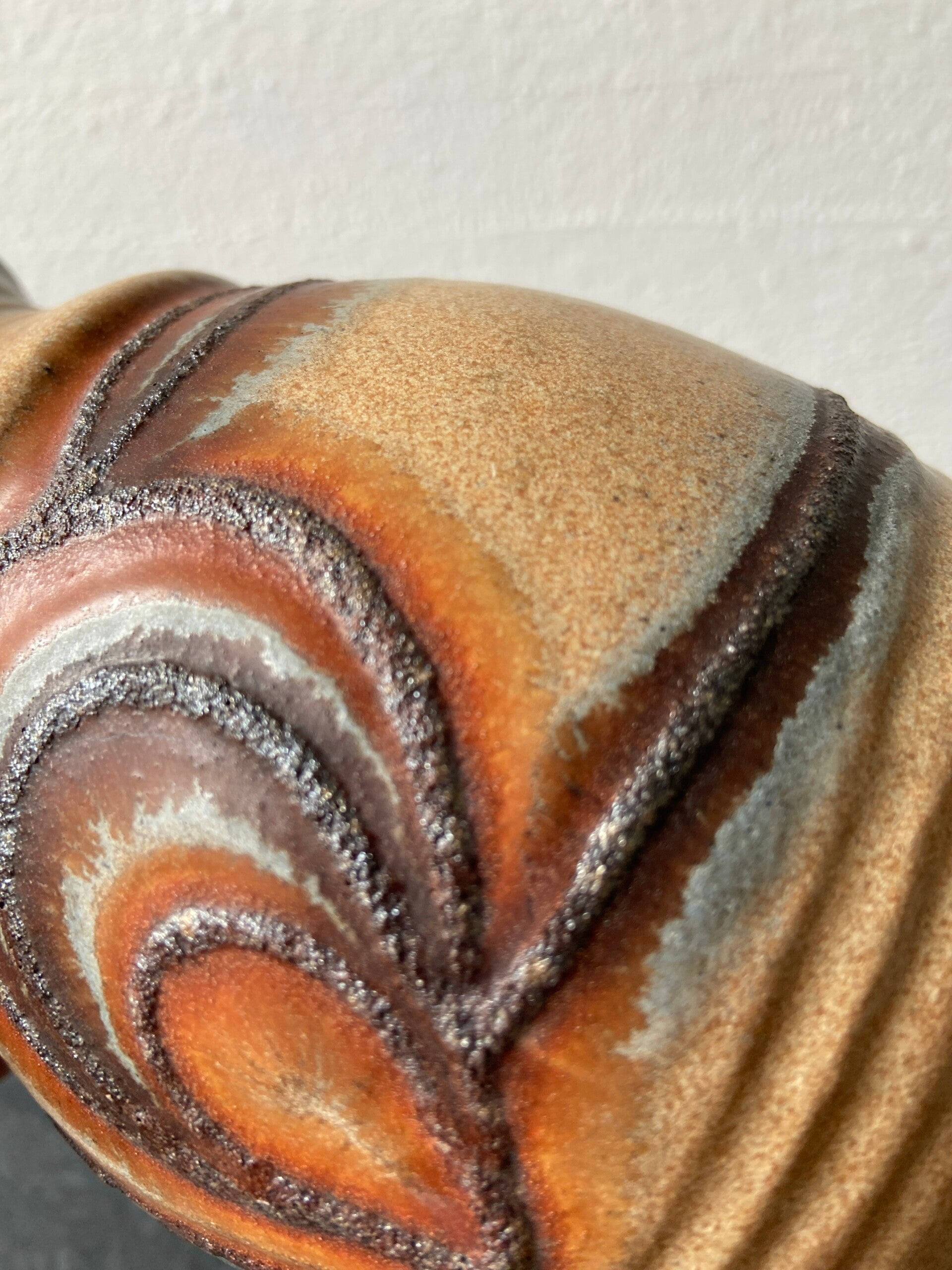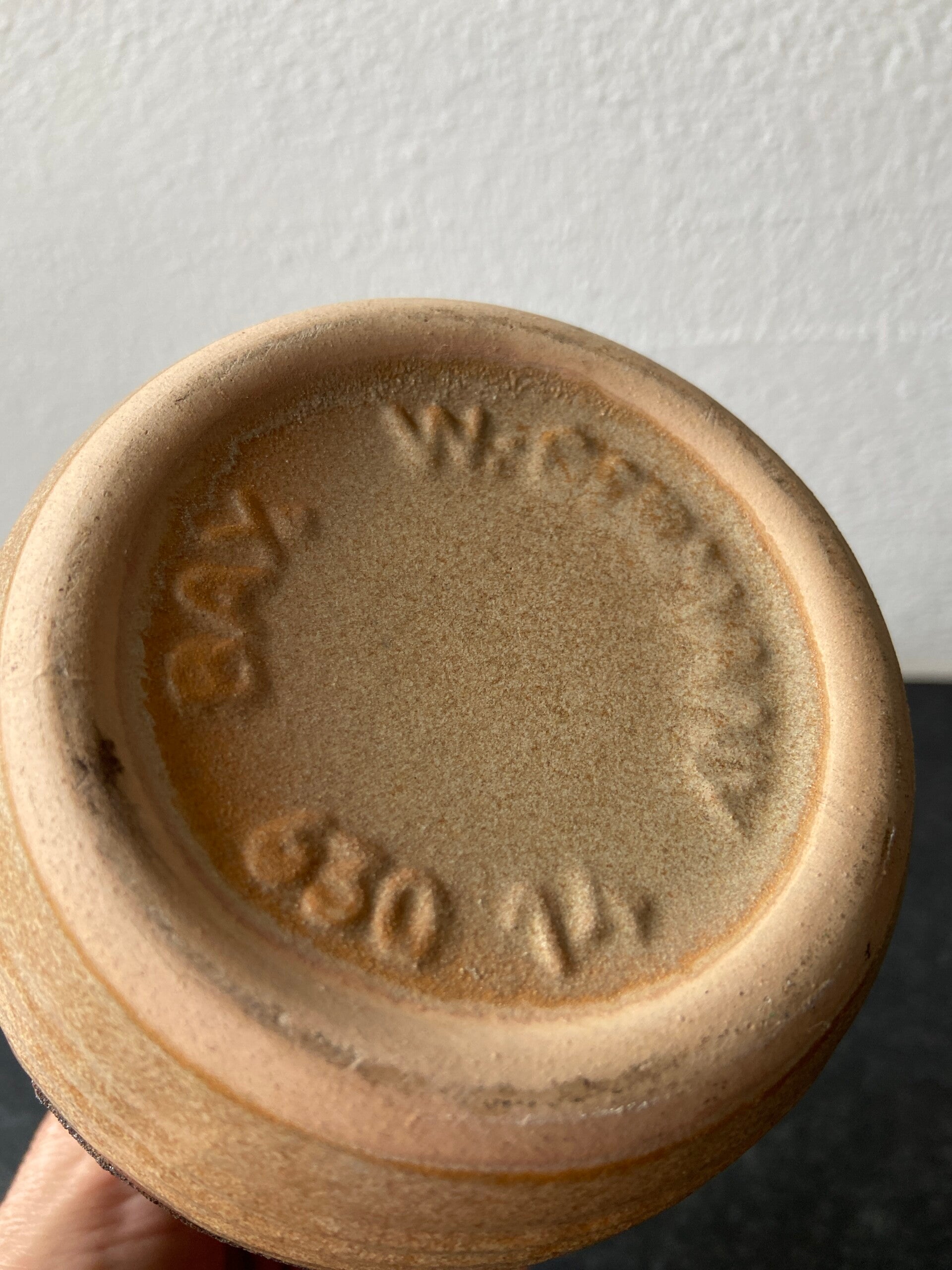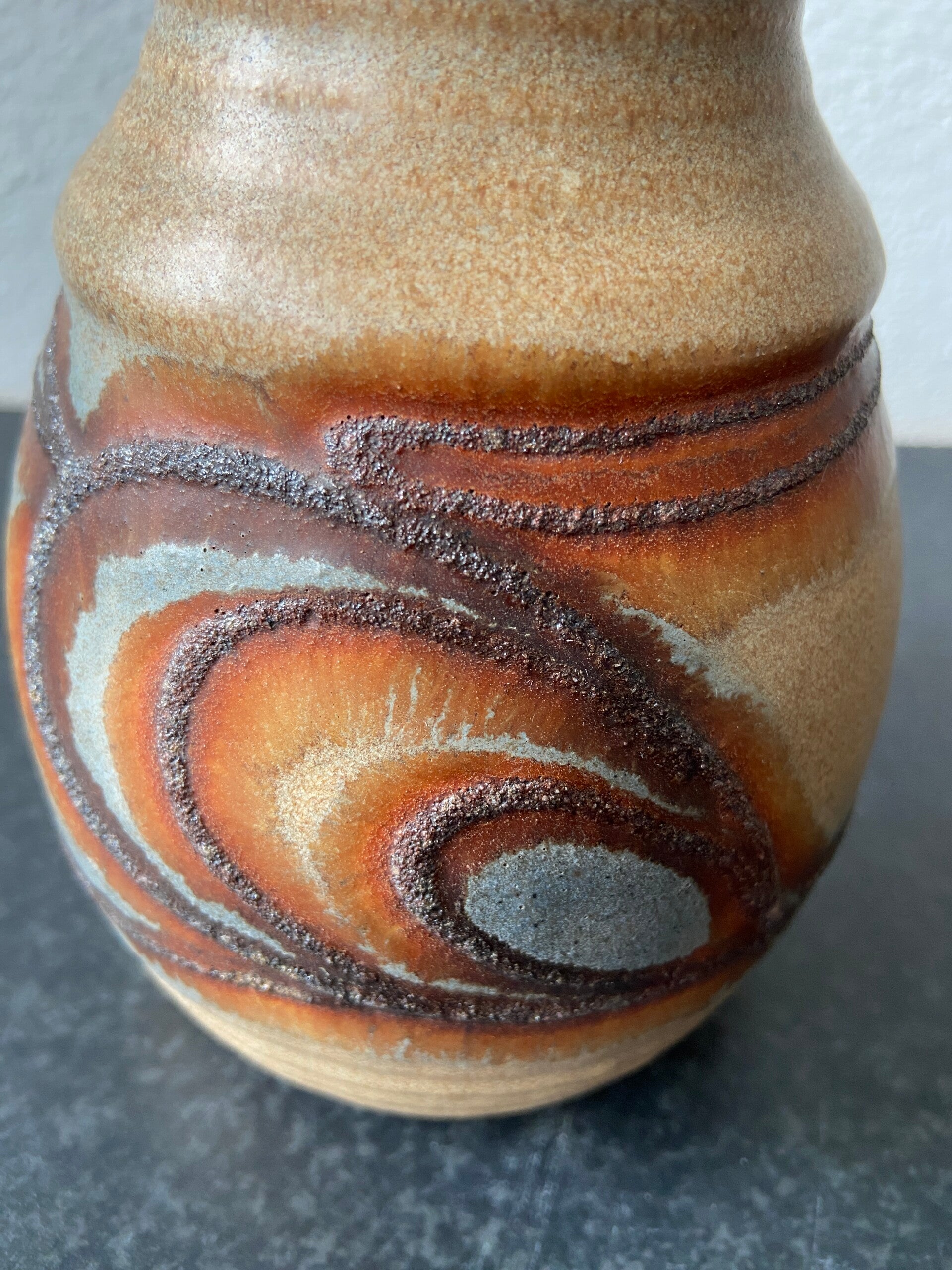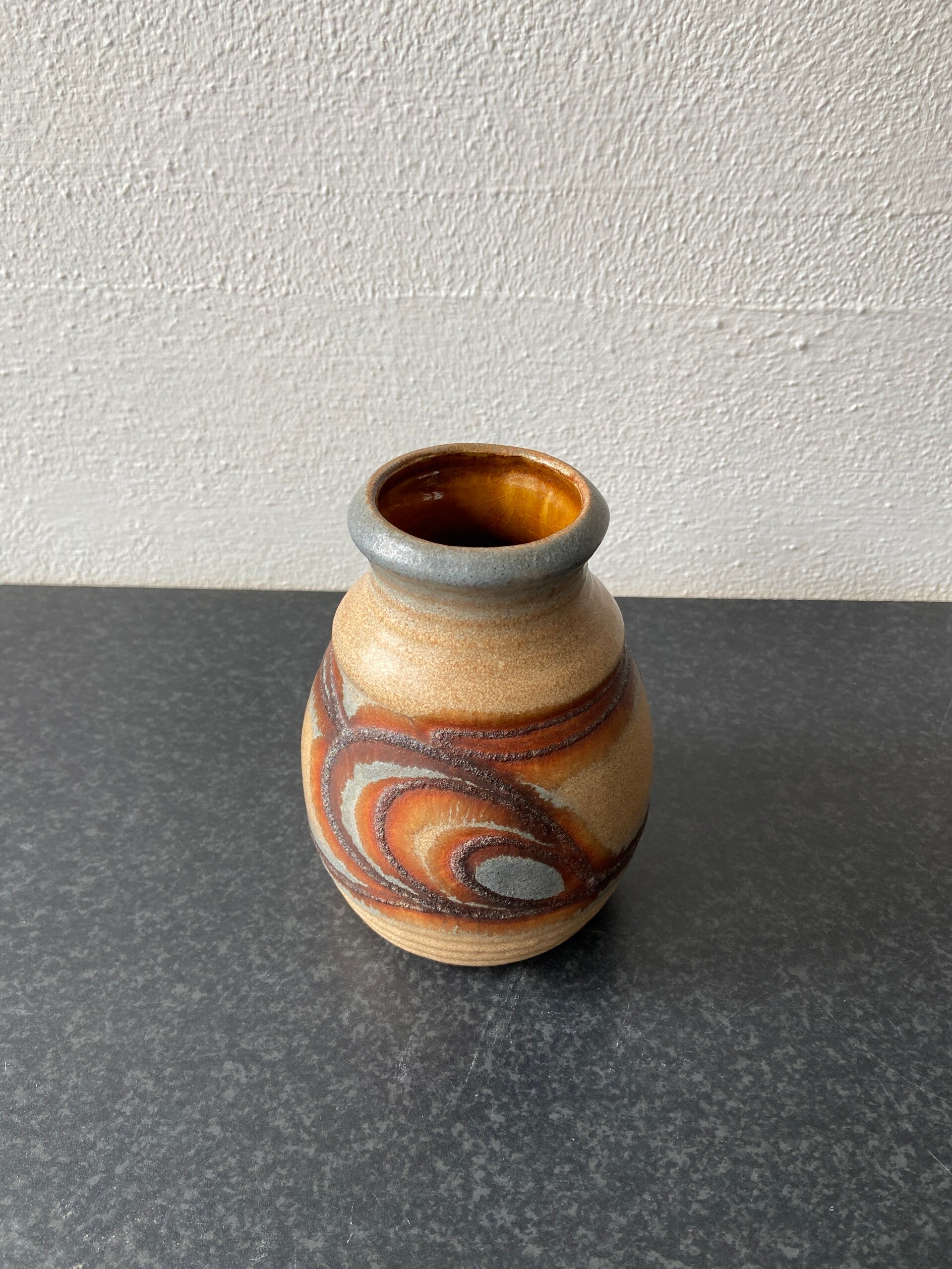Bijzonder sierlijk vaasje van Bay Keramik, uitgevoerd in zandkleurig keramike met decoratieve figuren in caramel en grijsblauwe tinten. De binnenkant is amberkleurig geglazuurd. Er is ook een grotere variant beschikbaar; leuk als set!