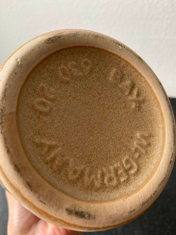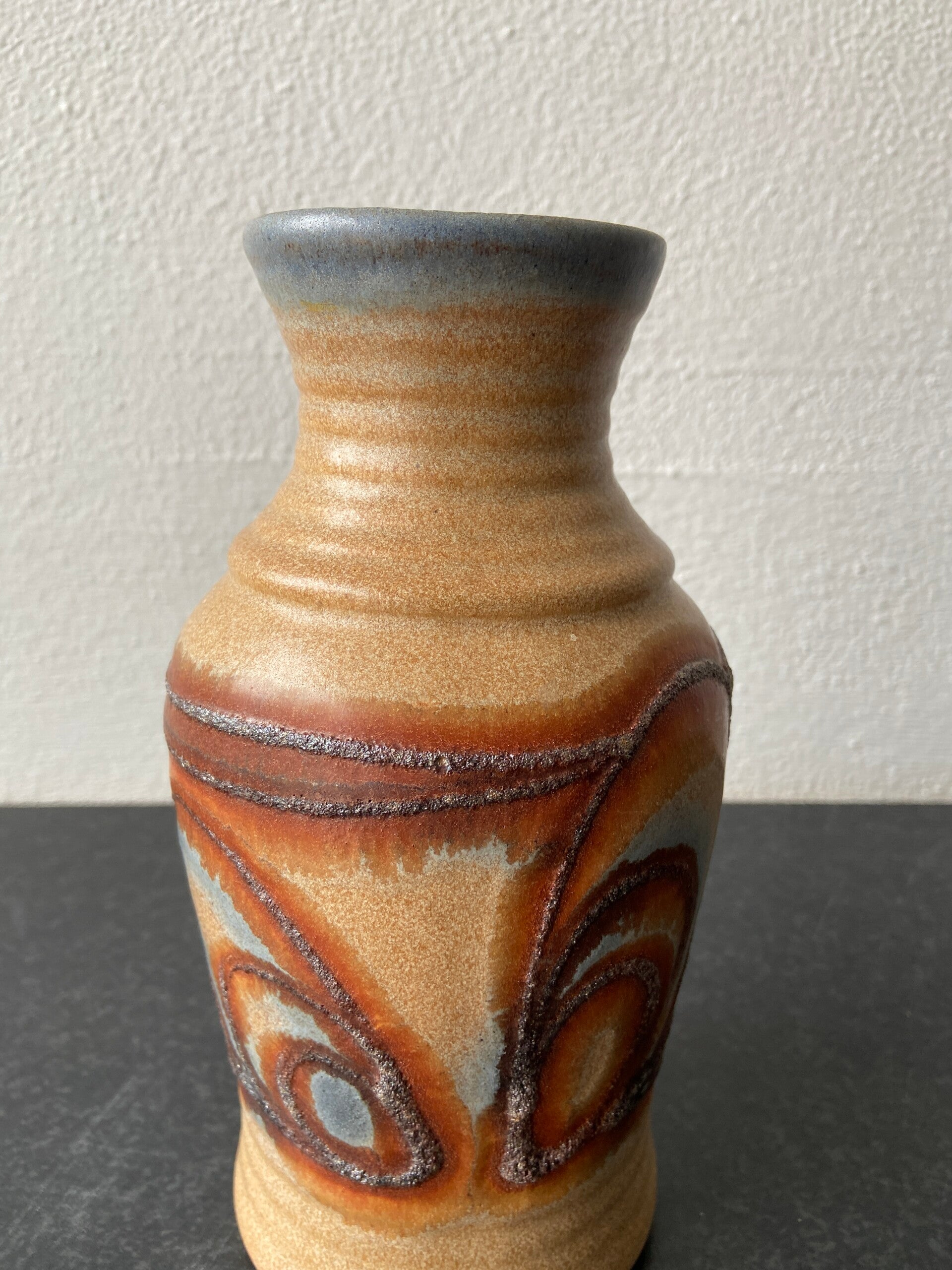 Bijzonder sierlijk vaasje van Bay Keramik, uitgevoerd in zandkleurig keramike met decoratieve figuren in caramel en grijsblauwe tinten. De binnenkant is amberkleurig geglazuurd. Er is ook een kleinere variant beschikbaar; leuk als set!